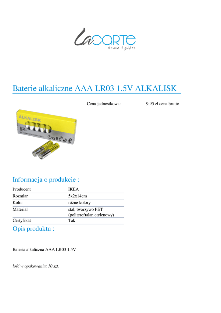 Baterie alkaliczne AAA LR03 1.5V ALKALISK Cena jednostkowa: Informacja o produkcie : Producent Rozmiar Kolor Material Certyfikat IKEA 5x2x14cm różne kolory stal, tworzywo PET (politereftalan etylenowy) Tak Opis produktu : Bateria alkaliczna AAA LR03 1.5V lość w opakowaniu: 10 szt. 9,95 zł cena brutto Baterię można użyć do wszystkich rodzajów urządzeń elektronicznych. Powered by TCPDF (www.tcpdf.org)