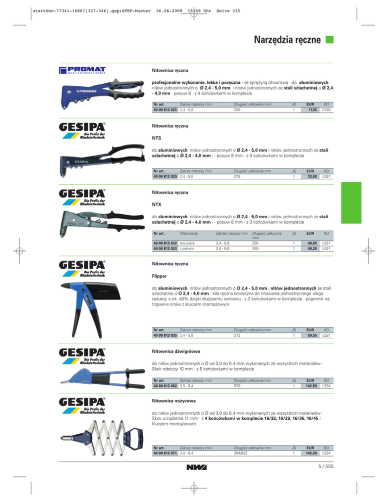startDoc-77341-16807[327-346].qxp:STEP-Muster 26.06.2009 15:58 Uhr Seite 335 Narzędzia ręczne Nitownica ręczna profesjonalne wykonanie, lekka i poręczna · ze sprężyną otworową · do aluminiowych nitów jednostronnych o Ø 2,4 - 5,0 mm i nitów jednostronnych ze stali szlachetnej o Ø 2,4 - 4,0 mm · posuw 8 · z 4 końcówkami w komplecie Nr art. Zakres roboczy mm 40 00 813 025 2,4 - 5,0 Długość całkowita mm 255 JS 1 EUR 17,35 KO C592 Nitownica ręczna NTS do aluminiowych nitów jednostronnych o Ø 2,4 - 5,0 mm i nitów jednostronnych ze stali szlachetnej o Ø 2,4 - 4,0 mm · · posuw 8 mm · z 4 końcówkami w komplecie Nr art. Zakres roboczy mm 40 00 813 030 2,4 - 5,0 Długość całkowita mm 275 JS 1 EUR 33,60 KO L521 Nitownica ręczna NTX do aluminiowych nitów jednostronnych o Ø 2,4 - 5,0 mm i nitów jednostronnych ze stali szlachetnej o Ø 2,4 - 4,0 mm · · posuw 8 mm · z 3 końcówkami w komplecie Nr art. Wykonanie 40 00 813 032 bez pióra 40 00 813 033 z piórem Zakres roboczy mm 2,4 - 5,0 2,4 - 5,0 Długość całkowita mm 260 260 JS 1 1 EUR 49,65 49,20 KO L521 L521 Nitownica ręczna Flipper do aluminiowych nitów jednostronnych o O 2,4 - 5,0 mm i nitów jednostronnych ze stali szlachetnej o O 2,4 - 4,0 mm · siła ręczna konieczna do nitowania jednostronnego ulega redukcji o ok. 40% dzięki dłuższemu ramieniu · z 3 końcówkami w komplecie · pojemnik na trzpienie nitów z kluczem montażowym Nr art. Zakres roboczy mm 40 00 813 035 2,4 - 5,0 Długość całkowita mm 212 JS 1 EUR 59,55 KO L521 Nitownica dźwigniowa do nitów jednostronnych o Ø od 3,0 do 6,4 mm wykonanych ze wszystkich materiałów · Skok roboczy 10 mm · z 5 końcówkami w komplecie Nr art. Zakres roboczy mm 40 00 813 062 3,0 - 6,4 Długość całkowita mm 570 JS 1 EUR 142,50 KO L524 Nitownica nożycowa do nitów jednostronnych o Ø od 3,0 do 6,4 mm wykonanych ze wszystkich materiałów · Skok urządzenia 11 mm · z 4 końcówkami w komplecie 16/32, 16/29, 16/36, 16/45 i kluczem montażowym Nr art. Zakres roboczy mm 40 00 813 071 3,0 - 6,4 Długość całkowita mm 294/832 JS 1 EUR 142,50 KO L524 5 / 335 startDoc-77341-16807[327-346].qxp:STEP-Muster 26.06.2009 15:58 Uhr Seite 336 Narzędzia ręczne Komplet nitów jednostronnych Nietboy z nitownicą ręczną NTS (art. nr 4000813030) · z 4 końcówkami w komplecie W komplecie: 1 nitownica ręczna NTS, zakres obróbki 2,4 - 5 mm 1 szt. wiertło śrubowe ze stali szybkotnącej o Ø 4,1 mm po 100 szt. nitów jednostronnych o Ø 4 mm krótkich, długich i podkładek Całość w walizce z tworzywa sztucznego Nr art. L x S x W mm 40 00 813 050 315 x 200 x 52 Zawartość 135 części JS 1 EUR 48,85 KO L522 Komplet nitów jednostronnych z nitownicą ręczną (art. nr 4000813025) W komplecie: 1 nitownica ręczna, zakres obróbki 2,4 - 5,0 mm po 125 sztuk nitów jednostronnych aluminium/stal 3 x 6, 3 x 8, 4 x 10, 4 x 12 mm 50 szt. nitów jednostronnych aluminium/stal 5 x 14 mm po 1 szt. wierteł śrubowych ze stali szybkotnącej 3,1, 4,1 i 5,1 mm po 20 szt. podkładek o Ø wewn. 3,2 mm i 4,2 mm po 10 szt. podkładek o Ø wewn. 5,2 mm Całość w metalowym pudełku Nr art. L x S x W mm 40 00 813 048 340 x 240 x 55 Zawartość 603 części JS 1 EUR 48,70 KO C592 Komplet nitów jednostronnych Zestaw nitów Junior z nitownicą ręczną NTX (art. nr 4000813032) · z 3 końcówkami w komplecie W komplecie: 1 nitownica ręczna NTX, zakres obróbki 2,4 - 5 mm, i 5 wymiarów nitów jednostronnych o Ø 3 i 4 mm z aluminium i stali (łącznie ok. 350 szt.) 1 klucz instalatorski Całość w metalowym pudełku Nr art. L x S x W mm 40 00 813 052 275 x 145 x 40 Zawartość 352 części JS 1 EUR 90,30 KO L522 Komplet nitów jednostronnych Zestaw nitów z nitownicą ręczną NTX (art. nr 4000813032) z 3 końcówkami w komplecie W komplecie: 1 nitownica ręczna NTX, zakres obróbki 2,4 - 5 mm, i 12 wymiarów nitów jednostronnych o Ø 3 i 4 mm z różnych materiałów (łącznie ok. 950 szt.) 1 klucz instalatorski Całość w metalowym pudełku Nr art. L x S x W mm 40 00 813 054 340 x 250 x 40 5 / 336 Zawartość 942 części JS 1 EUR 111,30 KO L522 startDoc-77341-16807[327-346].qxp:STEP-Muster 26.06.2009 15:58 Uhr Seite 337 Narzędzia ręczne Nitownica akumulatorowa AccuBird® elektromechaniczna nitownica · do nitów o Ø maks. 5 mm z każdego materiału Dane techniczne: napęd: silnik prądu stałego 12 V suw pracy: 20 mm siła osadzania nitu: 8500 N ciężar: 2,2 kg (z akumulatorem) Zestaw obejmuje: 1 nitownica elektromechaniczna AccuBird® AccuBird® 1 akumulator szybkowymienny 12 V / 1,7 Ah 4 końcówki 1 szybka ładowarka (czas ładowania ok. 60 min.) Całość w metalowym pudełku Nr art. Zawartość 40 00 813 080 7 części JS 1 EUR 574,00 KO L524 Nitownica akumulatorowa PowerBird® elektromechaniczna nitownica · do nitów o Ø 4,8 mm stal, do Ø 6,4 mm z każdego materiału Dane techniczne: napęd:silnik prądu stałego 12 V suw pracy:20 mm siła osadzania nitu:13000 N ciężar:2,2 kg (z akumulatorem) Zestaw obejmuje: 1 nitownica elektromechaniczna PowerBird® 1 akumulator szybkowymienny 12 V / 2,0 Ah 4 końcówki 1 szybka ładowarka (czas ładowania ok. 60 min.) Całość w metalowym pudełku Nr art. Zawartość 40 00 813 082 7 części JS 1 EUR 756,00 KO L524 Akumulator wymienny/zapasowy do nitownic akumulatorowych AccuBird® (art. nr 4000813080) i PowerBird® (art. nr 4000813082) Nr art. Moc V/Ah 40 00 813 083 12,0/1,7 40 00 813 084 12,0/2,0 JS 1 1 EUR 90,20 97,65 KO L525 L525 5 / 337 startDoc-77341-16807[327-346].qxp:STEP-Muster 26.06.2009 15:59 Uhr Seite 338 Narzędzia ręczne Nitownica pneumatyczno-hydrauliczna PH 2 do nitowania nitów o Ø 3,0 do 5,0 mm z każdego materiału · komplet z 5 końcówkami, 1 zestaw szczęk zaciskowych, 1 zbiornik wyłapujący, 2 klucze montażowe, instrukcja konserwacji z listą części zamiennych Dane techniczne: suw pracy: 15 mm siła osadzania nitu: 7375 N ciśnienie robocze: 5 bar złącze węża: Ø 6 mm (1/4") zu