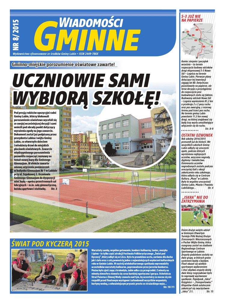 NR 8/ 2015 Gminne Wiadomości S-3 JUŻ NIE NA PAPIERZE Wydawnictwo sfinansowane ze środków Gminy Lubin • ISSN 2449-786X Gminno-miejskie porozumienie oświatowe zawarte! UCZNIOWIE SAMI WYBIORĄ SZKOŁĘ! Pod presją rodziców opozycyjni radni Gminy Lubin, którzy blokowali porozumienie oświatowe wycofali się ze swojej wcześniejszej decyzji i sami wnieśli pod obrady punkt dotyczący wyrażenia zgody na jego zawarcie. Dokument został już podpisany przez prezydenta Lubina i wójta Gminy Lubin, co otworzyło dzieciom i młodzieży drzwi do miejskich placówek oświatowych. Zawarcie międzygminnego porozumienia pozwoliło rozpocząć rozmowy na temat nowej bazy dla Gminnego Gimnazjum. W efekcie zawarto umowę użyczenia pomieszczeń w budynku Gimnazjum Nr 1 w Lubinie przy ul. Szpakowej 2. Uczniowie Gminnego Gimnazjum do dyspozycji mieć będą – oprócz przestronnych sal lekcyjnych – m.in. salę gimnastyczną, boiska sportowe i stołówkę. Str. 3 Koniec sierpnia i początek września – to termin rozpoczęcia budowy odcinków drogi ekspresowej S-3 Nowa Sól – Legnica na terenie Gminy Lubin. Pierwsze plany dotyczące tej inwestycji sięgają lat 80. Dotychczas pozostawały na papierze, ale teraz decyzja o przystąpieniu do rozpoczęcia prac budowlanych stała się faktem. Budowany odcinek Nowa Sól – Legnica wyniesienie 81,2 km o przekroju 2 x 2 pasy ruchu oraz pas awaryjny, z rezerwą terenu pod trzeci pas ruchu. Na terenie gminy Lubin powstanie 11,3 km nowej drogi, na której znajdować się będą trzy węzły umożliwiające włączenie się do ruchu. Str. 8-9 OSTATNI DZWONEK Rok szkolny 2014/2015 przeszedł już do historii. We wszystkich szkołach Gminy Lubin odbyły się uroczyste apele, podczas których wyróżniono najlepszych uczniów, wręczono nagrody, dyplomy i świadectwa. Osiemnastu uczniów nagrodzonych zostało podczas uroczystej Gali z okazji zakończenia roku szkolnego, która odbyła się w Centrum Kultury „Muza” w Lubinie. Była to wspólna uroczystość Gminy Lubin, Miasta i Powiatu Lubińskiego. . Str. 4 „ISKRA” NIE DO ZATRZYMANIA ŚWIAT POD KYCZERĄ 2015 Warsztaty samby, wspólne gotowanie, konkurs kulinarny, taniec, muzyka i śpiew - to tylko część atrakcji Festiwalu Folklorystycznego „Świat pod Kyczerą”, który odbył się w Liścu. Była to prawdziwa uczta, zarówno dla ducha jak i ciała oraz z całą pewnością jedno z najważniejszych wydarzeń kulturalnych roku w Gminie Lubin. W nastrój wielokulturowego spotkania wprowadziły uczestników warsztaty kulinarne, poprowadzone przez jurorów konkursu. Można było zjeść zupę z krokodyla, żabie udka czy przegrzebki. Z minuty na minutę atmosfera stawała się coraz bardziej egzotyczna i gorąca. Ochotnicza Straż Pożarna z Zimnej Wody czuwała nad tym, by uczestnicy za mocno się nie rozpalili przed finałowym występem i zafundowali wszystkim wspaniałą kurtynę wodną, a odważniejszym prysznic prosto ze strażackiego węża… Str. 10 i 11 Osiem drużyn wzięło udział w Gminnym Otwartym Turnieju Piłki Nożnej Drużyn Zrzeszonych i Niezrzeszonych o Puchar Wójta Gminy, który rozegrany został na stadionie Regionalnego Centrum Sportowego w Lubinie. Zespoły podzielone zostały na dwie grupy, w których grano systemem każdy z każdym. Finał okazał się wielkim sportowym wydarzeniem i choć obydwa zespoły dzielą dwie klasy rozgrywkowe było to naprawdę wyrównane spotkanie. Pojedynek „Iskra” Księginice – „Transportowiec” Kłopotów-Osiek ostatecznie zakończył się zwycięstwem „Iskry” 2:1. Str. 15 ² WYDARZENIA Przysłowia na SIERPIEŃ Jeśli w sierpniu dni jasne, będą stodoły ciasne. *** Kiedy sierpień przychodzi, reszta zboża z pola schodzi. *** Czego sierpień nie dowarzy, tego wrzesień nie doparzy. *** Gdy w dni sierpnia spieka wszędzie, tedy długa zima będzie. *** W pierwszym tygodniu pogoda stała, będzie zima długa, biała. *** Początki sierpnia pogodne, wróżą zimy łagodne. *** Jak po lipcu sierpień się ochłodzi, to później zima twarda z wielkim śniegiem chodzi. *** W sierpniu grzmotów wiele, mokrą zimę ściele. *** Kiedy sierpień wrzos rozwija, jesień krótka, szybko mija. *** Gdy w sierpniu z północy dmucha, nastaje zwykle posucha. *** Ostatni sierpnia zapowiada, jaka pogoda na październik wypada. Wydawca: TVL Spółka z o.o. REGON: 390240242, NIP: 6920004028, Redaktor Naczelny: Katarzyna Szatkowska Zespół redakcyjny: Agnieszka Kanclerz, Maja Grohman, Anna Ickiewicz Redakcja: ul. Tysiąclecia 2, 59 – 300 Lubin, tel. (076) 847 86 78, e-mail: [email protected], Druk: „Polskapresse” Wrocław, nakład 5.000 egz. Pożar Dzięki szybkiej interwencji strażaków udało się uniknąć tragedii… w Składowicach Zdarzenie wyglądało naprawdę groźnie. Unoszący się dym widać było w promieniu kilku kilometrów. Na szczęście – dzięki czujności sąsiadów i szybkiej interwencji strażaków – skończyło się na strachu i obyło się bez większych strat. Pożar wybuchł w pomieszczeniu gospodarczym jednego z zabudowań w Składowicach. Prawdopodobną jego przyczyną było zaprószenie ognia. W ciągu kilkunastu minut na miejscu pojawiły się dwie jednostki Państwowej Straży Pożarnej, chwilę później także strażacy z OSP. Dzięki ich sprawnej akcji ogień udało się szybko opanować. Szopa, która doszczętnie spłonęła znajdowała się w bliskim sąsiedztwie zabudowań mieszkalnych i zaledwie kilka metrów od pasieki, ale płomienie nie dotarły ani do uli, ani pobliskich domostw. - Gratuluję strażakom sprawnie przeprowadzonej akcji, bo przy tak niskiej wilgotność i wysokiej temperaturze ogień mógł wyrządzić dużo więcej strat – mówi Tadeusz Kielan, Wójt Gminy Lubin, który był na miejscu zdarzenia. Szef gminnego samorządu zadeklarował pomoc właścicielowi posesji, bo spalona szopa była zapleczem prowadzonej przez niego pasieki. (MG) Zmiany w wakacyjnym rozkładzie jazdy a