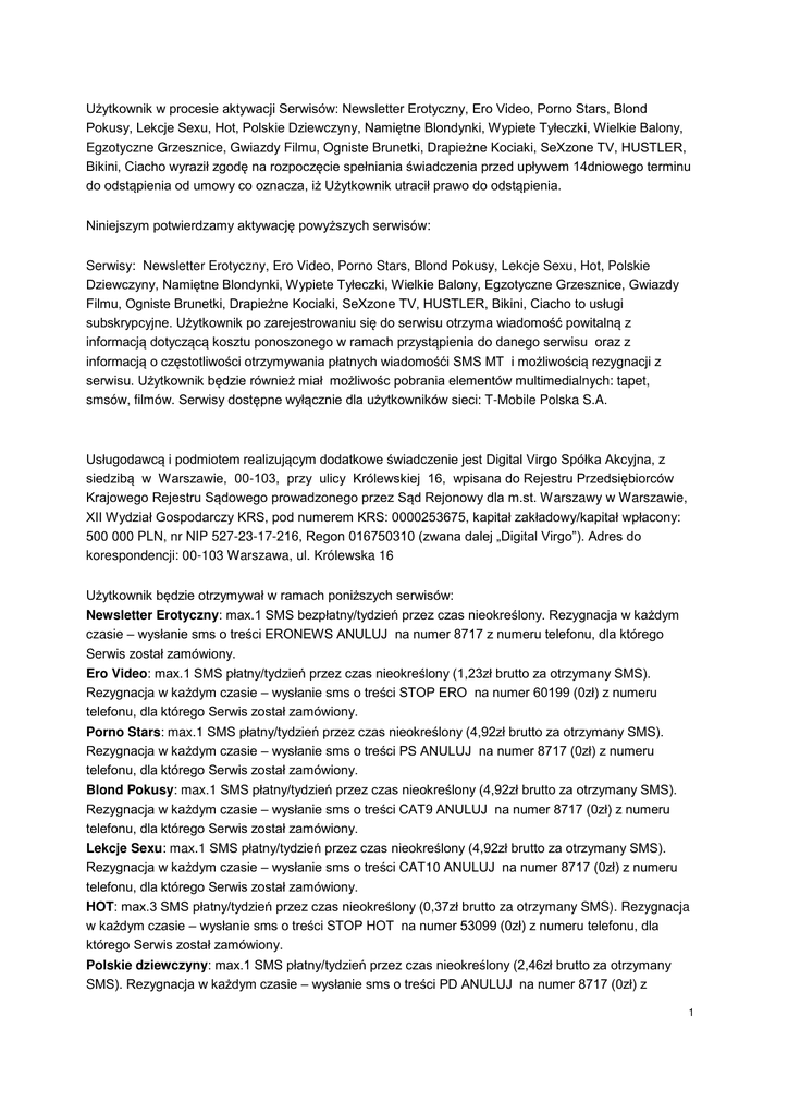 U ytkownik w procesie aktywacji Serwisów: Newsletter źrotyczny, źro Video, Porno Stars, Blond Pokusy, Lekcje Sexu, Hot, Polskie Dziewczyny, Namiętne Blondynki, Wypiete Tyłeczki, Wielkie Balony, Egzotyczne Grzesznice, Gwiazdy Filmu, Ogniste Brunetki, Drapie ne Kociaki, SeXzone TV, HUSTLźR, Bikini, Ciacho wyraził zgodę na rozpoczęcie spełniania świadczenia przed upływem 14dniowego terminu do odstąpienia od umowy co oznacza, i U ytkownik utracił prawo do odstąpienia. Niniejszym potwierdzamy aktywację powy szych serwisów: Serwisy: Newsletter Erotyczny, Ero Video, Porno Stars, Blond Pokusy, Lekcje Sexu, Hot, Polskie Dziewczyny, Namiętne Blondynki, Wypiete Tyłeczki, Wielkie Balony, źgzotyczne żrzesznice, żwiazdy Żilmu, Ogniste Brunetki, Drapie ne Kociaki, SeXzone TV, HUSTLźR, Bikini, Ciacho to usługi subskrypcyjne. U ytkownik po zarejestrowaniu się do serwisu otrzyma wiadomość powitalną z informacją dotyczącą kosztu ponoszonego w ramach przystąpienia do danego serwisu oraz z informacją o częstotliwości otrzymywania płatnych wiadomośći SMS MT i mo liwością rezygnacji z serwisu. U ytkownik będzie równie miał mo liwośc pobrania elementów multimedialnych: tapet, smsów, filmów. Serwisy dostępne wyłącznie dla u ytkowników sieci: T-Mobile Polska S.A. Usługodawcą i podmiotem realizującym dodatkowe świadczenie jest Digital Virgo Spółka Akcyjna, z siedzibą w Warszawie, 00-103, przy ulicy Królewskiej 16, wpisana do Rejestru Przedsiębiorców Krajowego Rejestru Sądowego prowadzonego przez Sąd Rejonowy dla m.st. Warszawy w Warszawie, XII Wydział żospodarczy KRS, pod numerem KRS: 0000253675, kapitał zakładowy/kapitał wpłacony: 500 000 PLN, nr NIP 527-23-17-216, Regon 016750310 (zwana dalej „Digital Virgo”). Adres do korespondencji: 00-103 Warszawa, ul. Królewska 16 U ytkownik będzie otrzymywał w ramach poni szych serwisów: Newsletter Erotyczny: max.1 SMS bezpłatny/tydzień przez czas nieokreślony. Rezygnacja w ka dym czasie – wysłanie sms o treści źRONźWS ANULUJ na numer 8717 z numeru telefonu, dla którego Serwis został zamówiony. Ero Video: max.1 SMS płatny/tydzień przez czas nieokreślony (1,23zł brutto za otrzymany SMS). Rezygnacja w ka dym czasie – wysłanie sms o treści STOP źRO na numer 60199 (0zł) z numeru telefonu, dla którego Serwis został zamówiony. Porno Stars: max.1 SMS płatny/tydzień przez czas nieokreślony (4,92zł brutto za otrzymany SMS). Rezygnacja w ka dym czasie – wysłanie sms o treści PS ANULUJ na numer 8717 (0zł) z numeru telefonu, dla którego Serwis został zamówiony. Blond Pokusy: max.1 SMS płatny/tydzień przez czas nieokreślony (4,92zł brutto za otrzymany SMS). Rezygnacja w ka dym czasie – wysłanie sms o treści CAT9 ANULUJ na numer 8717 (0zł) z numeru telefonu, dla którego Serwis został zamówiony. Lekcje Sexu: max.1 SMS płatny/tydzień przez czas nieokreślony (4,92zł brutto za otrzymany SMS). Rezygnacja w ka dym czasie – wysłanie sms o treści CAT10 ANULUJ na numer 8717 (0zł) z numeru telefonu, dla którego Serwis został zamówiony. HOT: max.3 SMS płatny/tydzień przez czas nieokreślony (0,37zł brutto za otrzymany SMS). Rezygnacja w ka dym czasie – wysłanie sms o treści STOP HOT na numer 53099 (0zł) z numeru telefonu, dla którego Serwis został zamówiony. Polskie dziewczyny: max.1 SMS płatny/tydzień przez czas nieokreślony (2,46zł brutto za otrzymany SMS). Rezygnacja w ka dym czasie – wysłanie sms o treści PD ANULUJ na numer 8717 (0zł) z 1 numeru telefonu, dla którego Serwis został zamówiony. Namiętne Blondynki max.1 SMS płatny/tydzień przez czas nieokreślony (2,46zł brutto za otrzymany SMS). Rezygnacja w ka dym czasie – wysłanie sms o treści CAT1 ANULUJ na numer 8717 (0zł) z numeru telefonu, dla którego Serwis został zamówiony. Blond Pokusy: max.4 SMS płatny/tydzień przez czas nieokreślony (4,92zł brutto za otrzymany SMS). Rezygnacja w ka dym czasie – wysłanie sms o treści CAT9 ANULUJ na numer 8717 (0zł) z numeru telefonu, dla którego Serwis został zamówiony. Wypięte Tyłeczki: max.1 SMS płatny/tydzień przez czas nieokreślony (4,92zł brutto za otrzymany SMS). Rezygnacja w ka dym czasie – wysłanie sms o treści CAT3 ANULUJ na numer 8717 (0zł) z numeru telefonu, dla którego Serwis został zamówiony. Wielkie Balony: max.1 SMS płatny/tydzień przez czas nieokreślony (2,46zł brutto za otrzymany SMS). Rezygnacja w ka dym czasie – wysłanie sms o treści CAT4 ANULUJ na numer 8717 (0zł) z numeru telefonu, dla którego Serwis został zamówiony. Egzotyczne Grzesznice: max.1 SMS płatny/tydzień przez czas nieokreślony (2,46zł brutto za otrzymany SMS). Rezygnacja w ka dym czasie – wysłanie sms o treści CAT5 ANULUJ na numer 8717 (0zł) z numeru telefonu, dla którego Serwis został zamówiony. Gwiazdy Filmu max.1 SMS płatny/tydzień przez czas nieokreślony (2,46zł brutto za otrzymany SMS). Rezygnacja w ka dym czasie – wysłanie sms o treści CAT6 ANULUJ na numer 8717 (0zł) z numeru telefonu, dla którego Serwis został zamówiony. Ogniste Brunetki: max.1 SMS płatny/tydzień przez czas nieokreślony (2,46zł brutto za otrzymany SMS). Rezygnacja w ka dym czasie – wysłanie sms o treści CAT8 ANULUJ na numer 8717 (0zł) z numeru telefonu, dla którego Serwis został zamówiony. Drapieżne Kociaki: max.1 SMS płatny/tydzień przez czas nieokreślony (2,46zł brutto za otrzymany SMS). Rezygnacja w ka dym czasie – wysłanie sms o treści CAT7 ANULUJ na numer 8717 (0zł) z numeru telefonu, dla którego Serwis został zamówiony. SexZone TV: max.4 SMS płatny/tydzień przez czas nieokreślony (3,69zł brutto za otrzymany SMS). Rezygnacja w ka dym czasie – wysłanie sms o treści źROTV ANULUJ na numer 8717 (0zł) z numeru telefonu, dla którego Serwis został zamówiony. Hustler: max.2 SMS płatny/tydzień przez czas nieokreślony (2,46zł brutto za otrzymany SMS). Rezygnacja w ka dym czasie 