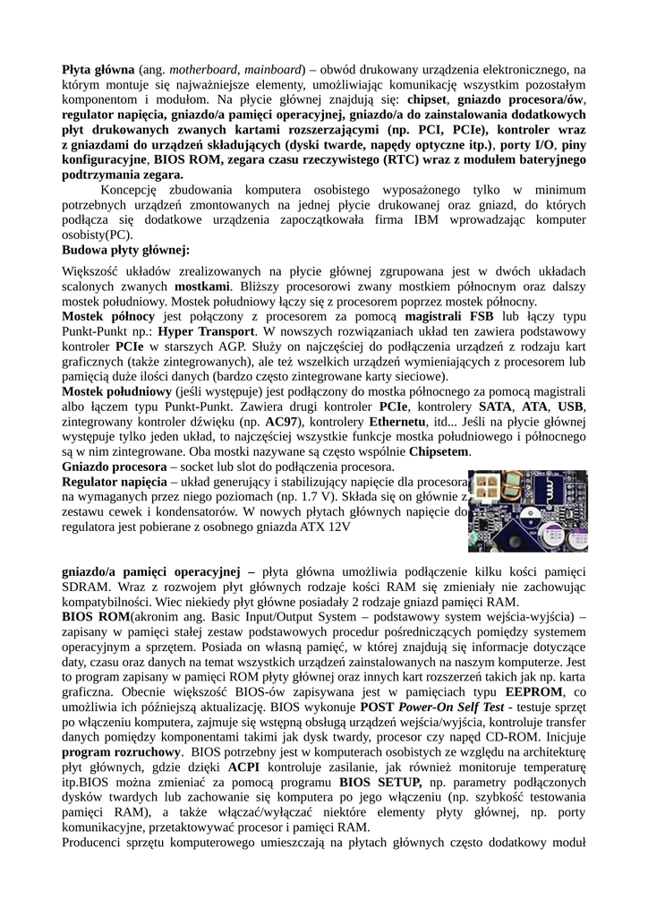 Płyta główna (ang. motherboard, mainboard) – obwód drukowany urządzenia elektronicznego, na którym montuje się najważniejsze elementy, umożliwiając komunikację wszystkim pozostałym komponentom i modułom. Na płycie głównej znajdują się: chipset, gniazdo procesora/ów, regulator napięcia, gniazdo/a pamięci operacyjnej, gniazdo/a do zainstalowania dodatkowych płyt drukowanych zwanych kartami rozszerzającymi (np. PCI, PCIe), kontroler wraz z gniazdami do urządzeń składujących (dyski twarde, napędy optyczne itp.), porty I/O, piny konfiguracyjne, BIOS ROM, zegara czasu rzeczywistego (RTC) wraz z modułem bateryjnego podtrzymania zegara. Koncepcję zbudowania komputera osobistego wyposażonego tylko w minimum potrzebnych urządzeń zmontowanych na jednej płycie drukowanej oraz gniazd, do których podłącza się dodatkowe urządzenia zapoczątkowała firma IBM wprowadzając komputer osobisty(PC). Budowa płyty głównej: Większość układów zrealizowanych na płycie głównej zgrupowana jest w dwóch układach scalonych zwanych mostkami. Bliższy procesorowi zwany mostkiem północnym oraz dalszy mostek południowy. Mostek południowy łączy się z procesorem poprzez mostek północny. Mostek północy jest połączony z procesorem za pomocą magistrali FSB lub łączy typu Punkt-Punkt np.: Hyper Transport. W nowszych rozwiązaniach układ ten zawiera podstawowy kontroler PCIe w starszych AGP. Służy on najczęściej do podłączenia urządzeń z rodzaju kart graficznych (także zintegrowanych), ale też wszelkich urządzeń wymieniających z procesorem lub pamięcią duże ilości danych (bardzo często zintegrowane karty sieciowe). Mostek południowy (jeśli występuje) jest podłączony do mostka północnego za pomocą magistrali albo łączem typu Punkt-Punkt. Zawiera drugi kontroler PCIe, kontrolery SATA, ATA, USB, zintegrowany kontroler dźwięku (np. AC97), kontrolery Ethernetu, itd... Jeśli na płycie głównej występuje tylko jeden układ, to najczęściej wszystkie funkcje mostka południowego i północnego są w nim zintegrowane. Oba mostki nazywane są często wspólnie Chipsetem. Gniazdo procesora – socket lub slot do podłączenia procesora. Regulator napięcia – układ generujący i stabilizujący napięcie dla procesora na wymaganych przez niego poziomach (np. 1.7 V). Składa się on głównie z zestawu cewek i kondensatorów. W nowych płytach głównych napięcie do regulatora jest pobierane z osobnego gniazda ATX 12V gniazdo/a pamięci operacyjnej – płyta główna umożliwia podłączenie kilku kości pamięci SDRAM. Wraz z rozwojem płyt głównych rodzaje kości RAM się zmieniały nie zachowując kompatybilności. Wiec niekiedy płyt główne posiadały 2 rodzaje gniazd pamięci RAM. BIOS ROM(akronim ang. Basic Input/Output System – podstawowy system wejścia-wyjścia) – zapisany w pamięci stałej zestaw podstawowych procedur pośredniczących pomiędzy systemem operacyjnym a sprzętem. Posiada on własną pamięć, w której znajdują się informacje dotyczące daty, czasu oraz danych na temat wszystkich urządzeń zainstalowanych na naszym komputerze. Jest to program zapisany w pamięci ROM płyty głównej oraz innych kart rozszerzeń takich jak np. karta graficzna. Obecnie większość BIOS-ów zapisywana jest w pamięciach typu EEPROM, co umożliwia ich późniejszą aktualizację. BIOS wykonuje POST Power-On Self Test - testuje sprzęt po włączeniu komputera, zajmuje się wstępną obsługą urządzeń wejścia/wyjścia, kontroluje transfer danych pomiędzy komponentami takimi jak dysk twardy, procesor czy napęd CD-ROM. Inicjuje program rozruchowy. BIOS potrzebny jest w komputerach osobistych ze względu na architekturę płyt głównych, gdzie dzięki ACPI kontroluje zasilanie, jak również monitoruje temperaturę itp.BIOS można zmieniać za pomocą programu BIOS SETUP, np. parametry podłączonych dysków twardych lub zachowanie się komputera po jego włączeniu (np. szybkość testowania pamięci RAM), a także włączać/wyłączać niektóre elementy płyty głównej, np. porty komunikacyjne, przetaktowywać procesor i pamięci RAM. Producenci sprzętu komputerowego umieszczają na płytach głównych często dodatkowy moduł pamięci flash, który stanowi zabezpieczenie dla podstawowego BIOS-u, gdy ten zostanie np. uszkodzony/zniszczony przez wirusa komputerowego lub w niewłaściwy sposób zaktualizowany. W takim przypadku zawartość zapasowego układu przepisywana jest do pierwszego, podstawowego modułu pamięci flash(DualBIOS). Zegar czasu rzeczywistego (ang. Real-Time Clock RTC) – element systemów komputerowych służący do odliczania czasu niezależnie od stanu maszyny (pracy, zablokowania, wyłączenia), montowany jest niemalże we wszystkich komputerach osobistych. Konstrukcja zegaru czasu rzeczywistego może być oparta na prostym układzie scalonym zliczającym impulsy z generatora kwarcowego. Są one zasilane z baterii umożliwiającej im pracę również, gdy komputer jest wyłączony. Rzadziej są stosowane akumulatory (np. w nowszych laptopach, gdzie trudniej jest wymienić baterię). Najważniejsi producenci płyt głównych: Asus Gigabyte MSI Asrock Foxconn Rodzaje (formaty) płyt głównych: Można wyróżnić kilka popularnych formatów płyt głównych stosowanych w komputerach PC. Różnią się one rozmiarem, rozmieszczeniem głównych elementów, gniazd i otworów montażowych Do bardziej popularnych należy zaliczyć: AT (ang. Advanced Technology) – standard konstrukcji płyt głównych oraz zasilaczy i obudów komputerowych do nich. Standard AT został udostępniony w 1984 r. przez IBM. W odróżnieniu od wcześniejszych standardów: PC i XT, rozpowszechnił się bardzo szeroko ze względu na rozkwit rynku komputerów w latach 80. Standard ten wyróżnia się między innymi: • przełącznikiem stanowym, który ma stan włączony lub wyłączony, najpierw należy zamknąć 