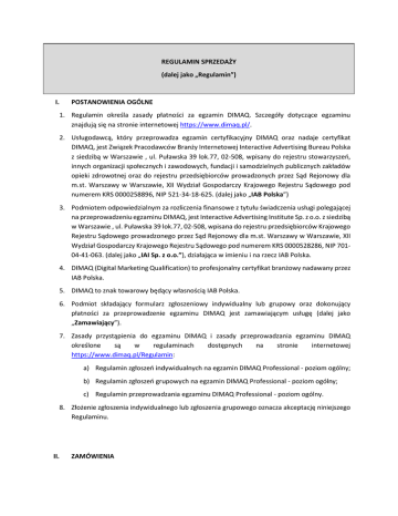 REGULAMIN SPRZEDAŻY (dalej jako „Regulamin”) I. POSTANOWIENIA OGÓLNE 1. Regulamin określa zasady płatności za egzamin DIMAQ. Szczegóły dotyczące egzaminu znajdują się na stronie internetowej https://www.dimaq.pl/. 2. Usługodawcą, który przeprowadza egzamin certyfikacyjny DIMAQ oraz nadaje certyfikat DIMAQ, jest Związek Pracodawców Branży Internetowej Interactive Advertising Bureau Polska z siedzibą w Warszawie , ul. Puławska 39 lok.77, 02-508, wpisany do rejestru stowarzyszeń, innych organizacji społecznych i zawodowych, fundacji i samodzielnych publicznych zakładów opieki zdrowotnej oraz do rejestru przedsiębiorców prowadzonych przez Sąd Rejonowy dla m.st. Warszawy w Warszawie, XII Wydział Gospodarczy Krajowego Rejestru Sądowego pod numerem KRS 0000258896, NIP 521-34-18-625. (dalej jako „IAB Polska”) 3. Podmiotem odpowiedzialnym za rozliczenia finansowe z tytułu świadczenia usługi polegającej na przeprowadzeniu egzaminu DIMAQ, jest Interactive Advertising Institute Sp. z o.o. z siedzibą w Warszawie , ul. Puławska 39 lok.77, 02-508, wpisana do rejestru przedsiębiorców Krajowego Rejestru Sądowego prowadzonego przez Sąd Rejonowy dla m.st. Warszawy w Warszawie, XII Wydział Gospodarczy Krajowego Rejestru Sądowego pod numerem KRS 0000528286, NIP 70104-41-063. (dalej jako „IAI Sp. z o.o.”), działająca w imieniu i na rzecz IAB Polska. 4. DIMAQ (Digital Marketing Qualification) to profesjonalny certyfikat branżowy nadawany przez IAB Polska. 5. DIMAQ to znak towarowy będący własnością IAB Polska. 6. Podmiot składający formularz zgłoszeniowy indywidualny lub grupowy oraz dokonujący płatności za przeprowadzenie egzaminu DIMAQ jest zamawiającym usługę (dalej jako „Zamawiający”). 7. Zasady przystąpienia do egzaminu DIMAQ i zasady przeprowadzania egzaminu DIMAQ określone są w regulaminach dostępnych na stronie internetowej https://www.dimaq.pl/Regulamin: a) Regulamin zgłoszeń indywidualnych na egzamin DIMAQ Professional - poziom ogólny; b) Regulamin zgłoszeń grupowych na egzamin DIMAQ Professional - poziom ogólny; c) Regulamin przeprowadzania egzaminu DIMAQ Professional - poziom ogólny. 8. Złożenie zgłoszenia indywidualnego lub zgłoszenia grupowego oznacza akceptację niniejszego Regulaminu. II. ZAMÓWIENIA 1. Zgłoszenie do egzaminu DIMAQ następuje zgodnie z postanowieniami regulaminów, o których mowa w pkt I.7. lit. a)-c) powyżej, za pomocą udostępnionych na stronie internetowej https://www.dimaq.pl/Regulamin formularzy zgłoszeń. 2. Ceny podane są w załącznikach nr 2 do regulaminów, o których mowa w pkt I.7. lit. a)-b) powyżej. 3. Ceny podane są w wartościach netto. 4. Kwestie wystawienia faktury VAT za przeprowadzenie egzaminu DIMAQ określają regulaminy, o których mowa w pkt I. 7. lit. a) - b) powyżej. 5. Umowa między IAB Polska a Zamawiającym zostaje zawarta po złożeniu zamówienia, w dniu zaksięgowania płatności na koncie IAI Sp. z o.o. III. PŁATNOŚCI 1. Zamawiający uiszcza opłatę za egzamin DIMAQ przelewem online poprzez system płatności PayU. 2. Płatność obsługiwana jest przez PayU S.A. z siedzibą w Poznaniu, 60-166 Poznań, przy ul. Grunwaldzkiej 182, wpisaną do rejestru przedsiębiorców prowadzonego przez Sąd Rejonowy Poznań – Nowe Miasto i Wilda w Poznaniu, Wydział VIII Gospodarczy Krajowego Rejestru Sądowego pod numerem KRS 0000274399, posiadającą NIP: 779-23-08-495, występującą jako dostawca usług płatniczych w rozumieniu ustawy z dnia 19 sierpnia 2011 r. o usługach płatniczych (Dz. U. 2011.199.1175 z późn. zm.). Sposób płatności określa regulamin systemu PayU, który rozpatruje również reklamacje dotyczące płatności on-line, dostępny na stronie internetowej pod adresem https://static.payu.com/sites/terms/files/REGULAMIN_SWIADCZENIA_USLUGI_PAYU.pdf. 3. Płatność dokonywana jest poprzez konto Zamawiającego utworzone przy składaniu formularza zgłoszeniowego pod adresem https://www.dimaq.pl/rejestracja. 4. W przypadku zgłoszeń grupowych możliwe jest ustalenie przez IAB Polska i Zamawiającego innych zasad płatności, na postawie pisemnego porozumienia. W takim przypadku zastosowanie znajdują postanowienia porozumienia. Niniejszy Regulamin będzie miał zastosowanie wtedy, gdy Zamawiający i IAB Polska ustalą, że Zamawiający opłaci egzamin DIMAQ za pośrednictwem strony internetowej www.dimaq.pl, przy użyciu dostępnego tam systemu płatności PayU. 5. Termin na dokonanie płatności rozpoczyna się z momentem przesłania Zamawiającemu przez IAB Polska emailem potwierdzenia otrzymania zgłoszenia. 6. O potwierdzeniu dokonania płatności Zamawiający zostanie poinformowany pocztą elektroniczną na podany adres email. 7. W przypadku nieuiszczenia opłaty zgodnie z pkt. III.5. Regulaminu powyżej, zamówienie zostaje anulowane. IV. ODSTĄPIENIE 1. Prawo do odstąpienia od umowy zawartej między IAB Polska a Zamawiającym przysługuje jedynie w przypadku, gdy Zamawiającym jest konsument w rozumieniu art. 221 Kodeksu cywilnego. W takim przypadku do umowy zawartej między IAB Polska a Zamawiającym zastosowanie znajdują przepisy ustawy z 30 maja 2014 r. o prawach konsumenta (Dz. U. z 2014, poz. 827 ze zm.). 2. Prawo do odstąpienia nie przysługuje podmiotowi niebędącemu konsumentem w rozumieniu art. 221 Kodeksu cywilnego. 3. Konsument będący Zamawiającym ma prawo do odstąpienia od umowy zawartej z IAB Polska w terminie 14 dni od dnia, o którym mowa w pkt II.5. Regulaminu powyżej. 4. Odstąpienie od umowy następuje poprzez złożenie oświadczenia za pośrednictwem wiadomości przesłanej emailem na adres [email protected] . W treści oświadczenia należy podać dane Zamawiającego oraz podać numer rachunku bankowego na jaki mają zostać zwrócone środki. 5. W przypadku odstąpienia Zamawiającego od umowy w terminie wskazanym w pkt. IV.3. Regulaminu powyżej, wpłacone środki w terminie 14 dni od dnia otrzymania