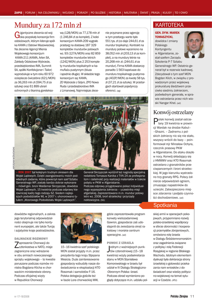 ZAPIS | FORUM | NAO... CELOWNIKU KULISY | |PORADY PO SŁUŻBIE HISTORIA PRASA||KULISY ŚWIAT | TO I OWO WSZYSTKO 3| WOJSKO BLTr| PORADY | PO|SŁUŻBIE | HISTORIA | MILITARIA | MILITARIA | ŚWIAT ||PRASA Mundury za 172 mln zł G igantyczne zlecenia od wojska pozyskały konsorcja firm odzieżowych, którym lideruje spółka KAMA z Ostrowi Mazowieckiej. Na zlecenie Agencji Mienia Wojskowego konsorcjum KAMA-211 (KAMA, Arlen SA, Zakłady Odzieżowe Wybrzeże, przedsiębiorstwo IMA, Summit SA, spółki Konfekcjoner i Tailor) wyprodukuje w tym roku 60 972 ocieplacze ćwiczebne (621/MON) za 36,263 mln zł (594,75 zł za sztukę) oraz 61 899 ubrań ochronnych z tkaniną goretekso- KARTOTEKA wą (128/MON) za 77,178 mln zł (1 246,84 zł za komplet). Z kolei konsorcjum KAMA-209 wygrało przetarg na dostawę 187 329 kompletów mundurów polowych wz. 93 (127A/MON) oraz 82 859 kompletów mundurów letnich (124Z/MON) plus 2 253 komplety mundurów tropikalnych w kamuflażu pustynnym (bluza i spodnie długie). W składzie tego konsorcjum są: KAMA, ZO Wybrzeże z Gdyni, ZPO Nowa Ruda i przedsiębiorstwo IMA z Limanowej. Najmniejsze zlece- nie przyznane przez agencję w tym przetargu warte było 551 tys. zł (co daje 244,61 zł za mundur tropikalny). Kontrakt na mundury polowe wyceniono na 38,052 mln zł (203,13 zł za komplet), a na mundury letnie na 20,268 mln zł. (244,61 zł za mundur). Firma KAMA dostarczy ponadto 1 563 kapelusze do munduru tropikalnego pustynnego (402P/MON) za kwotę 58 tys. zł (37,21 zł za sztukę). W przetargach startowali pojedynczy oferenci. (ag) GEN. DYW. MAREK TOMASZYCKI, dowódca I zmiany Polskiego Kontyngentu w Afganistanie, został szefem Zarządu Szkolenia P-7 Sztabu Generalnego WP. Ostatnio generał był w rezerwie kadrowej. Zdecydował o tym szef MON Bogdan Klich, w związku z prowadzonym przez wojskową prokuraturę śledztwem przeciwko siedmiu żołnierzom, podwładnym generała, w sprawie ostrzelania przez nich wioski Nangar Khel. (ad) Konwój ostrzelany JAROSAW WIŚNIEWSKI P – ROK 2007 był kolejnym trudnym okresem dla Wojsk Lądowych. Dzięki zaangażowaniu moich podwładnych zadania, które powierzył nam szef Sztabu Generalnego WP, zostały bardzo dobrze wykonane – mówił gen. broni Waldemar Skrzypczak, dowódca Wojsk Lądowych, 15 kwietnia podczas odprawy kierowniczej kadry tego rodzaju SZ. Siedem najlepszych pododdziałów WL w 2007 r. uhonorowano tytułem „Wzorowego Pododdziału Wojsk Lądowych”. Generał Skrzypczak wyróżnił też nagrodą specjalną redaktora Tomasza Kanika z TVN 24 za profesjonalizm i rzetelność przy realizacji materiałów w trakcie pobytu w PKW w Afganistanie. Podczas odprawy przygotowano pokaz indywidualnego wyposażenia żołnierza – uczestnika misji afgańskiej. Zaprezentowano m.in. mundur polowy letni wz. 2008, broń strzelecką i przyrządy noktowizyjne. (SG) olski konwój został ostrzelany 19 kwietnia w prowincji Wardak na drodze Kabul– –Ghazni. – Żadnemu z polskich żołnierzy nic się nie stało, wszyscy wrócili do bazy – poinformował mjr Mirosław Ochyra, rzecznik prasowy PKW w Afganistanie. Do ataku doszło w nocy. Konwój składający się z HMMWV oraz KTO Rosomak ostrzelano z granatników przeciwpancernych i broni strzeleckiej. W jego kierunku wystrzelono trzy granaty RPG. Polscy żołnierze odpowiedzieli ogniem, zmuszając napastników do ucieczki. Zabezpieczono miejsce zdarzenia i podjęto czynności dochodzeniowe. (ad) Spotkania dowództw regionalnych, a zakres jego terytorialnej odpowiedzialności obejmuje nie tylko kontynent europejski, ale także Turcję i azjatyckie kraje postradzieckie. DALMACKIE ROZMOWY aproszenie Chorwacji do członkostwa w NATO, misje zagraniczne oraz wdrażanie w obu armiach nowoczesnego sprzętu wojskowego – to kwestie poruszane podczas rozmów ministra Bogdana Klicha w chorwackim ministerstwie obrony. Podczas oficjalnej wizyty w Republice Chorwacji Z nr 17-18/2008 gdzie zaprezentowała program korwety wielozadaniowej Gawron, gospodarze zaś udostępnili do zwiedzania okręt rakietowy i morskie centrum operacyjne. (ad) 15–16 kwietnia szef polskiego MON został przyjęty m.in. przez prezydenta tego kraju Stjepana Mesicia. Duże zainteresowanie gospodarzy wzbudziły nasze doświadczenia w eksploatacji KTO Rosomak i samolotów F-16. Polska delegacja gościła też w bazie Lora chorwackiej MW, POMOC Z IZRAELA ednym z ważniejszych punktów czterodniowej (15–18 kwietnia) wizyty podsekretarza stanu w MON Stanisława Komorowskiego w Izraelu był udział w IV Dialogu Strategiczno-Obronnym Polska–Izrael. Podczas obrad wymieniono poglądy dotyczące m.in. udziału pol- J skiej armii w operacjach pokojowych, przypomniano rozwój polsko-izraelskiej współpracy w sferze obronności i kooperacji przemysłów zbrojeniowych, omówiono rolę Izraela w Dialogu Śródziemnomorskim oraz zagadnienia związane z polityką i rolą Federacji Rosyjskiej w regionie Bliskiego Wschodu. Istotnym elementem dyskusji była deklaracja strony izraelskiej o gotowości przekazania nam wniosków z doświadczeń oraz wiedzy polityczno-wojskowej na temat sytuacji w Czadzie. (ATU) Polska Zbrojna 11