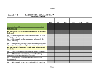 Arkusz1 Załącznik Nr 2 HARMONOGRAM REALIZACJI CELÓW STRATEGICZNYCH 2008 Cel strategiczny 1:Tworzenie warunków do wzmacniania funkcji rodziny Cel operacyjny 1: Przeciwdziałanie patologiom wśród dzieci i młodzieży Cel 1.1.1 Propagowanie akcji śród dzieci i młodzieży na temat istniejących zagrożeń. Cel 1.1.2 Organizacja spotkań edukacyjno- kulturalnych dla dzieci i młodzieży. Cel 1.1.3 Zwiększenie kompetencji pracowników edukacyjnych i pomocy społecznej dot. patologii wśród dzieci i młodzieży Cel operacyjny 2: Zagospodarowanie czasu wolnego dzieci i młodzieży Cel 1.2.1 Wspieranie kółek zainteresowań dla dzieci i młodzieży. Cel 1.2.2 Rozszerzenie działalności „wioski internetowej” o naukę nowoczesnych technik multimedialnych. Cel 1.2.3 Organizacja wycieczek i biwaków oraz spotkań integracyjnych. Cel 1.2.4 Organizacja wypoczynku letniego dzieci i młodzieży. Strona 1 2009 2010 2011 2012 2013 Arkusz1 Cel 1.2.5 Stworzenie systemu motywacyjnego dla dzieci i młodzieży uzdolnionej. Cel operacyjny 3: Pedagogizacja rodziców. Cel 1.3.1 Organizacja spotkań rodziców ze specjalistami różnych dziedzin, Cel 1.3.2 Organizacja integracyjnych festynów rodzinnych. Cel operacyjny 4: Wsparcie dla rodzin dysfunkcyjnych. Cel 1.4.1 Zwiększenie zakresu współpracy pomiędzy instytucjami: OPS, GKRPA, sądami, kuratorami, PCPR, Powiatowym Urzędem Pracy, pedagogiem szkolnym, Policją itd. w zakresie sprawnego przepływu informacji, Cel 1.4.2 Wprowadzanie nowych form pracy środowiskowej (asystent rodziny), Cel 1.4.3 Dążenie do ograniczania postawy bierności poprzez aktywizację zawodową; motywację do uczestnictwa w kursach; pomoc w poszukiwaniu pracy. Cel strategiczny 2: Zapewnienie pełnego udziału w życiu społecznym osobom starszym i niepełnosprawnym Cel operacyjny 1: Przeciwdziałanie wykluczeniu społecznemu osób starszych i niepełnosprawnych. Cel 2.1.1 Organizacja imprez integracyjnych, Cel 2.1.2 Podniesienie świadomości społecznej o istnieniu problemów osób starszych i niepełnosprawnych poprzez akcję informacyjną Strona 2 Arkusz1 Cel 2.1.3 Zwiększenie dostępności obiektów użyteczności publicznej dla osób starszych niepełnosprawnych. Cel 2.1.4 Wspieranie zatrudnienia osób niepełnosprawnych. Cel operacyjny 2: Aktywizacja osób niepełnosprawnych. Cel 2.2.1 Promocja i wzmocnienie roli wolontariatu na rzecz osób niepełnosprawnych. Cel 2.2.2 Promocja działalności WTZ i SDS wśród osób i rodzin z niepełnosprawnością, Cel 2.2.3 Organizacja sali rehabilitacyjnej (doposażanie w sprzęt rehabilitacyjny oraz zatrudnienie osoby prowadzącej zajęcia). Cel operacyjny 3: Organizowanie czasu wolnego osobom starszym. Cel 2.3.1 Organizowanie czasu wolnego osobom starszym. Cel 2.3.2 Wspieranie działalności klubu seniora. Cel 2.3.3 Organizowanie zajęć gimnastyczno- ruchowych dla seniorów. Cel 2.3.4 Włączanie ludzi starszych w życie gminy i korzystanie z ich doświadczenia. Cel strategiczny 3: Ograniczenie zjawiska uzależnień oraz łagodzenie ich skutków Cel operacyjny 1: Zapobieganie i zwalczanie problemów związanych z uzależnieniem od alkoholu. Cel 3.1.1 Dążenie do zwiększenia dostępności pomocy terapeutycznej dla osób uzależnionych. Strona 3 Arkusz1 Cel operacyjny 2: Zwiększenie świadomości społecznej w zakresie przeciwdziałania uzależnieniom. Cel 3.2.1 Organizowanie spotkań edukacyjno- profilaktycznych w zakresie eliminowania czynników zagrażających. Cel 3.2.2 Udzielanie osobom i rodzinom uzależnionym i współuzależnionym pomocy psychospołecznej i prawnej. Cel 3.2.3 Doskonalenie form pracy z uzależnionym w celu zmobilizowania go do leczenia Cel 3.2.4 Współpraca Gminnej Komisji d/s. rozwiązywania problemów alkoholowych w gminie Lipusz z samorządem gminnym, jednostkami organizacyjnymi pomocy społecznej, kulturalnymi, instytucjami oświatowymi, organizacjami pozarządowymi. Cel operacyjny 3: Wypracowanie form współpracy lokalnymi instytucjami i organizacjami w zakresie profilaktyki uzależnień. Cel 3.3.1 Uściślenie współpracy z sędziami rodzinnymi i kuratorami sądowymi. z Cel strategiczny 4: Promocja zdrowego trybu życia Cel operacyjny 1: Zachowanie zdrowia społeczności lokalnejprofilaktyka prozdrowotna i proekologiczna. Cel 4.1.1 Organizowanie spotkań edukacyjno- profilaktycznych w zakresie podnoszenia rangi zdrowia jako wartości niezbędnej. Cel 4.1.2 Organizacja konkursów dla dzieci i młodzieży na temat edukacji zdrowotnej i ekologicznej Cel operacyjny 2: Eliminowanie szkodliwych wpływów środowiska Strona 4 Arkusz1 Cel 4.2.1 Współpraca międzyinstytucjonalna dotycząca ochrony zdrowia i środowiska naturalnego. Cel operacyjny 3: Wzrost aktywności fizycznej wśród społeczności lokalnej. Cel 4.3.1 Organizacja festynów rekreacyjno, zawodów, w tym biegi uliczne i przełajowe, rajdy rowerowe itp., Cel strategiczny 5: Zwiększanie poczucia bezpieczeństwa mieszkańców gminy Cel operacyjny 1: Utworzenie etatu dzielnicowego na terenie gminy. Cel 5.1.1 Zgłoszenie zapotrzebowania na etat dzielnicowego do władz powiatowych i wojewódzkich organów policji. Cel operacyjny 2: Profilaktyka zagrożeń w ruchu drogowym. Cel 5.2.1 Intensyfikacja działań profilaktycznych w zakresie bezpiecznego uczestnictwa w ruchu drogowym zarówno dzieci i młodzieży jak i osób dorosłych, Cel operacyjny 3: Pełna koordynacja służb zapewniająca bezpieczeństwo mieszkańców. Cel 5.3.1 Sprawny przepływ informacji w sytuacjach zagrażających zdrowiu i życiu mieszkańców. Cel operacyjny 4: Poprawa infrastruktury drogowej Cel 5.4.1 Zgłaszanie potrzeb w zakresie infrastruktury drogowej do władz nadrzędnych, celem poprawy według kompetencji. Strona 5 Arkusz1 Cel operacyjny 5: Wzrost skuteczności funkcjonowania instytucji odpowiedzialnych za utrzymanie porządku i bezpieczeństwa. Cel 5.5.1 Doposażenie Policji w niezbędny sprzęt usprawniający działalność prewencyjną, Cel 5.5.2 Zac