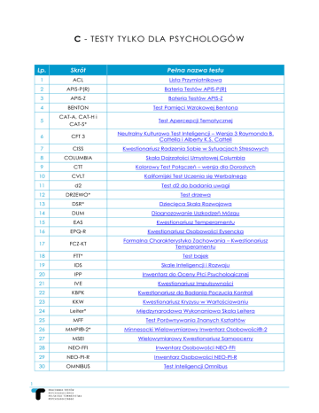 C - TESTY TYLKO DLA PSYCHOLOGÓ W Lp. Skrót Pełna nazwa testu 1 ACL Lista Przymiotnikowa 2 APIS-P(R) Bateria Testów APIS-P(R) 3 APIS-Z Bateria Testów APIS-Z 4 BENTON Test Pamięci Wzrokowej Bentona 5 1 CAT-A, CAT-H i CAT-S* Test Apercepcji Tematycznej 6 CFT 3 Neutralny Kulturowo Test Inteligencji – Wersja 3 Raymonda B. Cattella i Alberty K.S. Cattell 7 CISS Kwestionariusz Radzenia Sobie w Sytuacjach Stresowych 8 COLUMBIA Skala Dojrzałości Umysłowej Columbia 9 CTT Kolorowy Test Połączeń – wersja dla Dorosłych 10 CVLT Kalifornijski Test Uczenia się Werbalnego 11 d2 Test d2 do badania uwagi 12 DRZEWO* Test drzewa 13 DSR* Dziecięca Skala Rozwojowa 14 DUM Diagnozowanie Uszkodzeń Mózgu 15 EAS Kwestionariusz Temperamentu 16 EPQ-R Kwestionariusz Osobowości Eysencka 17 FCZ-KT Formalna Charakterystyka Zachowania – Kwestionariusz Temperamentu 18 FTT* Test bajek 19 IDS Skale Inteligencji i Rozwoju 20 IPP Inwentarz do Oceny Płci Psychologicznej 21 IVE Kwestionariusz Impulsywności 22 KBPK Kwestionariusz do Badania Poczucia Kontroli 23 KKW Kwestionariusz Kryzysu w Wartościowaniu 24 Leiter* Międzynarodowa Wykonaniowa Skala Leitera 25 MFF Test Porównywania Znanych Kształtów 26 MMPI®-2* Minnesocki Wielowymiarowy Inwentarz Osobowości®-2 27 MSEI Wielowymiarowy Kwestionariusz Samooceny 28 NEO-FFI Inwentarz Osobowości NEO-FFI 29 NEO-PI-R Inwentarz Osobowości NEO-PI-R 30 OMNIBUS Test Inteligencji Omnibus 31 PTS Kwestionariusz Temperamentu PTS 32 RAVEN Testy Matryc Ravena – wszystkie wersje 33 RFFT Test Płynności Niewerbalnej Ruffa 34 RISB Test Niedokończonych Zdań Rottera 35 ROR* Test Rorschacha 36 SCENOTEST* Scenotest 37 SOR Skale Oceny Rodziny 38 SPK-DP Skala Poczucia Kontroli u Dzieci Przedszkolnych 39 STAI Inwentarz Stanu i Cechy Lęku 40 STAIC Inwentarz Stanu i Cechy Lęku dla Dzieci 41 SZONDI* Test Szondiego 42 TAT* Test Apercepcji Tematycznej 43 TIS Bateria testów TIS 44 TO Test Osobowości 45 TOiZ Test Osobowości i Zainteresowań 46 TPB Test Piramid Barwnych 47 TRS-S, TRS-Z Test Rozumienia Słów – wersja Standard oraz wersja dla Zaawansowanych 48 TSD Test Słownikowy dla Dzieci 49 TUF Test Układania Figur 50 TUS Testy Uwagi i Spostrzegawczości 51 WAIS-R* Skala Inteligencji Wechslera dla Dorosłych – wersja zrewidowana 52 WCST* Test Sortowania Kart z Wisconsin 53 WISC-R* Skala Inteligencji Wechslera dla Dzieci – wersja zmodyfikowana 54 ZTU Zestaw Testów Uzdolnień * Zalecane szkolenie z danego testu ** Testy wymagają ukończenia ogólnego szkolenia z psychometrii, a następnie szkolenia z zakresu tego konkretnego testu (lub grupy podobnych testów). A Test znalazł się w danej grupie zgodnie z decyzją Autora. 2