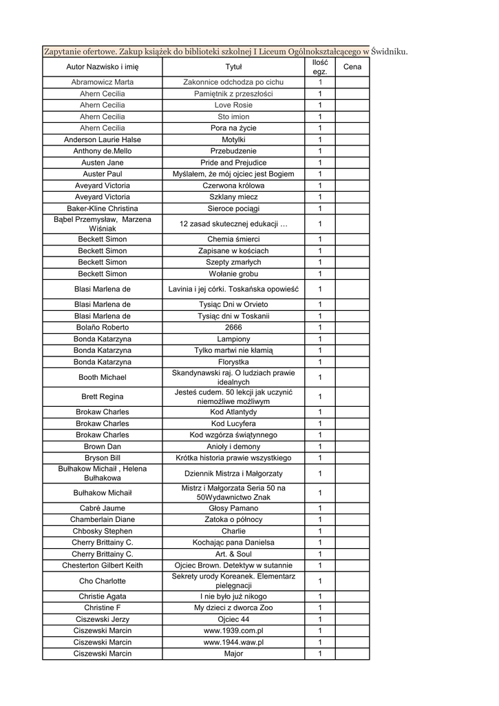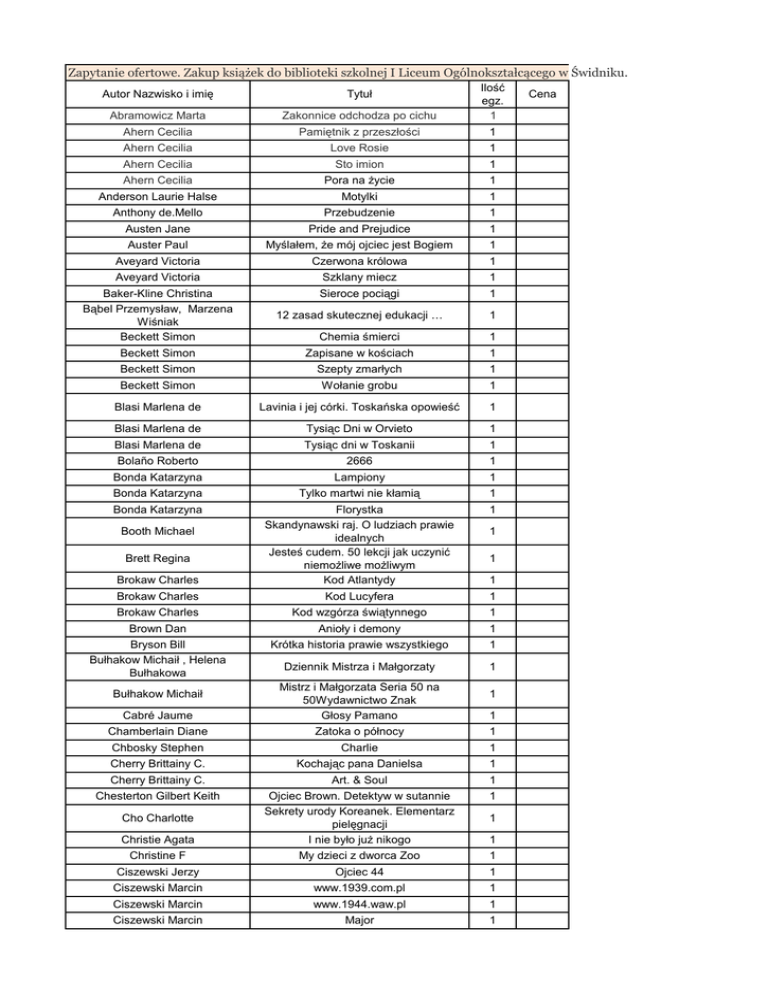 Zapytanie ofertowe. Zakup książek do biblioteki szkolnej I Liceum Ogólnokształcącego w Świdniku. Autor Nazwisko i imię Tytuł Abramowicz Marta Zakonnice odchodza po cichu Ilość egz. 1 Ahern Cecilia Pamiętnik z przeszłości 1 Ahern Cecilia Love Rosie 1 Ahern Cecilia Sto imion 1 Ahern Cecilia Pora na życie 1 Anderson Laurie Halse Motylki 1 Anthony de.Mello Przebudzenie 1 Austen Jane Pride and Prejudice 1 Auster Paul Myślałem, że mój ojciec jest Bogiem 1 Aveyard Victoria Czerwona królowa 1 Aveyard Victoria Szklany miecz 1 Baker-Kline Christina Bąbel Przemysław, Marzena Wiśniak Beckett Simon Sieroce pociągi 1 12 zasad skutecznej edukacji … 1 Chemia śmierci 1 Beckett Simon Zapisane w kościach 1 Beckett Simon Szepty zmarłych 1 Beckett Simon Wołanie grobu 1 Blasi Marlena de Lavinia i jej córki. Toskańska opowieść 1 Blasi Marlena de Tysiąc Dni w Orvieto 1 Blasi Marlena de Tysiąc dni w Toskanii 1 Bolaño Roberto 2666 1 Bonda Katarzyna Lampiony 1 Bonda Katarzyna Tylko martwi nie kłamią 1 Bonda Katarzyna Florystka Skandynawski raj. O ludziach prawie idealnych Jesteś cudem. 50 lekcji jak uczynić niemożliwe możliwym Kod Atlantydy 1 Brokaw Charles Kod Lucyfera 1 Brokaw Charles Kod wzgórza świątynnego 1 Brown Dan Anioły i demony 1 Bryson Bill Bułhakow Michaił , Helena Bułhakowa Krótka historia prawie wszystkiego 1 Dziennik Mistrza i Małgorzaty 1 Booth Michael Brett Regina Brokaw Charles 1 1 1 Cabré Jaume Mistrz i Małgorzata Seria 50 na 50Wydawnictwo Znak Głosy Pamano Chamberlain Diane Zatoka o północy 1 Bułhakow Michaił 1 1 Chbosky Stephen Charlie 1 Cherry Brittainy C. Kochając pana Danielsa 1 Cherry Brittainy C. Art. & Soul 1 Chesterton Gilbert Keith 1 Christie Agata Ojciec Brown. Detektyw w sutannie Sekrety urody Koreanek. Elementarz pielęgnacji I nie było już nikogo Christine F My dzieci z dworca Zoo 1 Cho Charlotte 1 1 Ciszewski Jerzy Ojciec 44 1 Ciszewski Marcin www.1939.com.pl 1 Ciszewski Marcin www.1944.waw.pl 1 Ciszewski Marcin Major 1 Cena Ciszewski Marcin www.ru2012.pl 1 Ciszewski Marcin Kapitan Jamróz 1 Ciszewski Marcin www.afgan.com.pl 1 Ciszewski Marcin Mróz 1 Ciszewski Marcin Upał 1 Ciszewski Marcin Wiatr 1 Clare Cassandra Miasto kości 1 Clare Cassandra Miasto popiołów 1 Clare Cassandra Miasto szkła 1 Clare Cassandra Miasto upadłych aniołów 1 Clare Cassandra Miasto zagubionych dusz 1 Clare Cassandra Miasto niebiańskiego ognia 1 Coben harlan Schronienie 1 Coben harlan Tęsknię za Tobą 1 Coben harlan Kilka sekund od śmierci 1 Coben harlan Odnaleziony 1 Coben harlan Na gorącym uczynku 1 Coelho Paolo Weronika postanawia umrzeć 1 Connan Doyle THE BEST OF SHERLOCK HOLMES 1 Connelly Michael Prawnik z Lincolna 1 Cook Glen Okrutny wiatr 1 Cook Glen Forteca w cieniu 1 Cook Glen Imperium nieznające porażki 1 Cook Glen Droga zimnego serca Papieżyca Joanna 1 Wayward Pines. Szum 1 Crouch Blake Wayward Pines. Bunt 1 Crouch Blake Wayward Pines. Krzyk 1 Cygler Hanna Pokonani 1 Cygler Hanna Czas zamknięty 1 Cygler Hanna Głowa anioła 1 Cygler Hanna Dwie głowy anioła 1 Daniel Silva Śmierć w Wiedniu 1 Daniel Silva Książe ognia 1 Daniel Silva Posłaniec 1 Daniel Silva Angielski zabójca 1 Daniel Silva Spowiednik 1 Daniel Silva Artysta zbrodni 1 Daniel Silva Reguły Moskwy 1 Daniel Silva Uciekinier 1 Daniel Silva Sprawa Rembrandta 1 Daniel Silva Portret Szpiega 1 Daniel Silva Upadły Anioł 1 Daniel Silva Wielki skok 1 Daniel Silva Angielska dziewczyna 1 DashnerJames Więzień labiryntu 1 DashnerJames Próby ognia 1 DashnerJames Lek na smierć 1 de la Motte Anders Gra 1 de la Motte Anders [buzz] 1 de la Motte Anders [bubble] 1 De Stefano Cristina Oriana Fallaci. Portret kobiety 1 Cross Donna Woolfolk Crouch Blake 1 Dessen Sarah Posłuchaj mnie... 1 Dessen Sarah Coś świętego 1 Doerr Anthony Światło, którego nie widać 1 Donlea Charlie Dziewczyna z Summit Lake 1 Drinkwater Carol Oliwkowa farma 1 1 Drinkwater Carol Sezon na oliwki 2 1 Drinkwater Carol Oliwkowe żniwa 3 1 Drinkwater Carol Oliwkowy szlak 4 1 Drinkwater Carol Oliwkowe drzewo 5 1 Drinkwater Carol Powrót na oliwkowa farmę 6 1 Drożdż Piotr Krzysztof Wielicki – mój wybór 1 Dukaj Jacek Lód 1 Eliade Mircea Młodość stulatka 1 Elsberg Marc Blackout 1 Elsberg Marc Zero 1 Engelking Wojciech Lekcje anatomii doktora D 1 Estés Clarissa Pinkola Oswobodzenie silnej kobiety. 1 Extence Gavin Lustrzany świat Melody Black 1 Falcones Ildefonso Katedra w Barcelonie 1 Fallaci Oriana Kapelusz cały w czereśniach 1 Fathallah Judith Chuda 1 Fellowes Julian Belgravia 1 Fernandez Xavier Barcelona jazz club 1 Ferrante Elena Genialna przyjaciółka 1 Ferrante Elena Historia nowego nazwiska 1 Ferrante Elena Historia ucieczki 1 Ferrante Elena Historia zaginionej dziewczynki 1 Fielding Joy W pajęczej sieci 1 Fielding Joy Zawsze ktoś patrzy 1 Fielding Joy Morderstwa nad Shadow Creek 1 Fielding Joy Pierwszy raz 1 Fitzpatrick Becca Szeptem 1 Fitzpatrick Becca Crescendo 1 Fitzpatrick Becca Cisza 1 Fitzpatrick Becca Finale 1 Fitzpatrick Becca Niebezpieczne kłamstwa 1 Flanagan John Zwiadowcy. Płonący Most 1 Flanagan John Zwiadowcy. Ruiny Gorlanu 1 Flanagan John Zwiadowcy. Ziemia skuta lodem 1 Flanagan John Zwiadowcy. Bitwa o Skandię 1 Flanagan John Zwiadowcy. Czarnoksiężnik z Północy 1 Flanagan John Zwiadowcy. Oblężenie Macindaw 1 Flanagan John Okup za Eraka 1 Flanagan John Królowie Clonmelu 1 Flanagan John Zwiadowcy. Halt w niebezpieczeństwie 1 Flanagan John Cesarz Nihon-Ja 1 Flanagan John Zwiadowcy. Zaginione historie 1 Flanagan John Zwiadowcy. Królewski zwiadowca 1 Flanagan John Księga ryb Williama Goulda 1 Flanagan John Klaśnięcie jednej dłoni 1 Flanagan John Ścieżki północy 1 Follett Ken Filary ziemi 1 Follett Ken Świat bez końca 1 Franzen Jonathan Korekty 1 Frey James Endgame. Wezwanie 1 Frey James Endgame. Klucz Niebios 1 FreyJames Milion małych kawałków 1 Fromm Erich Ucieczka od wolności 1 Gabaldon Diana Obca 1 Gabaldon Diana Uwięziona w burszt