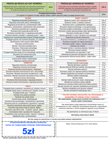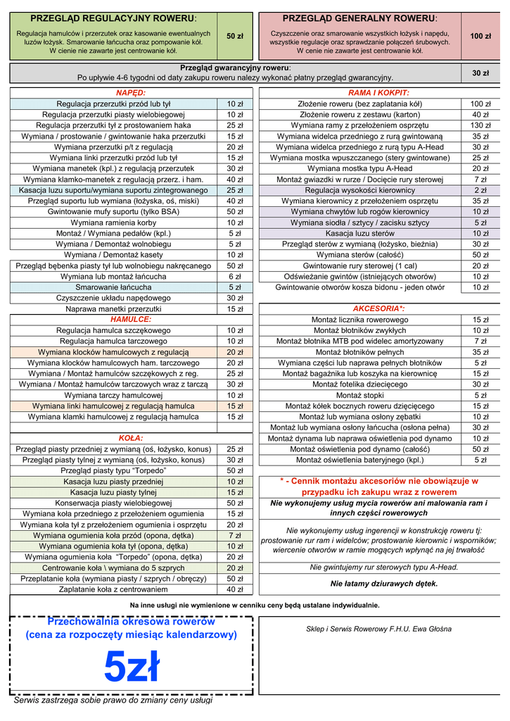 PRZEGLĄD REGULACYJNY ROWERU: Regulacja hamulców i przerzutek oraz kasowanie ewentualnych luzów łożysk. Smarowanie łańcucha oraz pompowanie kół. W cienie nie zawarte jest centrowanie kół. PRZEGLĄD GENERALNY ROWERU: 50 zł Czyszczenie oraz smarowanie wszystkich łożysk i napędu, wszystkie regulacje oraz sprawdzanie połączeń śrubowych. W cenie nie zawarte jest centrowanie kół. Przegląd gwarancyjny roweru: Po upływie 4-6 tygodni od daty zakupu roweru nalezy wykonać płatny przegląd gwarancyjny. NAPĘD: Regulacja przerzutki przód lub tył Regulacja przerzutki piasty wielobiegowej Regulacja przerzutki tył z prostowaniem haka Wymiana / prostowanie / gwintowanie haka przerzutki Wymiana przerzutki p/t z regulacją Wymiana linki przerzutki przód lub tył Wymiana manetek (kpl.) z regulacją przerzutek Wymiana klamko-manetek z regulacją przerz. i ham. Kasacja luzu suportu/wymiana suportu zintegrowanego Przegląd suportu lub wymiana (łożyska, oś, miski) Gwintowanie mufy suportu (tylko BSA) Wymiana ramienia korby Montaż / Wymiana pedałów (kpl.) Wymiana / Demontaż wolnobiegu Wymiana / Demontaż kasety Przegląd bębenka piasty tył lub wolnobiegu nakręcanego Wymiana lub montaż łańcucha Smarowanie łańcucha Czyszczenie układu napędowego Naprawa manetki przerzutki HAMULCE: Regulacja hamulca szczękowego Regulacja hamulca tarczowego Wymiana klocków hamulcowych z regulacją Wymiana klocków hamulcowych ham. tarczowego Wymiana / Montaż hamulców szczękowych z reg. Wymiana / Montaż hamulców tarczowych wraz z tarczą Wymiana tarczy hamulcowej Wymiana linki hamulcowej z regulacją hamulca Wymiana klamki hamulcowej z regulacją hamulca KOŁA: Przegląd piasty przedniej z wymianą (oś, łożysko, konus) Przegląd piasty tylnej z wymianą (oś, łożysko, konus) Przegląd piasty typu “Torpedo” Kasacja luzu piasty przedniej Kasacja luzu piasty tylnej Konserwacja piasty wielobiegowej Wymiana koła przedniego z przełożeniem ogumienia Wymiana koła tył z przełożeniem ogumienia i osprzętu Wymiana ogumienia koła przód (opona, dętka) Wymiana ogumienia koła tył (opona, dętka) Wymiana ogumienia koła “Torpedo” (opona, dętka) Centrowanie koła \ wymiana do 5 szprych Przeplatanie koła (wymiana piasty / szprych / obręczy) Zaplatanie koła z centrowaniem 10 zł 10 zł 25 zł 15 zł 20 zł 15 zł 30 zł 40 zł 25 zł 40 zł 50 zł 10 zł 5 zł 5 zł 10 zł 50 zł 6 zł 5 zł 30 zł 15 zł 10 zł 10 zł 20 zł 20 zł 25 zł 30 zł 10 zł 15 zł 15 zł 25 zł 30 zł 50 zł 10 zł 15 zł 50 zł 15 zł 20 zł 7 zł 10 zł 20 zł 20 zł 50 zł 40 zł 5zł Serwis zastrzega sobie prawo do zmiany ceny usługi 30 zł RAMA I KOKPIT: Złożenie roweru (bez zaplatania kół) Złożenie roweru z zestawu (karton) Wymiana ramy z przełożeniem osprzętu Wymiana widelca przedniego z rurą gwintowaną Wymiana widelca przedniego z rurą typu A-Head Wymiana mostka wpuszczanego (stery gwintowane) Wymiana mostka typu A-Head Montaż gwiazdki w rurze / Docięcie rury sterowej Regulacja wysokości kierownicy Wymiana kierownicy z przełożeniem osprzętu Wymiana chwytów lub rogów kierownicy Wymiana siodła / sztycy / zacisku sztycy Kasacja luzu sterów Przegląd sterów z wymianą (łożysko, bieżnia) Wymiana sterów (całość) Gwintowanie rury sterowej (1 cal) Odświeżanie gwintów (istniejących otworów) Gwintowanie otworów kosza bidonu - jeden otwór 100 zł 40 zł 130 zł 35 zł 30 zł 25 zł 20 zł 7 zł 2 zł 35 zł 10 zł 5 zł 10 zł 30 zł 50 zł 20 zł 10 zł 10 zł AKCESORIA*: Montaż licznika rowerowego Montaż błotników zwykłych Montaż błotnika MTB pod widelec amortyzowany Montaż błotników pełnych Wymiana części lub naprawa pełnych błotników Montaż bagażnika lub koszyka na kierownicę Montaż fotelika dziecięcego Montaż stopki Montaż kółek bocznych roweru dzięcięcego Montaż lub wymiana osłony zębatki Montaż lub wymiana osłony łańcucha (osłona pełna) Montaż dynama lub naprawa oświetlenia pod dynamo Montaż oświetlenia pod dynamo (całość) Montaż oświetlenia bateryjnego (kpl.) 15 zł 10 zł 7 zł 35 zł 5 zł 15 zł 30 zł 5 zł 15 zł 10 zł 30 zł 10 zł 50 zł 5 zł * - Cennik montażu akcesoriów nie obowiązuje w przypadku ich zakupu wraz z rowerem Nie wykonujemy usług mycia rowerów ani malowania ram i innych części rowerowych Nie wykonujemy usług ingerencji w konstrukcję roweru tj: prostowanie rur ram i widelców; prostowanie kierownic i wsporników; wiercenie otworów w ramie mogących wpłynąć na jej trwałość Nie gwintujemy rur sterowych typu A-Head. Nie łatamy dziurawych dętek. Na inne usługi nie wymienione w cenniku ceny będą ustalane indywidualnie. Przechowalnia okresowa rowerów (cena za rozpoczęty miesiąc kalendarzowy) 100 zł Sklep i Serwis Rowerowy F.H.U. Ewa Głośna