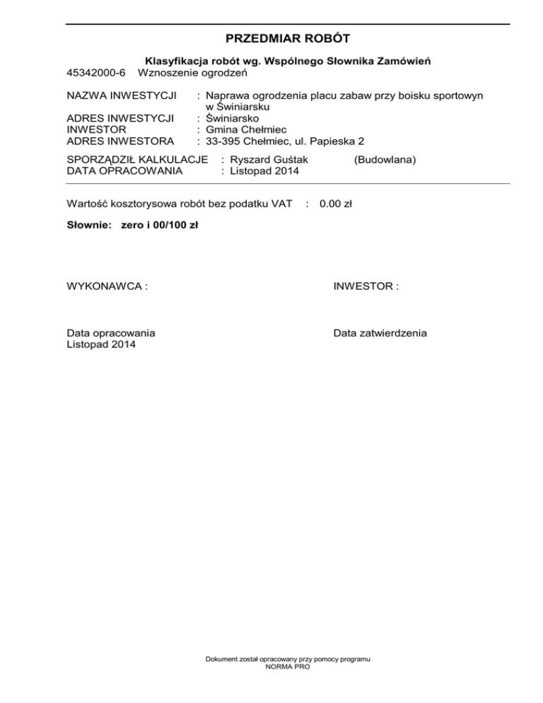 PRZEDMIAR ROBÓT 45342000-6 Klasyfikacja robót wg. Wspólnego Słownika Zamówień Wznoszenie ogrodzeń NAZWA INWESTYCJI ADRES INWESTYCJI INWESTOR ADRES INWESTORA : Naprawa ogrodzenia placu zabaw przy boisku sportowyn w Świniarsku : Świniarsko : Gmina Chełmiec : 33-395 Chełmiec, ul. Papieska 2 SPORZĄDZIŁ KALKULACJE DATA OPRACOWANIA : Ryszard Guśtak : Listopad 2014 Wartość kosztorysowa robót bez podatku VAT (Budowlana) : 0.00 zł Słownie: zero i 00/100 zł WYKONAWCA : INWESTOR : Data opracowania Listopad 2014 Data zatwierdzenia Dokument został opracowany przy pomocy programu NORMA PRO OGÓLNA CHARAKTERYSTYKA OBIEKTU Remont ogrodzenia przy placu zabaw w Świniarsku /obok boiska sprtowego/. Zakres robót: 1. Rozebranie ogrodzenia na dł. 55,125 m 2. Wymiana paneli ogrodzeniowych 7 szt. 3. Prostowanie ogrodzenia /paneli z siatki stalowej ocynk./ 4. Zakup i montaż furtki o szer. 1m 5. Naprawa istniejącej furtki 6. Montaz słupka ogrodzeniowego o wys. 1,1 m 7. Pionowanie 4 szt. słupków ogrodzeniowych 8. Wywóz złomu - 50 kg na odl. 1 km Podstawa wyceny: KNR 2-02, KNR 4-04 -2- Norma PRO Wersja 4.44b Nr seryjny: 15860 Naprawa p ogrodzenia na placu zabaw , skatepark w Świniarsku przy boisku.kst PRZEDMIAR Lp. Podstawa 1 1 KNR 4-04 d.1 0901-04 2 KNR 2-02 d.1 1803-02 analogia 3 KNR 2-02 d.1 1803-01 analogia 4 KNR 2-02 d.1 1808-06 Opis i wyliczenia Naprawa ogrodzenia Ogrodzenia drewniane z przęseł przenośnych - rozebranie j.m. m 21*(2.50*1.05) m Ogrodzenie z paneli siatki stalowej ocynkowanej - wymiana m 2.50*1.05*7 m Ogrodzenie z paneli siatki stalowej ocynkowanej - prostowanie m 17.00 m Furtka o szerokości 1 m kpl. 1 kpl. 5 Kalkulacja in- Kalkulacja indywidualna - furtka ogrodzeniowa - naprawa d.1 dywidualna 1 kpl. 6 KNR 2-02 d.1 1804-11 analogia Słupki ogrodzeniowe z profili stalowych szt 1 szt kpl. 7 Kalkulacja in- Kalkulacja indywidualna. Pionowanie słupków ogrodzeniowych d.1 dywidualna 4 szt 8 KNR 4-04 d.1 1107-01 t Transport złomu samochodem skrzyniowym z załadunkiem i wyładunkiem ręcznym na odległość do 1 km 0.05 -3- Norma PRO Wersja 4.44b Nr seryjny: 15860 szt t Poszcz. Razem 55.125 RAZEM 55.125 18.375 RAZEM 18.375 17.000 RAZEM 17.000 1.000 RAZEM 1.000 1.000 RAZEM 1.000 1.000 RAZEM 1.000 4.000 RAZEM 4.000 0.050 RAZEM 0.050 Naprawa p ogrodzenia na placu zabaw , skatepark w Świniarsku przy boisku.kst SZCZEGÓŁOWY KOSZTORYS INWESTORSKI Lp. Podstawa 1 1 KNR 4-04 d.1 0901-04 Opis Naprawa ogrodzenia Ogrodzenia drewniane z przęseł przenośnych - rozebranie jm Nakład jedn. Cena jedn. Koszt jedn. m Ilość Wartość 55.125 -- Robocizna -999 2 KNR 2-02 d.1 1803-02 analogia r-g Razem pozycja 1 Ogrodzenie z paneli siatki stalowej ocynkowanej - wymiana 0.2100 0.00 0.000 0.000 m 55.125 18.375 0.00 18.375 17.000 0.00 17.000 1.000 0.00 1.000 1.000 0.00 1.000 1.000 0.00 1.000 4.000 0.00 4.000 0.050 0.00 -- Robocizna -999 0000000 -- Materiały -siatka ogrodzeniowa ślimakowa z drutu ocynkowanego 2.8 mm' materiały pomocnicze(od M) 39599 -- Sprzęt -środek transportowy 1331511 3 KNR 2-02 d.1 1803-01 analogia Razem pozycja 2 Ogrodzenie z paneli siatki stalowej ocynkowanej - prostowanie r-g 1.0869 0.00 0.000 m2 1.5600 0.00 0.000 % 1.5000 0.00 0.000 m-g 0.0084 0.00 0.000 0.000 m -- Robocizna -999 4 KNR 2-02 d.1 1808-06 r-g Razem pozycja 3 Furtka o szerokości 1 m kpl. 0.7679 0.00 0.000 0.000 -- Robocizna -999 0000000 -- Materiały -Furtki ogrodz. z zamkiem zwykłym, pow. 1,5 m materiały pomocnicze(od M) 39599 -- Sprzęt -środek transportowy 2730999 5 Kalkulacja ind.1 dywidualna r-g 10.4400 0.00 0.000 m2 1.0000 0.00 0.000 % 1.5000 0.00 0.000 0.0200 0.00 0.000 0.000 m-g Razem pozycja 4 Kalkulacja indywidualna - furtka ogrokpl. dzeniowa - naprawa -- Robocizna -- 999 6 KNR 2-02 d.1 1804-11 analogia r-g Razem pozycja 5 Słupki ogrodzeniowe z profili stalowych 2.0000 0.00 0.000 0.000 szt -- Robocizna -999 1323701 0000000 -- Materiały -słupki ogrodzeniowe z profili stalowych materiały pomocnicze(od M) 39599 -- Sprzęt -środek transportowy 7 Kalkulacja ind.1 dywidualna Razem pozycja 6 Kalkulacja indywidualna. Pionowanie słupków ogrodzeniowych r-g 2.2431 0.00 0.000 kg % 4.2400 1.5000 0.00 0.00 0.000 0.000 m-g 0.0062 0.00 0.000 0.000 szt -- Robocizna -999 8 KNR 4-04 d.1 1107-01 r-g Razem pozycja 7 Transport złomu samochodem skrzyniowym z załadunkiem i wyładunkiem ręcznym na odległość do 1 km 1.0000 0.00 0.000 0.000 t -- Robocizna -999 r-g 1.7100 -4Norma PRO Wersja 4.44b Nr seryjny: 15860 0.00 0.000 Naprawa p ogrodzenia na placu zabaw , skatepark w Świniarsku przy boisku.kst SZCZEGÓŁOWY KOSZTORYS INWESTORSKI Lp. Podstawa Opis jm Nakład jedn. -- Sprzęt -samochód skrzyniowy do 5 t m-g Razem pozycja 8 Wartość kosztorysowa robót bez podatku VAT 39521 Słownie: zero i 00/100 zł -5Norma PRO Wersja 4.44b Nr seryjny: 15860 0.8300 Cena jedn. Koszt jedn. 0.00 0.000 0.000 Ilość 0.050 Wartość 0.00 0.00 Naprawa p ogrodzenia na placu zabaw , skatepark w Świniarsku przy boisku.kst TABELA WARTOŚCI ELEMENTÓW SCALONYCH Lp. Pozycje kosztorysowe 1 2 Nazwa 3 Kosztorys netto VAT Razem brutto Wartość kosztorysowa robót bez podatku VAT Jedn. miary Ilość jedn. 4 5 6 0.00 0.00 0.00 0.00 Słownie: zero i 00/100 zł -6- Norma PRO Wersja 4.44b Nr seryjny: 15860 Wartość WskaźUdz nik na jed- iał nostkę procentowy 7 8 0.00% 0.00% 0.00%