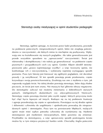 Elżbieta Woźnicka Stereotyp osoby niesłyszącej w opinii studentów pedagogiki Stereotyp, ogólnie ujmując, to żywione przez ludzi przekonania, powstałe na podstawie potocznych, niesprawdzonych opinii, które nie znajdują potwierdzenia w rzeczywistości, ale których mimo to niechętnie się pozbywamy. Wpływają one na kształtowanie się naszych poglądów. Ale takie generalizowanie jest przede wszystkim sposobem na „uproszczenie” rzeczywistości. Świat jest różnorodny i skomplikowany i nie należy go generalizować na podstawie często pozornych i przypadkowych cech czy opinii. Gordon Allport określił stereotypizowanie jako „prawo najmniejszego wysiłku”, a więc tworzymy opinie, nie konfrontując ich z rzeczywistością, i wybieramy najmniej wymagający sposób poznania. Poza tym łatwiej jest kierować się ogólnymi poglądami, niż dociekać prawdy i ją weryfikować. W ten sposób powstają proste przekonania, często krzywdzące swoją powierzchownością. Zwalniają nas one z myślenia o tym, jak naprawdę wygląda świat. Na takiej drodze powstają stereotypy, które dają złudne poczucie, że świat jest nam znany. Nie muszą to być głównie obrazy negatywne. Do stereotypów zaliczyć też możemy mniemania o dobrotliwych starszych paniach, inteligentnych okularnikach czy zdyscyplinowanych Niemcach. Stereotypy często powstają również jako wynik napięć, których przyczyną może być chęć bycia lepszym od innych. Rodzące się na tej podstawie frustracje i agresje przeobrażają się często w uprzedzenia. Powstające na tej drodze opinie i skłonności człowieka do uogólniania i ujednolicania prowadzą do niesprawdzonych opinii i stereotypów. Poza tym na powstawanie błędnych, mylących opinii może mieć wpływ potrzeba człowieka do wyróżniania się. Myślenie stereotypowe jest myśleniem nieracjonalnym, które powinno się zmieniać. Przykładów na stereotypowy, a więc uproszczony sposób postrzegania świata można by w tym miejscu przytoczyć bardzo wiele. Chociażby Anglia potocznie E. Woźnicka, Stereotyp osoby niesłyszącej w opinii studentów pedagogiki kojarzona jest jako kraj deszczowy, podczas gdy ten sam deszcz padający we Francji będzie po prostu normalnie padającym deszczem. A dwa miesiące upałów w tejże Anglii przeminie niezauważone i w żaden sposób nie wpłynie na zmianę powszechnie panującej opinii. Stereotypy gaszą nasz zapał umysłowy. Sposobem na ich przełamanie może być bliższe poznanie rzeczywistości, której mamy uproszczony obraz. Nie jest to rzeczą łatwą, czasami na nic zdają się rozsądne argumenty, statystyki i wyniki najnowszych badań. I tak, każdy „wie swoje”. Wprowadzenie do badań Podjęte badania mają na celu sprawdzenie, na ile studenci pedagogiki posługują się w ocenie osób niesłyszących ogólnymi opiniami. Czy powstały obraz ma znamiona stereotypu, uprzedzenia? Skąd czerpią wiedzę o osobach niesłyszących i jakie mają zdanie na temat ich życia w społeczeństwie, pracy zawodowej, życia osobistego, nauki itp.? Grupę badawczą stanowili studenci IV i V roku kierunku Pedagogika Wyższej Szkoły Humanistyczno-Ekonomicznej w Łodzi. Grupa badawcza liczyła 100 osób, w tym 16 mężczyzn i 84 kobiety, które dominują na tym sfeminizowanym kierunku. Przeprowadzone badania dotyczyły wyłącznie osób niesłyszących, a nie niedosłyszących, o czym studenci zostali poinformowani. Osoby niedosłyszące w komunikacji wspierają się resztkami słuchu. Zależnie od stopnia ubytku słuchu mogą, ale nie muszą korzystać z aparatów słuchowych. Zazwyczaj też posługują się językiem polskim znacznie lepiej od osób głuchych. Nie stanowi to jednak reguły. Obie grupy nie posiadają żadnych charakterystycznych cech zewnętrznych, wyróżniających je spośród innych osób. Identyfikacja osoby z niepełnosprawnością słuchu następuje zwykle dopiero przy próbie nawiązania kontaktu językowego (np. brak reakcji na mowę oraz inne sygnały dźwiękowe, szczątkowa lub słaba umiejętność mówienia, posługiwanie się językiem gestów). Ponadto osoby, które nie słyszą, zwykle w sposób szczególny obserwują twarz rozmówcy. Zauważenie aparatu słuchowego może pomóc w rozpoznaniu osoby głuchej lub słabosłyszącej, często jednak jest on niewidoczny, np. ukryty pod włosami. 202 E. Woźnicka, Stereotyp osoby niesłyszącej w opinii studentów pedagogiki Określenie „osoby głuche” — zamiast „niesłyszące” — jest zgodne z terminologią stosowaną w środowisku głuchych. Osoby całkowicie pozbawione słuchu traktują swoją głuchotę jako element identyfikacji społeczno-kulturowej, nie zaś jako rodzaj upośledzenia. Nie uważają się więc za niepełnosprawne czy upośledzone. Niesłyszący i jego cechy w opinii studentów Jednym z podstawowych pytań, jakie zadano studentom brzmiało: jak postrzegają osoby niesłyszące i jakie cechy im przypisują? Wśród cech najczęściej występujących wskazywali, że niesłyszący jest nieśmiały (56 wskazań), życzliwy (56), pracowity (54), uprzejmy (41), chętnie nawiązujący kontakt z osobami słyszącymi (38), zamknięty w sobie (29) i optymistycznie nastawiony do życia (24). Trzynaście osób wskazało, że izoluje się w świecie niesłyszących. Spośród cech negatywnych, które były zamieszczone na liście, studenci wskazali, że jest nieufny (38), pesymistą (7), niezaradny (5), hałaśliwy (4), nieżyczliwy wobec słyszących (2), ma roszczeniową postawę wobec państwa (2), agresywny (2). Nie pojawiły się wskazania takich cech, jak leniwy, brudny, arogancki. Z powyższych danych wynika, że niesłyszący są postrzegani jako osoby życzliwe i pracowite z pozytywnym usposobieniem i nastawieniem do innych. Wśród wartości, jakie w opinii studentów są istotne dla osoby niesłyszącej, znalazły się najczęściej: potrzeba zrozumienia przez osoby słyszące (66 wskazań),