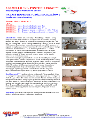 ADAMELLO SKI - PONTE DI LEGNO*** Miejsce pobytu: Włochy / Val di Sole WCZASY RODZINNE / OBÓZ MŁODZIEŻOWY Narciarsko – snowboardowy Termin: 10.02 – 19.02.2017 CENA: 1950 PLN/os. - osoba dorosła/młodzież w pok. 2 os. 1920 PLN/os - osoba dorosła/młodzież w pok 3/4 os.. 1750 PLN/os. - 3 i 4 dziecko w pokoju z rodzicami w wieku 9-13 lat 1490 PLN/os. - 3 i 4 dziecko w pokoju z rodzicami w wieku do 9 lat Adamello Ski - Tonale (z Lodowcem) + Pontedilegno + Temu - to trzy stacje narciarskie połączone siecią wyciągów i tras narciarskich o łącznej długości tras ponad 110 km. W Tonale mamy do dyspozycji 60 km tras - już powyżej granicy lasu - można tu także szusować po lodowcu Presena na ponad 3000 m n.p.m. Tutejsze trasy zadowolą z pewnością wszystkich narciarzy od zupełnie początkujących po zaawansowanych wytrawnych miłośników białego szaleństwa. Zjazd z lodowca - aż do Pontedilegno to ponad 11 km tras narciarskich. W Tonale dla snowboardzistów w sezonie działa snowpark, znajduje się tutaj również szkółka narciarska dla dzieci oraz śnieżny plac zabaw (za opłatą). W Tonale w sezonie w porze nocnej można również szusować na oświetlonym stoku. Możemy również wyruszyć na nartach z Tonale do Pontedilegno i dalej to Temu gdzie czekają głównie długie trasy w lasach, widoki na pobliskie szczyty Dolomitów zapierają dech w piersiach, a tutejsze zjazdy zadowolą szczególnie średnio i zaawansowanych narciarzy, choć i początkujący znajdą tu coś dla siebie. Na tutejsze stoki koniecznie zabrać należy aparat fotograficzny! Centralnym punktem stacji narciarskiej jest polana Valbione wraz z znajdującym się na niej jeziorem i schroniskiem - świetne miejsce na odpoczynek na słonecznym tarasie czy posiłek po jeździe na nartach. Hotel Cacciatori *** – położony jest w miejscowości Temu, zaledwie 800m od wyciągów w tej stacji narciarskiej, które łączą się z siecią tras i wyciągów z Ponte di Lego i Passo del Tonale oraz z lodowcem Presena, słowem mamy stąd dostępne aż 110km tras. Do wyciągów spod hotelu kursuje bezpłatny skibuss a sam hotel oddaje do Państwa dyspozycji restaurację serwującą domową włoską kuchnię, bar, recepcję, salę telewizyjną oraz narciarnię i parking oraz garaż. Hotel dysponuje 22 pokojami (dwu, trzy i czteroosobowymi), każdy z nich wyposażono w telewizję, telefon oraz łazienkę z wc. Większość posiada również balkon. Wyżywienie: śniadania – kontynentalne w formie bufetu, obiadokolacje dwu daniowe z bufetem sałatkowym i woda w karafkach. Organizator: Biuro Podróży „GRELAND TOUR” 70-741 Szczecin, Al. Wojska Polskiego 14, tel. +48(91) 434-51-35 , +48 881 345 135 e-mail: [email protected]; www.grelandtour.com.pl ; www.nartywalpach.com.pl Cena zawiera: - transport komfortowym autokarem z Warszawy - 7 noclegów w pokojach 2,3,4 os. - wyżywienie HB - ubezpieczenie KL, NNW i Ski - dojazd własny – zniżka 300 PLN Cena nie zawiera: - opłaty turystycznej (płatna w hotelu) – ok. 1,5 Euro/dzień/os. (od 14 roku życia) - napoje inne niż woda Dodatkowo dla dzieci i młodzieży codzienne jazdy z instruktorami w 3 grupach, oraz wieczorne gry i zabawy językowe z lektorami 1,5 godziny ( angielski i włoski). Dopłata 100 zł (za całość). Młodzież i dzieci, które jadące bez rodziców, podczas wyjazdu są pod pełną opiekę instruktorów i wychowawców. Dla chętnych dorosłych od godz. 14, jazdy doszkalające z instruktorem (w cenie) Skipass 6 dni AdamelloSki: - 210 Euro/os. Dorosły 191 Euro/os. Senior (urodzony przed 30.11.1951) 148 Euro/os. Junior (urodzony po 30.11.2000) Bezpłatny – Dziecko ur. Po 26.11.2008 WAŻNE INFORMACJE: obowiązkowo należy zabrać ze sobą ważny paszport lub dowód osobisty, ciepłą odzież, sprzęt snowboardowy, narciarski odpowiednią kwotę na wydatki własne, np. lunch na stoku. Dopłata dla dzieci i młodzieży: 100 zł za codzienne szkolenie narciarskie z instruktorami do godz. 13 i zajęcia wieczorne dla dzieci i młodzieży. Obowiązkowy kask i kijki. Przy grupie co najmniej 10 snowboardzistów możemy zabrać dodatkowego instruktora. Prosimy o wyrobienie karty EKUZ – ułatwia korzystanie z usług opieki zdrowotnej we Włoszech. Wyjazd AUTOKARU w piątek 10 lutego 2017 r. o godz. 18:00 - zbiórka godz. 17:00 Al. Armii Krajowej 10., Warszawa. Stacja Benzynowa SHELL uwaga; wjazd tylko od ul. Klaudyny. Każda osoba do autokaru może zabrać, 1 parę nart lub 1 snowboard + 1 parę butów zapakowane w oddzielny pokrowiec, bagaż podstawowy i podręczny-waga do 20 kg !. Organizator: Biuro Podróży „GRELAND TOUR” 70-741 Szczecin, Al. Wojska Polskiego 14, tel. +48(91) 434-51-35 , +48 881 345 135 e-mail: [email protected]; www.grelandtour.com.pl ; www.nartywalpach.com.pl