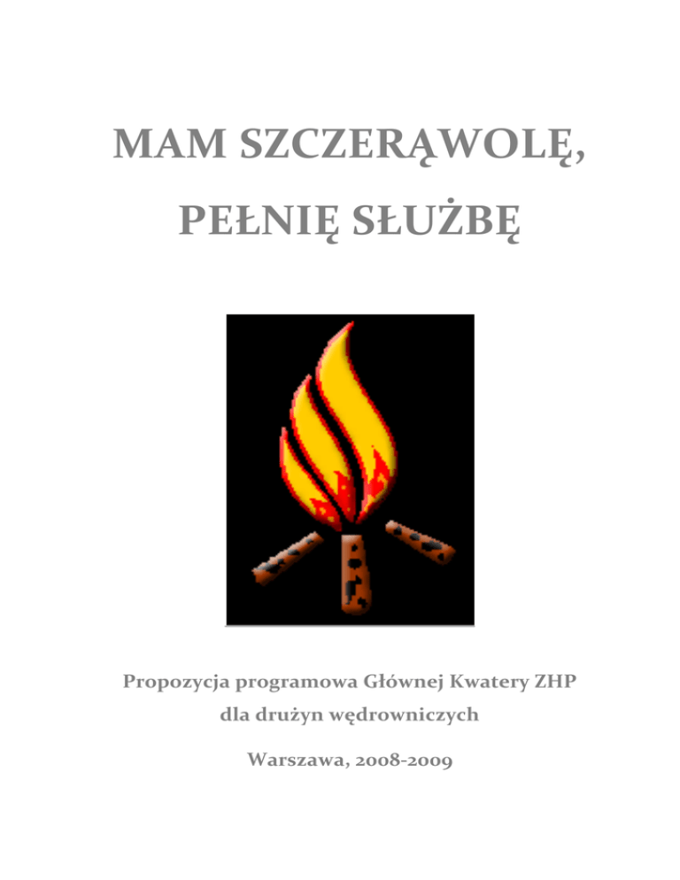 MAM SZCZERĄWOLĘ, PEŁNIĘ SŁUŻBĘ Propozycja programowa Głównej Kwatery ZHP dla drużyn wędrowniczych Warszawa, 2008-2009 2 Mam Szczerą Wolę , pełnię służbę Propozycja programowa Głównej Kwatery ZHP dla drużyn harcerskich i starszoharcerskich Warszawa, 2008-2009 pod redakcją Marcina Binasiaka i Emilii Kulczyk Autorzy: phm. Gracja Bober, hm. Iwona Borczyńska-Balcerska, phm. Paweł Chmielewski, hm. Elżbieta Czapara, hm. Stanisław Dubiel, hm. Tomasz Fliszkiewicz, phm. Anna Książek, hm. Emilia Kulczyk, hm. Sylwia Lenkiewicz, hm. Adrian Łaskarzewski, hm. Maciej Młynarczyk, pwd. Katarzyna Paszkowska, phm. Piotr Pieniak, hm. Mariusz Przybyła, pwd. Arkadiusz Przybysz, hm. Agnieszka Rytel, hm. Ewa Sidor, pwd. Sebastian Siębora, pwd. Paulina Sornat, hm. Jana Świnarska, phm. Martyna Tochowicz, hm. Mateusz Żukowski SPIS TREŚCI - NASZE WARTOŚCI - MAM SZCZERĄ WOLĘ, OBIECUJĘ Propozycja dla gromad zuchowych - MAM SZCZERĄ WOLĘ, PRZYRZEKAM Propozycja dla drużyn harcerskich i starszoharcerskich - MAM SZCZERĄ WOLĘ, PEŁNIĘ SŁUŻBĘ Propozycja dla drużyn wędrowniczych - RÓŻNE POMYSŁY NA PRACĘ Z PRAWEM HARCERSKIM - NASZE PRAWA Konwencja o Prawach Dziecka Wydział Programowy Głównej Kwatery ZHP 3 Mam Szczerą Wolę , pełnię służbę Tak już jest w życiu, że ceni się to, co jest trudne do zdobycia, szanuje się to, co wymaga dla siebie szacunku. My, które prowadzimy pracę harcerską, które ją znamy i rozumiemy, zdajemy sobie sprawę z tego, jak wiele warte, jak zasługujące na szacunek jest Harcerstwo. Ale czy umiemy wymagać szacunku dla Harcerstwa od samych siebie, od naszych dziewcząt, od przyjaciół, od ludzi obojętnych, od przeciwników? Znamy dobrze wskazania naszego Prawa, choćby te najprostsze: punktualność, słowność, oszczędność... Czy dostatecznie duży wysiłek woli wkładamy w to, by wskazania te z kart papieru wchodziły w życie? W życie nasze, wewnątrz organizacji i w życie społeczeństwa? Spóźniłam się czy ktoś się spóźnił na wyznaczony dzień, godzinę... To trudno, to drobiazg, wystarczy proste „przepraszam cię”. Ale kto przeprosi obrażoną zasadę harcerską? Podjęłam się, nie wykonałam – trudno, tak się złożyło, to nie ode mnie zależało. Ale kto naprawi uszkodzone zaufanie z naszego Prawa płynące? Prawo mówi, przyrzeczenie trwa, pozdrowienie przypomina... Czyż to tylko puste słowa? Wzmocnijmy naszą sprężystość, naszą gotowość. Stawiajmy wymagania sobie i innym, wyciągajmy konsekwencje z naszego i innych postępowania, wychowujmy się wzajemnie. Szanujmy Harcerstwo i żądajmy dla niego szacunku. E. Grodecka, „Nasze prawo, przyrzeczenie i pozdrowienie” Wydział Programowy Głównej Kwatery ZHP 4 Mam Szczerą Wolę , pełnię służbę DRUHNO DRUŻYNOWA! DRUHU DRUŻYNOWY! Na Tobie spoczywa szczególna odpowiedzialność – odpowiedzialność harcerskiego wychowawcy. Jesteś opiekunem i rzecznikiem spraw dzieci i młodzieży w życiu codziennym, rzecznikiem wychowania harcerskiego – świadomym wychowawcą. Przed Tobą bardzo trudne zadanie: pomoc we wszechstronnym rozwoju, uczenie współpracy i wreszcie – sprawianie, by wartości zawarte w Prawie i Obietnicy Zucha, Prawie i Przyrzeczeniu Harcerskim były drogowskazem w życiu Twoich podopiecznych. Kiedy nosisz granatowy sznur na mundurze, pełnisz najważniejszą funkcję w naszej organizacji. To od Ciebie zależy, jakie będzie najmłodsze pokolenie, to Ty pokazujesz harcerzom ich prawa, uczysz demokracji, wskazujesz im ich możliwości. Prawo Harcerskie, Prawa Dziecka – to prawa dotyczące wartości, które szczególnie musisz szanować. To przecież z Ciebie biorą przykład i Ciebie słuchają. Jesteś tym, kto wskazuje, jak w życiu postępować. Zgodnie z metodą harcerską – nie nakazujesz, ale pomagasz wejść na właściwą ścieżkę. Oddajemy w Twoje ręce materiał, który ma za zadanie pomóc Ci w niełatwej pracy wychowawczej. Znajdziesz w nim wskazówki i pomysły pomagające w kształtowaniu młodych ludzi w Twojej gromadzie lub drużynie. Dziękuję wszystkim, którzy przyczynili się do przygotowania propozycji programowej „Mam szczerą wolę”, jej autorom i redaktorom, a szczególnie hm. Adamowi Kocherowi, twórcy koncepcji programu dotyczącego harcerskich wartości, który jako zastępca naczelnika ZHP zainicjował i wspierał pracę nad tym materiałem. hm. Małgorzata Sinica Naczelnik Związku Harcerstwa Polskiego Wydział Programowy Głównej Kwatery ZHP 5 Mam Szczerą Wolę , pełnię służbę KOMENTARZ DO PRZYRZECZENIA I PRAWA HARCERSKIEGO Mam szczerą wolę to znaczy dobrowolnie, bez niczyjego nakazu, bez żadnego przymusu, całym życiem, ze wszystkich sił mego ducha, z całego serca, wykorzystując wszystkie dane mi możliwości pełnić służbę Bogu, który stanowi uosobienie najwyższych ideałów, takich jak miłość, prawda, dobro, sprawiedliwość, wolność, piękno, przyjaźń i braterstwo, wiara, nadzieja. Ideały te łączą wszystkich ludzi dobrej woli, niezależnie od pochodzenia, narodowości, wyznania, wywodzą się z norm moralnych opartych na uniwersalnych, etycznych i kulturowych tradycjach chrześcijaństwa. Wyznawany przeze mnie system wartości kształtuję samodzielnie, podążając w kierunku wskazanym przez Prawo Harcerskie. Pragnę służyć Polsce, ojczyźnie moich przodków, o której honor, niepodległy byt, tradycje i kulturę walczyli czynem i słowem, którą otrzymałem w spadku jako bezcenną wartość mego pokolenia, którą z całym jej bogactwem duchowym i materialnym mam przekazać moim następcom. Stale poszerzam świat mych myśli i uczuć, wierny zasadzie, że więcej wiedzieć, to głębiej pokochać. Szanuję prawa innych państw i narodów. Chcę nieść chętną pomoc bliźnim nie tylko wtedy, gdy o pomoc proszą, ale zawsze wtedy, gdy czujnym okiem dostrzegę, że na drodze mego życia stanął ktoś, kto potrzebuje pomocy, opieki, wsp