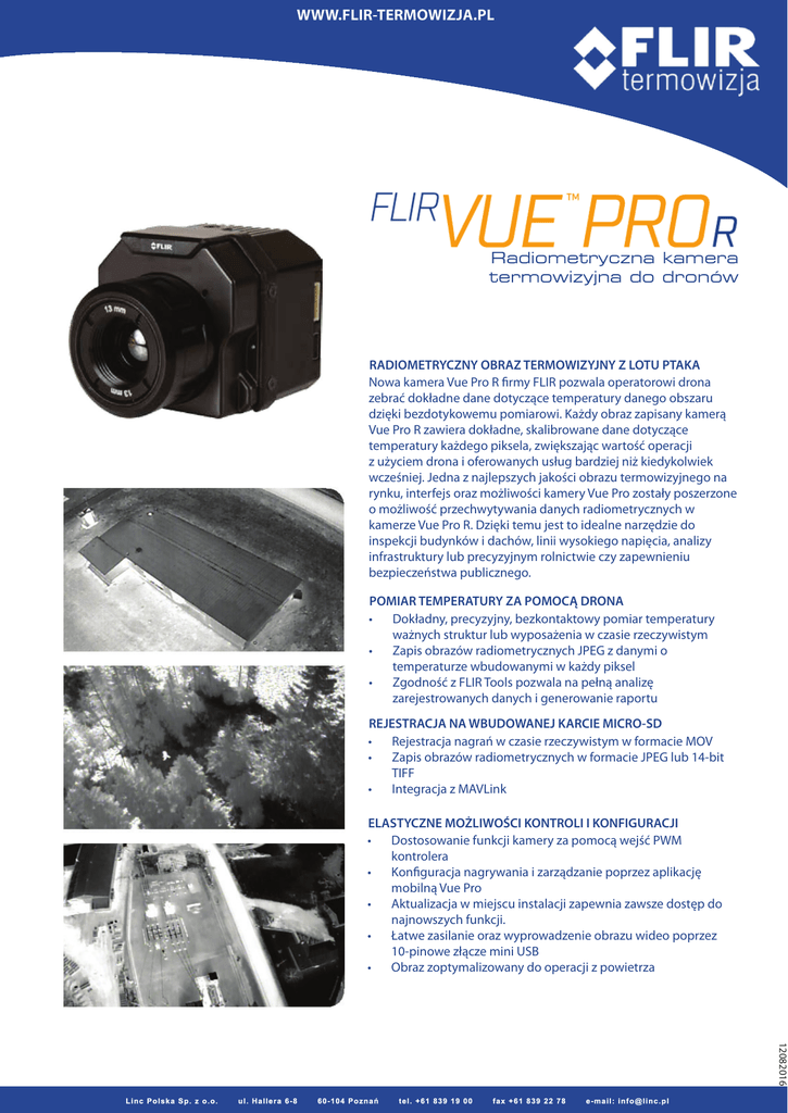 Radiometryczna kamera termowizyjna do dronów RADIOMETRYCZNY OBRAZ TERMOWIZYJNY Z LOTU PTAKA Nowa kamera Vue Pro R firmy FLIR pozwala operatorowi drona zebrać dokładne dane dotyczące temperatury danego obszaru dzięki bezdotykowemu pomiarowi. Każdy obraz zapisany kamerą Vue Pro R zawiera dokładne, skalibrowane dane dotyczące temperatury każdego piksela, zwiększając wartość operacji z użyciem drona i oferowanych usług bardziej niż kiedykolwiek wcześniej. Jedna z najlepszych jakości obrazu termowizyjnego na rynku, interfejs oraz możliwości kamery Vue Pro zostały poszerzone o możliwość przechwytywania danych radiometrycznych w kamerze Vue Pro R. Dzięki temu jest to idealne narzędzie do inspekcji budynków i dachów, linii wysokiego napięcia, analizy infrastruktury lub precyzyjnym rolnictwie czy zapewnieniu bezpieczeństwa publicznego. POMIAR TEMPERATURY ZA POMOCĄ DRONA • Dokładny, precyzyjny, bezkontaktowy pomiar temperatury ważnych struktur lub wyposażenia w czasie rzeczywistym • Zapis obrazów radiometrycznych JPEG z danymi o temperaturze wbudowanymi w każdy piksel • Zgodność z FLIR Tools pozwala na pełną analizę zarejestrowanych danych i generowanie raportu REJESTRACJA NA WBUDOWANEJ KARCIE MICRO-SD • Rejestracja nagrań w czasie rzeczywistym w formacie MOV • Zapis obrazów radiometrycznych w formacie JPEG lub 14-bit TIFF • Integracja z MAVLink ELASTYCZNE MOŻLIWOŚCI KONTROLI I KONFIGURACJI • Dostosowanie funkcji kamery za pomocą wejść PWM kontrolera • Konfiguracja nagrywania i zarządzanie poprzez aplikację mobilną Vue Pro • Aktualizacja w miejscu instalacji zapewnia zawsze dostęp do najnowszych funkcji. • Łatwe zasilanie oraz wyprowadzenie obrazu wideo poprzez 10-pinowe złącze mini USB • Obraz zoptymalizowany do operacji z powietrza 12082016 Specyfikacja Ogólne Przetwornik obrazu Niechłodzony mikrobolometr VOx Rozdzielczość przetwornika 640 x 512 336 x 256 Opcje obiektywów (FOV dla pełnego obrazu z przetwornika) 9mm; 69° x 56° 13mm; 45° x 37° 19mm; 32° x 26° 6,8mm; 45° x 35° 9mm; 35° x 27° 13mm; 25° x 19° Opcje obiektywów * (FOV dla wyjścia NTSC) 9mm; 62° x 49° 13mm; 45° x 35° 19mm; 32° x 24° 6,8mm; 44° x 33° 13mm; 34° x 26° 19mm; 24° x 18° Pasmo 7,5 - 13,5 µm Pełna liczba klatek 30 Hz (NTSC); 25 Hz (PAL) Eksportowalna ilość klatek 7,5 Hz(NTSC); 8,3 Hz (PAL) Dokładność pomiarowa +/- 5°C lub 5% odczytu Cechy fizyczne Rozmiar 574 mm x 445 mm (razem z obiektywem) Waga 92 g - 114 g (w zależności od konfiguracji) Otwory montażowe 2x M2x0,4 z każdej strony i u dołu 1x 1/4-20 - otwór gwintowany Ustawienia obrazu Optymalizacja obrazu do dronów Tak Digital Detail Enhancement (DDE) Tak - poprzez aplikację mobilną Odwracanie obrazu Tak - poprzez aplikację mobilną Polaryzacja (black hot/white hot) oraz palety barw Tak - poprzez aplikację mobilną FLIR Vue Pro R z dołączonym modułem zasilania/wideo Interfejsy Zasilanie Pobór mocy (max 2,5W podczas działania przesłony przez ok 0,5s) 4,8-6,0 V <1,2 W ~1,0 W Środowisko pracy Temperatura pracy -20°C do +50°C Temperatura przechowywania -55°C do +95°C Maksymalna wysokość pracy 12200 m Moduł zasilania/wideo Zasilanie 5 VDC - 28 VDC Zabezpieczenie przed zmianą polaryzacji Tak Analogowe wyjście wideo Tak Wyjście HDMI 1280 x 720 @ 50Hz, 60Hz * Z uwagi na to, że rozdzielczość analogowego wyjścia wideo (640x480 oraz 320x240) jest niższa niż pełna rozdzielczość przetwornika przechwytywana podczas zapisu obrazów oraz wideo, pole widzenia jest również mniejsze. Obie wartości są wskazane w tabeli tak, aby umożliwić dobór odpowiedniego obiektywu, który w pełni odpowiada przewidzianemu zastosowaniu. Moduł zasilania/wideo 12082016 Moduł zasilania/wideo sprawia, że integracja kamer FLIR Vue Pro oraz Vue Pro R jest teraz jeszcze łatwiejsza. Jest to 10 pinowe złącze mini USB pozwalające na zasilanie wyższym zakresem napięcia oraz posiadające zabezpieczenie przed zmianą polaryzacji. Wyposażony jest również w analogowe wyjście wideo i dostęp do danych zarchiwizowanych w kamerze. Złącze micro-HDMI pozwala na wyprowadzenie cyfrowego obrazu dla systemów takich jak np: DJI Lightbridge lub 3DR Solo. Cały ten zestaw ma wymiary 11mm i wagę ok 15 gramów.