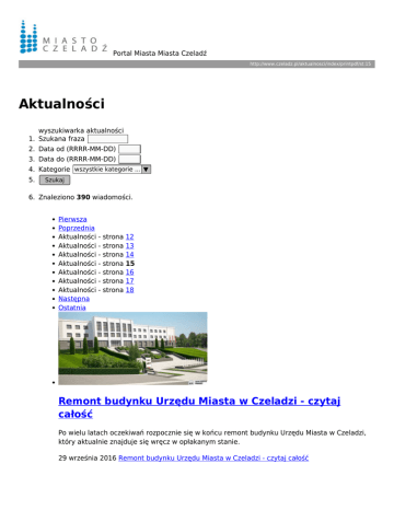 Portal Miasta Miasta Czeladź http://www.czeladz.pl/aktualnosci/index/printpdf/st:15 Aktualności wyszukiwarka aktualności 1. Szukana fraza 2. Data od (RRRR-MM-DD) 3. Data do (RRRR-MM-DD) 4. Kategorie wszystkie kategorie ... ▼ 5. Szukaj 6. Znaleziono 390 wiadomości. Pierwsza Poprzednia Aktualności - strona 12 Aktualności - strona 13 Aktualności - strona 14 Aktualności - strona 15 Aktualności - strona 16 Aktualności - strona 17 Aktualności - strona 18 Następna Ostatnia Remont budynku Urzędu Miasta w Czeladzi - czytaj całość Po wielu latach oczekiwań rozpocznie się w końcu remont budynku Urzędu Miasta w Czeladzi, który aktualnie znajduje się wręcz w opłakanym stanie. 29 września 2016 Remont budynku Urzędu Miasta w Czeladzi - czytaj całość Uniwersytet Dziecięcy w Czeladzi - czytaj całość Studenci Uniwersytetu Dziecięcego w Czeladzi przywitają nowy rok akademicki 1 października. Tego dnia wystartuje kolejna edycja Uniwersytetu Dziecięcego w Czeladzi. 29 września 2016 Uniwersytet Dziecięcy w Czeladzi - czytaj całość Oddaj krew - to takie proste - czytaj całość Regionalne Centrum Krwiodawstwa i Krwiolecznictwa w Katowicach organizuje w najbliższy poniedziałek, tj. 3 października 2016 r. w godz. 10.00-14.00 akcję oddawania krwi. Ambulans Regionalnego Centrum Krwiodawstwa i Krwiolecznictwa stanie na parkingu przy ul. Rynkowej. 29 września 2016 Oddaj krew - to takie proste - czytaj całość Country na Rynku - czytaj całość Już w piątek, 30 września czeladzki Rynek wypełni się dźwiękami w stylu country. 29 września 2016 Country na Rynku - czytaj całość Pomoc żywnościowa dla mieszkańców Czeladzi - czytaj całość Od 27.09.2016 r. (wtorek) mieszkańcy Czeladzi mogą uzyskać pomoc żywnościową w ramach Programu Operacyjnego Pomoc Żywnościowa 2014-2020 (PO PŻ), który współfinansowany jest ze środków Europejskiego Funduszu Pomocy Najbardziej Potrzebującym (Fund for European Aid to the Most Deprived – FEAD). 29 września 2016 Pomoc żywnościowa dla mieszkańców Czeladzi - czytaj całość Komunikat w związku z remontem UM - czytaj całość Informujemy mieszkańców Czeladzi, że od 29 września 2016 r. Programy: Rodzinka 2+, Czeladzki Senior 60+, Karta Dużej Rodziny realizowane będą w siedzibie Miejskiego Ośrodka Pomocy Społecznej. 29 września 2016 Komunikat w związku z remontem UM - czytaj całość "Senioralia 2016" - czytaj całość Od 1 do 8 października w Czeladzi trwać będą Czeladzkie Senioralia 2016. 28 września 2016 "Senioralia 2016" - czytaj całość Czeladzianie upamiętnili Dzień Podziemnego Państwa Polskiego - czytaj całość Władze miasta i przedstawiciele Polskiego Związku Kombatantów oddały hołd poległym, składając kwiaty i zapalając znicze pod obeliskiem. 27 września 2016 Czeladzianie upamiętnili Dzień Podziemnego Państwa Polskiego - czytaj całość „W Czeladzi zagrałem pierwsze dźwięki...” - czytaj całość Benefis z okazji 80. urodzin Henryka Kuźniaka. 27 września 2016 „W Czeladzi zagrałem pierwsze dźwięki...” - czytaj całość Spotkanie z Katarzyną Zychlą - czytaj całość Miejska Biblioteka Publiczna (ul. 1 Maja 27) serdecznie zaprasza na spotkanie z Katarzyną Zychlą, które odbędzie się 4 października o godz. 10.00 26 września 2016 Spotkanie z Katarzyną Zychlą - czytaj całość Pierwsza Poprzednia Aktualności - strona 12 Aktualności - strona 13 Aktualności - strona 14 Aktualności - strona 15 Aktualności - strona 16 Aktualności - strona 17 Aktualności - strona 18 Następna Ostatnia