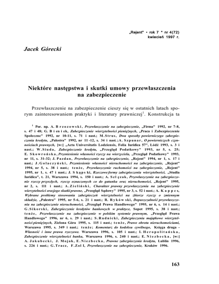 „Rejent" • rok 7 * nr 4(72) kwiecień 1997 r. Jacek Górecki Niektóre następstwa i skutki umowy przewłaszczenia na zabezpieczenie Przewłaszczenie na zabezpieczenie cieszy się w ostatnich latach sporym zainteresowaniem praktyki i literatury prawniczej1. Konstrukcja ta 1 Por. np. A. B r z o z o w s k i , Przewłaszczenie na zabezpieczenie, „Firma" 1992, nr 7-8, s. 47 i 48; G. B i en i ek, Zabezpieczenie wierzytelności pieniężnych, „Praca i Zabezpieczenie Społeczne" 1992, nr 10-11, s. 71 i nast.; M . S t r u s , Dwa sposoby powierniczego zabezpieczenia kredytu, „Palestra" 1992, nr 11 -12, s. 34 i nast. ;A. S z p u n a r , O powierniczych czynnościach prawnych, [w:] „Acta Universitatis Lodziensis, Folia Iuridica 57", Łódź 1993, s. 3 i nast.; W . S i u d a , Zabezpieczenie kredytu, „Przegląd Podatkowy" 1993, nr 5, s. 25; E. S k o w r o ń s k a , Przeniesienie własności rzeczy na wierzyciela, „Przegląd Podatkowy" 1993, nr 11, s. 31-32; J. P a z d a n , Przewłaszczenie na zabezpieczenie, „Rejent" 1994, nr 1, s. 17 i nast.; J . G o l a c z y ń s k i , Przeniesienie własności nieruchomości na zabezpieczenie, „Rejent" 1994, nr 5, s. 38 i nast.; t e n ż e , Przewłaszczenie ruchomości na zabezpieczenie, „Rejent" 1995, nr 1, s. 47 i nast.; J. S k ą p s ki, Rzeczowe formy zabezpieczenia wierzytelności, „Studia Iuridica", t. 21, Warszawa 1994, s. 150 i nast.; A. S z l ę z a k , Przewłaszczenie na zabezpieczenie rzeczy przyszłych, rzeczy oznaczonych co do gatunku oraz nieruchomości, „Rejent" 1995, nr 2, s. 111 i nast.; A . Z i e l i ń s k i , Charakter prawny przewłaszczenia na zabezpieczenie wierzytelności orazjego skutki prawne, „Przegląd Sądowy" 1995, nr 3, s. 52 i nast.; A. K a p p c s, Wybrane problemy stosowania zabezpieczeń wierzytelności na zbiorze rzeczy o zmiennym składzie, „Palestra" 1995, nr 5-6, s. 21 i nast.; R. R y k ó w s k i , Dopuszczalność przewłaszczenia na zabezpieczenie nieruchomości, „Przegląd Prawa Handlowego" 1995, nr 6, s. 14 i nast.; G . S i k o r s k i , Zabezpieczenie kredytów bankowych w praktyce, Sopot 1995, s. 38 i nast.; t e n ż e , Przewłaszczenie na zabezpieczenie w polskim systemie prawnym, „Przegląd Prawa Handlowego" 1996, nr 6, s. 29 i nast.; S . R u d n i c k i , Zabezpieczenia majątkowe wierzytelności pieniężnych, Zielona Góra 1995, s. 115 i nast.; t e n ż e , Prawo obrotu nieruchomościami, Warszawa 1995, s. 349 i nast.; t e n ż e ; Komentarz do kodeksu cywilnego, Księga druga Własność i inne prawa rzeczowe. Warszawa 1996, s. 105 i nast.; I. H e r o p o l i t a ń s k a , Zabezpieczenie wierzytelności banku, Warszawa 1996, s. 240 i nast.; E. N i e z b e c k a , [w:] A. J a k u b e c k i , J. M o j a k , E . N i e z b e c k a , Prawne zabezpieczenie kredytu, Lublin 1996, s. 226 i nast.; G . T r a c z , F . Z o l I, Przewłaszczenie na zabezpieczenie, Kraków 1996. 163 Jacek Górecki polega na zabezpieczeniu wierzytelności w ten sposób, że dłużnik przenosi na wierzyciela własność rzeczy, przy tym strony ustalają, iż po wygaśnięciu wierzytelności własność ta wróci do dłużnika. Wynikiem zainteresowania tą instytucją prawną jest powszechnie przyjęta teza o dopuszczalności przewłaszczenia ruchomości na zabezpieczenie. Natomiast w przypadku nieruchomości kwestia ta budzi wątpliwości zarówno w orzecznictwie2, jak i piśmiennictwie3. Osobiście podzielam pogląd o dopuszczalności przewłaszczenia nieruchomości w celu zabezpieczenia i aby nie powtarzać przemawiających za tym argumentów odsyłam do wypowiedzi zwolenników tego poglądu. Za należycie wyjaśnione można również uznać kwestie związane z charakterem prawnym przewłaszczenia na zabezpieczenie, a także samą jego konstrukcję. Rzadko natomiast porusza się zagadnienia związane ze skutkami prawnymi umowy stanowiącej podstawę dla tego sposobu zabezpieczenia wierzytelności. Celem niniejszej pracy jest przedstawienie wybranych problemów pojawiających się przy interpretacji tego rodzaju umów, jak również próba określenia ich następstw prawnych. Najpierw trzeba jednak pokrótce omówić składniki treści umowy przewłaszczenia na zabezpieczenie. 2 Por. uchwały Sądu Najwyższego z dnia 3 lutego 1960 roku (3 CO 27/57) OSPiKA 1961, poz. 75 z glosą W. S i e d 1 e c k i e g o i z dnia 24 kwietnia 1964 roku (II CR 178/64) OSPiKA 1965, poz. 229 z glosą A . O h a n o w i c z a . 3 Za dopuszczalnością przewłaszczenia nieruchomości na zabezpieczenie opowiedzieli się: A. O h a n o w i c z w glosie do cytowanego wyżej orzeczenia Sądu Najwyższego; K. G a n d o r, Prawa podmiotowe tymczasowe fekspektatywyj, Wrocław-Warszawa-Kraków 1968, s. 26; J.S. P i ą t o w s k i, [w:] System prawa cywilnego, t. 2, Prawo własności i inne prawa rzeczowe, red. J. Ignatowicz, Ossolineum 1977, s. 233; A . B r z o z o w s k i , Przewłaszczenie..., s. 47; M . S t r u ś , Dwa sposoby..., s. 36 i nast.; J . P a z d a n , Przewłaszczenie..., s. 20 i 21; J . G o ł a c z y ń s k i , Przeniesienie..., s. 52; A . S z l ę z a k , Przewłaszczenie..., s. 125 i nast.; R. R y k o w s k i , Dopuszczalność..., s. 14; E. D r o z d , [w:] A. O l e s z k o , E. D r o z d , Hipoteka w praktyce, Poznań-Kluczbork 1995, s. 36; G . T r a c z , F . Z o l l , Przewłaszczenie..., s. 106-107 z zastrzeżeniem, że konieczną przesłanką przeniesienia własności jest wpis do księgi wieczystej. Przeciwne stanowisko zajęli: W. S i e d l e c k i w glosie do cytowanego wyżej orzeczenia Sądu Najwyższego; J. S k ąp s k i, Przewłaszczenie na zabezpieczenie, „Studia Cywilistyczne" t. 13-14, Kraków 1969, s. 322 i 323; t e n ż e , Rzeczowe..., s. 152; A. S z p u n a r , O powierniczych..., s. 13; E . Ł ę t o w s k a , Podstawy prawa cywilnego. Warszawa 1994, s. 231; B. N i c m i r k a, „Monitor Prawniczy" 1996, nr 2, s. 80. 164 Niektóre następstwa i skutki umowy przewłaszczenia... Należy rozpo