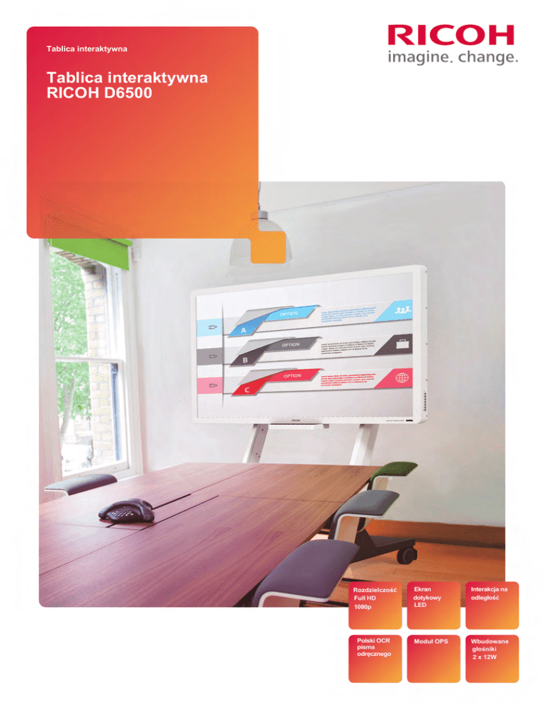 Tablica interaktywna Tablica interaktywna RICOH D6500 Rozdzielczość Full HD 1080p Polski OCR pisma odręcznego Ekran dotykowy LED Interakcja na odległość Moduł OPS Wbudowane głośniki 2 x 12W Kompletne rozwiązanie dla interaktywnych prezentacji Szybkie i efektywne opracowanie koncepcji rozwoju i komunikacji jest kluczowe w sektorze biznesowym i edukacyjnym. W nowoczesnym biurze współpraca z wykorzystaniem najnowszych metod pracy jest niezbędna. Tablica interaktywna D6500 firmy Ricoh usprawnia, ułatwia szkolenia i współpracę co umożliwia zaangażowanie i organizację grupy użytkowników. Mając możliwość wyboru modelu z kontrolerem lub bez, każde rozwiązanie jest na wyciągnięcie ręki. Wyświetlacz LCD o rozdzielczości Full HD 1080p, z podświetleniem LED zapewnia doskonałą ostrość widzenia Kontroler Ricoh umożliwia zdalną komunikację i podłączenie do tablicy D6500 8 komputerów lub 10 tabletów Intuicyjna obsługa z kontrolerem Ricoh zapewnia proste zarządzanie z wykorzystaniem przyjaznej ikonografiki Proste wyświetlenie informacji za pomocą pisma odręcznego lub elektronicznego pisaka z kontrolerem Ricoh Dodatkowe opcje wyboru systemu operacyjnego umożliwiają korzystanie z interaktywnego oprogramowania i aplikacji Elastyczny wybór opcji systemu operacyjnego i oprogramowania Twój wybór w jaki sposób działa kontroler Możesz wybrać konfigurację D6500 dopasowaną do Twojego budżetu oraz potrzeb. Podczas obsługi bez kontrolera możesz użyć systemu operacyjnego z komputera do uruchomienia aplikacji, zapewniając ekonomiczny sposób prezentacji. Opcjonalnie można wybrać kontroler OPS z Windows™8. Umożliwia to wykorzystanie pakietu aplikacji dedykowanych do tablic interaktywnych. Dodatkowa opcja w postaci kontrolera OPS bez systemu operacyjnego, pozwala na wykorzystanie D6500 z preferowanym systemem Windows. Oznacza to, że można dodać własne wybrane aplikacje, skonfigurować ustawienia sieci i tablicę w zakresie bezpieczeństwa. Korzystając z tablicy D6500 dostarczonej z kontrolerem OPS można skorzystać z aplikacji interaktywnej tablicy dostarczając rozwiązanie typu "all-in-one". Wyświetlaj dane z komputera, iPada, tabletu lub smartfona na tablicy i rozpocznij interaktywną pracę. Jeśli masz aplikację, którą chcesz użyć z tablicą D6500, Ricoh OS Free Controller umożliwia wykorzystanie jej kontroler OPS bez systemu operacyjnego. Możesz również skonfigurować własne ustawienia sieci i ochrony Windows, zgodnie z zasadami korporacyjnymi. Interaktywna nauka dla uczniów szkół podstawowych i studentów Młody umysł szybciej przyswaja naukę poprzez intereakcję i dyskusję. Dzięki tablicy D6500 lekcje stają się ciekawsze i łatwiejsze do zapamiętania. Na tablicy interaktywnej D6500 możemy wyświetlić grafikę, zdjęcia, wykresy i wideo z adnotacjami. Wszystkie lekcje przeprowadzone graficznie zostają zapisane i mogą być udostępnione w formacie PDF. Przedstaw studentom swoje aplikacje Tablica D6500 dostarczana jest bez kontrolera OPS, umożliwia wykorzystanie swoich aplikacji i dzielenie się nimi ze studentami. Zapomocą D6500 wyświetlasz grafikę, opisujesz programy i schematy. Tablica D6500 wyświetla obrazy rozdzielczości Full HD 1080p, można również oglądać filmy w Blue-ray i odtwarzać obrazy w wysokiej rozdzielczości z innych urządzeń. Nauka i zabawa Zajęcia mogę być teraz poprowadzone jako interaktywne sesje, a studentów wydziału sztuk pięknych zaangażować w rysowanie impresjonistyczne. Grupy robocze mogą wykorzystać tablicę D6500 do odkrywania nowych projektów. Na lekcjach historii można wykorzystać przesłane na tablicę dokumenty i na ekranie zaznaczyć kluczowe informacje. Każda lekcja zostaje zapisana, a później udostępniona studentom. Spontaniczne notatki zostaną zapisane i udostępnione Podczas pisania na ekranie tablicy, można skorzystać z funkcji OCR, aby przekonwertować napisany tekst. Tekst OCR zostaje zapisany, co umożliwia przeszukiwanie zanotowanych wcześniej notatek i komentarzy. Tablica obsługuje jednocześnie rysowanie, studenci mogą tworzyć co tylko sobie wymyślą. W zależności od używanego oprogramowania, możemy przesuwać, edytować oraz zmniejszać wielkości grafiki na ekranie. Dzieląc się wiedzą i kreatywnością wzmacniasz pozycję firmy W jaki sposób można wykorzystać i udostępnić cenną wiedzę w grupach roboczych? Potrzebujesz urządzenia, które umożliwi każdemu współpracę i zaangażowanie podczas sesji "burzy mózgów"? A może potrzebujesz przekazać lub uzyskać cenne informacje od pracowników z innych lokalizacji. Tablica D6500 to odpowiedź na Twoje potrzeby: interaktywna platforma, umożliwiająca udostępnianie i rozwijanie pomysłów. Po zakończonej prezentacji, masz możliwość zapisania swoich pomysłów w folderze lub wysłania ich na wskazany e-mail i wykorzystanie ich w przyszłości. Zdalna komunikacja Za pomocą połączenia internetowego bez konieczności instalacji oddzielnego serwera i oprogramowania możesz udostępnić treść tablicy na 8 tablicach jednocześnie. Każda tablica oferuje interaktywną kontrolę każdemu uczestnikowi w każdej lokalizacji. Dodatkowo użytkownicy komputerów lub tabletów mogą zalogować się, aby za pomocą przeglądarki zobaczyć prezentację. Dla użytkowników iPadów aplikacja jest również dostępna*. Bezpieczne prezentacje biznesowe Po wprowadzeniu przez uczestników kodu PIN, tablica D6500 umożliwia bezpieczne udostępnianie projektów biznesowych. Po wyłączeniu zasilania tablica D6500 automatycznie przechodzi w tryb oczekiwania, a wszystkie dane zostają automatycznie usunięte. W tablicy D6500 jest zainstalowany program antywirusowy McAfee™. Udostępnianie informacji i szkolenia stają się jeszcze prostsze Używając opcjonalnego elektronicznego pisaka, możesz pisać, rysować, zmieniać wielkość i przesuwać diagramy, grafikę i obrazy. Wykresy i