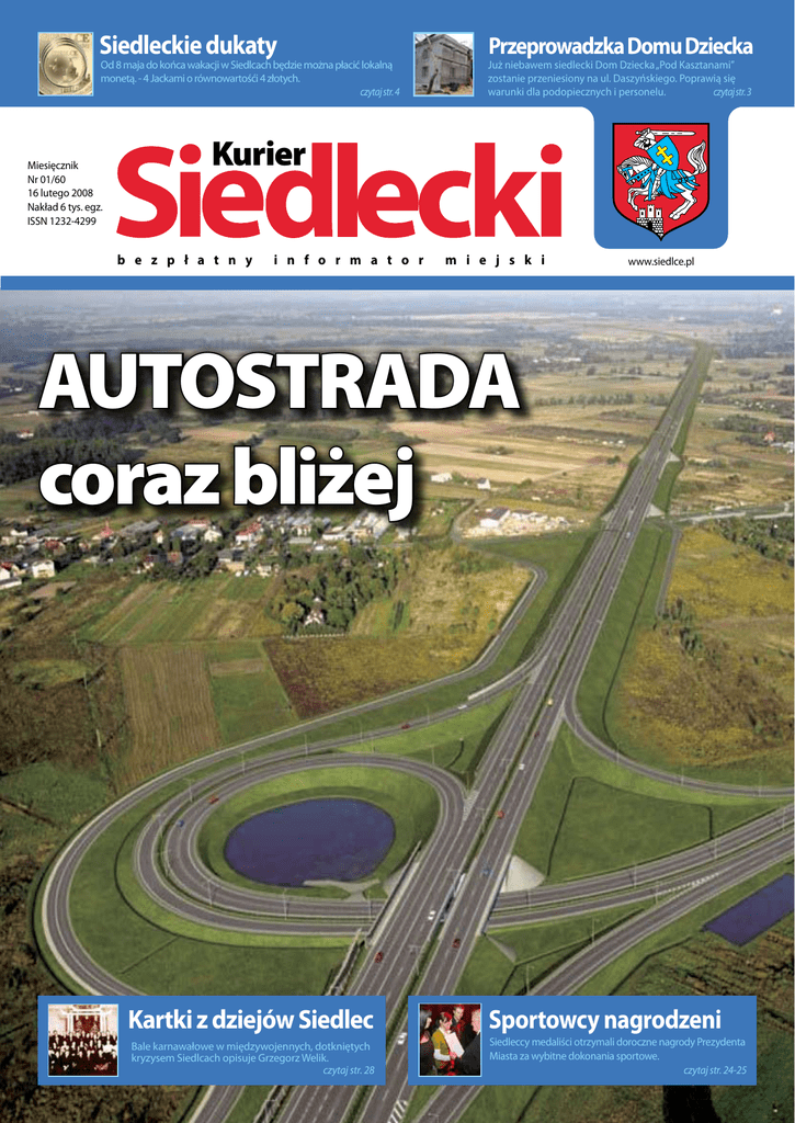 Siedleckie dukaty Od 8 maja do końca wakacji w Siedlcach będzie można płacić lokalną monetą. - 4 Jackami o równowartośći 4 złotych. czytaj str. 4 Miesięcznik Nr 01/60 16 lutego 2008 Nakład 6 tys. egz. ISSN 1232-4299 Przeprowadzka Domu Dziecka Już niebawem siedlecki Dom Dziecka „Pod Kasztanami” zostanie przeniesiony na ul. Daszyńskiego. Poprawią się warunki dla podopiecznych i personelu. czytaj str. 3 Kurier b e z p ł a t n y i n f o r m a t o r m i e j s k i www.siedlce.pl AUTOSTRADA coraz bliżej www.siedlce.pl Kartki z dziejów Siedlec Sportowcy nagrodzeni Bale karnawałowe w międzywojennych, dotkniętych kryzysem Siedlcach opisuje Grzegorz Welik. czytaj str. 28 Siedleccy medaliści otrzymali doroczne nagrody Prezydenta Miasta za wybitne dokonania sportowe. czytaj str. 24-25 Kurier Siedlecki Styczeń/Luty 2009 1 Fot. Dariusz Dybciak Kolędowe serce Mazowsza 2 Kurier Siedlecki Styczeń/Luty 2009 www.siedlce.pl Informacje Dom Dziecka na Daszyńskiego Trwają zaawansowane prace przy adaptacji budynku przy ul. Daszyńskiego 10 na potrzeby Domu Dziecka „Pod Kasztanami”. Jest to pierwszy etap tworzenia kompleksu, który poprawi bezpieczeństwo oraz zapewni wyższy standard funkcjonowania siedleckiego Domu Dziecka. W ramach inwestycji, która zrealizowana zostanie do końca czerwca gruntownie przebudowany i zmodernizowany zostanie budynek komunalny, w którym dawniej swoją siedzibę miał Sąd Pracy. W ramach zadania zaplanowano wykonanie wszystkich instalacji, przebudowę klatki schodowej, montaż szybu windowego, wymianę stolarki okiennej i drzwiowej, przebudowę dachu i kominów oraz docieplenie ścian. Wartość zadania to ponad półtora miliona złotych. Na ten cel miasto otrzymało dofinansowanie od wojewody mazowieckiego w wysokości 650 tysięcy złotych. Od 1 lutego przebiegiem prac inwestycyjnych, jak i całością placówki opiekuje się nowa dyrektor, którą została Katarzyna Graniszewska. Oficjalnie objęła ona urząd w obecności prezydenta Siedlec Wojciecha Kudelskiego i zastępcy prezydenta Marty Sosnowskiej. Katarzyna Graniszewska ma 35 lat. Wykształcenie wyższe. Jest absolwentką Akademii Podlaskiej w Siedlcach na kierunku pedagogika opiekuńczo-wychowawcza. Ukończyła również studia podyplomowe w zakresie usprawniania dzieci ze sprzężonymi niepełnosprawnościami na Akademii Pedagogiki Specjalnej w Warszawie. Dotychczas pracowała m.in. jako nauczyciel-wychowawca w Specjalnym Ośrodku Szkolno Wychowawczym w Siedlcach. Była również prezesem zarządu Fundacji Rozwoju Regionu Podlaskiego „Ekoland”. Ostatnio prowadziła własną działalność gospodarczą. Konsultacje w sprawie przebiegu autostrady W siedleckim Urzędzie Miasta 5 lutego odbyło się drugie spotkanie konsultacyjne poświęcone planowanemu przebiegowi przyszłej autostrady A2, która według założeń na odcinku nieco ponad kilometra ma przebiegać również przez teren miasta Siedlce. W spotkaniu uczestniczyło wielu mieszkańców terenów przyległych do planowanego przebiegu www.siedlce.pl trasy. Na spotkaniu obecny był również prezydent Siedlec Wojciech Kudelski, który ocenił, że budowa autostrady jest szansą na jeszcze bardziej dynamiczny rozwój ekonomiczny miasta. Inwestorów reprezentował szef firmy EUROSTRADA inż. Wojciech Parciński, który przedstawił dwa proponowane warianty przebiegu autostrady w okolicach Siedlec. Wstępne szacunki projektantów zakładają, że w przypadku przebiegu autostrady na obszarze miasta wzdłuż istniejącej obwodnicy miasta konieczne będzie wyburzenie około pięciu budynków zlokalizowanych przy ulicach Domanickiej, Dzieci Zamojszczyzny i Gajowej. Alternatywny wariant zakłada budowę drogi w odległości kilkunastu kilometrów od miasta, terenami gmin Skórzec, Domanice i Wiśniew. Kurier Siedlecki Styczeń/Luty 2009 3 Informacje Wymień złotówki na„Jacki” Od 8 maja do końca wakacji w Siedlcach będzie można płacić lokalną monetą - „4 Jackami” o równowartości 4 złotych. Monety będą miały przede wszystkim wartość kolekcjonerską, ale będą także środkiem płatniczym obowiązującym na terenie Siedlec. Czym jest dukat lokalny? Współczesne dukaty lokalne, które ponownie zostały wykreowane w Polsce przez Mennicę Polską, nawiązują do historycznych tradycji bicia monet przez lokalnych władców. Obecnie dukat lokalny to przede wszystkim atrakcyjne narzędzie promocyjne, które gwarantuje osiągnięcie zamierzonych celów informacyjnych i promocyjnych w mediach i wśród społeczności lokalnych. (Mennica Polska S.A.) Dukat lokalny można porównać do bonów, które dostajemy np. w czasie przedświątecznym i za które możemy nabyć produkty w sklepach honorujących takie bony. Dukaty siedleckie będą nosiły nazwę pochodzącą od najbardziej charakterystycznego budynku naszego miasta, czyli Ratusza Miejskiego zwanego „Jackiem”. Zgodnie z wytycznymi Mennicy Polskiej, nominałem będą 4 Jacki, które w okresie honorowania będą miały równowartość 4 złotych. Specjalnie dla kolekcjonerów i numizmatyków przygotowana została także srebrna wersja monety - o nominale 40 Jacków. Na awersie Jacków umieszczony jest ratusz miejski, na rewersie zaś widnieje wizerunek Ojca Świętego Jana Pawła II, który dokładnie 10 lat temu - w 1999 roku - przybył do Siedlec z wizytą apostolską. W ten sposób możemy upamiętnić jedno z największych wydarzeń w historii naszego miasta. Siedleckie Jacki będą pierwszym dukatem lokalnym z wizerunkiem Jana Pawła II, co dodatkowo zwiększa jego atrakcyjność wśród kolekcjonerów i numizmatyków. Wykonawcą akcji promocyjnej Dukat Lokalny w Siedlcach jest Miejski Ośrodek Kultury i dlatego każda instytucja, która będzie chciała honorować Jacki, powinna skontaktować się z pracownikami tej placówki. Akceptując regulamin akcji będzie mogła w czasie jej trwania przyjmować i wydawać dukaty na równi ze środkiem płatniczym
