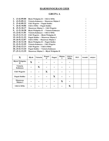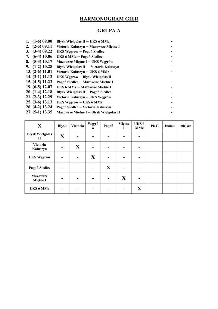 HARMONOGRAM GIER GRUPA A 1. (1-6) 09.00 2. (2-5) 09.11 3. (3-4) 09.22 7. (6-4) 10.06 8. (5-3) 10.17 9. (1-2) 10.28 13. (2-6) 11.01 14. (3-1) 11.12 15. (4-5) 11.23 19. (6-5) 12.07 20. (1-4) 12.18 21. (2-3) 12.29 25. (3-6) 13.13 26. (4-2) 13.24 27. (5-1) 13.35 Błysk Wielgolas II – UKS 6 MMz Victoria Kałuszyn – Mazowsze Miętne I UKS Węgrów – Pogoń Siedlce UKS 6 MMz – Pogoń Siedlce Mazowsze Miętne I – UKS Węgrów Błysk Wielgolas II – Victoria Kałuszyn Victoria Kałuszyn – UKS 6 MMz UKS Węgrów – Błysk Wielgolas II Pogoń Siedlce – Mazowsze Miętne I UKS 6 MMz – Mazowsze Miętne I Błysk Wielgolas II – Pogoń Siedlce Victoria Kałuszyn – UKS Węgrów UKS Węgrów – UKS 6 MMz Pogoń Siedlce – Victoria Kałuszyn Mazowsze Miętne I – Błysk Wielgolas II - X Błysk Victoria Węgró w Pogoń Miętne I UKS 6 MMz Błysk Wielgolas II X - - - - - Victoria Kałuszyn - X - - - - UKS Węgrów - - X - - - Pogoń Siedlce - - - X - - Mazowsze Miętne I - - - - X - UKS 6 MMz - - - - - X PKT. bramki miejsce GRUPA B 4. (1-6) 09.33 5. (2-5) 09.44 6. (3-4) 09.55 10. (6-4) 10.39 11. (5-3) 10.50 12. (1-2) 11.01 16. (2-6) 11.45 17. (3-1) 11.56 18. (4-5) 12.07 22. (6-5) 12.51 23. (1-4) 13.02 24. (2-3) 13.13 28. (3-6) 13.57 29. (4-2) 14.08 30. (5-1) 14.19 Błysk Wielgolas I – Mosir MMz Mazowsze Miętne II – GOSiR Mrozy Promyk Sobolew – Trójka Łochów Mosir MMz – Trójka Łochów GOSiR Mrozy – Promyk Sobolew Błysk Wielgolas I – Mazowsze Miętne II Mazowsze Miętne II – Mosir MMz Promyk Sobolew – Błysk Wielgolas I Trójka Łochów – GOSiR Mrozy Mosir MMz - GOSiR Mrozy Błysk Wielgolas I – Trójka Łochów Mazowsze Miętne II – Promyk Sobolew Promyk Sobolew – Mosir MMz Trójka Łochów – Mazowsze Miętne II GOSiR Mrozy – Błysk Wielgolas I Miętne Promyk Trójka II X BŁYSK Błysk Wielgolas I X - - Mazowsze Miętne II - X Promyk Sobolew - Trójka Łochów - GOSiR Mosir - - - - - - - - X - - - - - - X - - GOSiR Mrozy - - - - X - Mosir MMz - - - - - X 31. 14.30 Półfinał A1 – B2 32. 14.41 Półfinał A2 – B1 33. 14.52 Mecz o 3 miejsce 34. 15.03 Finał PKT. bramki miejsce Termin i miejsce: Zawody odbywają się na sali sportowej Zespołu Szkół w Latowiczu. • 07.02.2015 (SOBOTA) Zasady gry: Zawody rozgrywane są na podstawie przepisów gry w piłkę nożną zgodnie z niniejszym regulaminem i obowiązującymi przepisami Polskiego Związku Piłki Nożnej. Bramki 5 x 2, piłka nożna nr 4. Uczestnictwo: W turnieju uczestniczą drużyny 10 osobowe + opiekun. Czas gry: 1 x 10 min Wpisowe: Wpisowe do turnieju – 150 zł. Kary dyscyplinarne: Czerwona kartka za rażące przewinienia, brutalne zachowanie oraz czasowe wykluczenie zawodnika z gry w zależności od stopnia przewinienia. Punktacja: 1. Za wygrany mecz przyznawane są 3 punkty, za remis 1 punkt, porażka 0 punktów. 2. O kolejności w grupie decyduje: a. b. c. d. e. większa liczba zdobytych punktów bezpośredni mecz korzystniejszy stosunek strzelonych bramek do straconych większa liczba strzelonych bramek w przypadku gdy więcej niż 2 drużyny spełniały powyższe punkty tworzona będzie dodatkowa tabela uwzględniająca tylko mecze pomiędzy zainteresowanymi drużynami Postanowienia końcowe: 1. Organizator nie ubezpiecza zawodników biorących udział w Turnieju i nie ponosi z tego tytułu odpowiedzialności. 2. Wszystkie sprawy wynikłe w trakcie rozgrywek a nie ujęte w regulaminie rozpatrywane są przez organizatorów 3. Obowiązuje strój i obuwie sportowe 4. Każdy uczestnik powinien posiadać dokument tożsamości