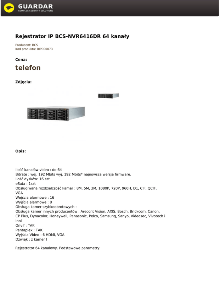 Rejestrator IP BCS-NVR6416DR 64 kanały Producent: BCS Kod produktu: BIP000073 Cena: telefon Zdjęcia: Opis: Ilość kanałów video : do 64 Bitrate : wej. 192 Mbits wyj. 192 Mbits* najnowsza wersja firmware. Ilość dysków: 16 szt eSata : 1szt Obsługiwana rozdzielczość kamer : 8M, 5M, 3M, 1080P, 720P, 960H, D1, CIF, QCIF, VGA Wejścia alarmowe : 16 Wyjścia alarmowe : 8 Obsługa kamer szybkoobrotowych : Obsługa kamer innych producentów : Arecont Vision, AXIS, Bosch, Brickcom, Canon, CP Plus, Dynacolor, Honeywell, Panasonic, Pelco, Samsung, Sanyo, Videosec, Vivotech i inni Onvif : TAK Pentaplex : TAK Wyjścia Video : 6 HDMI, VGA Dźwięk : z kamer I Rejestrator 64 kanałowy. Podstawowe parametry: ● ● ● ● ● ● ● ● ● ● ● ● Ilość kanałów video : do 64 Bitrate : wej. 192 Mbits wyj. 192 Mbits* najnowsza wersja firmware Ilość dysków: 16 szt eSata : 1szt Obsługiwana rozdzielczość kamer : 8M, 5M, 3M, 1080P, 720P, 960H, D1, CIF, QCIF,VGA Wejścia alarmowe : 16 Wyjścia alarmowe : 8 Obsługa kamer szybkoobrotowych Obsługa kamer innych producentów : Arecont Vision, AXIS, Bosch, Brickcom, Canon,CP Plus, Dynacolor, Honeywell, Panasonic, Pelco, Samsung, Sanyo, Videosec, Vivotech iinniOnvif : TAK Pentaplex : TAK Wyjścia Video : 6 HDMI, VGA Dźwięk : z kamer IP