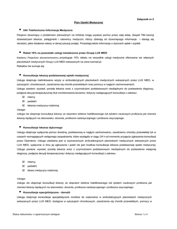 Załącznik nr 2 Plan Opieki Medycznej 24h Telefoniczna Informacja Medyczna Pacjenci dzwoniący z problemem zdrowotnym na infolinię mogą uzyskać pomoc przez całą dobę. Zespół TIM tworzą doświadczeni lekarze, pielęgniarki i ratownicy medyczni, którzy zbierają od dzwoniącego informacje i starają się doradzić, jakie działania należy w danej sytuacji podjąć. Posiadają także informacje o dyżurach aptek i szpitali. Rabat 10% na pozostałe usługi świadczone przez Grupę LUX MED Każdemu Pacjentowi abonamentowemu przysługuje 10% rabatu na wszystkie usługi medyczne oferowane we własnych placówkach medycznych Grupy LUX MED wskazanych na www.luxmed.pl. Rabatów nie sumuje się. Konsultacje lekarzy podstawowej opieki medycznej Usługa obejmuje nielimitowane wizyty w ambulatoryjnych placówkach medycznych wskazanych przez LUX MED, w sytuacjach: chorobowych, zaostrzenia się chorób przewlekłych oraz pomocy w nagłych zachorowaniach. Usługa zawiera: wywiad, poradę lekarza wraz z czynnościami podstawowymi niezbędnymi do postawienia diagnozy, podjęcia decyzji terapeutycznej i/lub monitorowania leczenia i dotyczy następujących konsultacji z zakresu: interny pediatrii lekarza medycyny rodzinnej Uwaga: Usługa nie obejmuje konsultacji lekarzy ze stopniem doktora habilitowanego lub tytułem naukowym profesora jak również lekarzy będących na stanowisku: docenta, profesora nadzwyczajnego i profesora zwyczajnego. Konsultacje lekarza dyżurnego Usługa obejmuje wyłącznie pomoc doraźną, podstawową w nagłym zachorowaniu, zaostrzeniu choroby przewlekłej lub w urazach wymagających wstępnego zaopatrzenia, które wystąpiły w ciągu 24 h od momentu przyjęcia zgłoszenia konsultacji przez Operatora. Usługa udzielana jest w wyznaczonych ambulatoryjnych placówkach medycznych wskazanych przez LUX MED, wyłącznie w dniu jej zgłoszenia i jeżeli nie jest możliwa konsultacja lekarza podstawowej opieki medycznej. Usługa zawiera: wywiad, poradę lekarza wraz z czynnościami podstawowymi niezbędnymi do postawienia wstępnej diagnozy, podjęcia decyzji terapeutycznej i dotyczy następujących konsultacji z zakresu: interny; pediatrii; lekarz medycyny rodzinnej. Uwaga: Usługa nie obejmuje konsultacji lekarzy ze stopniem doktora habilitowanego lub tytułem naukowym profesora jak również lekarzy będących na stanowisku: docenta, profesora nadzwyczajnego i profesora zwyczajnego. Konsultacje specjalistyczne - dorośli Usługa obejmuje konsultacje specjalistyczne możliwe do wykonania w ambulatoryjnych placówkach medycznych wskazanych przez LUX MED, dostępne w sytuacjach chorobowych, zaostrzenia się chorób przewlekłych, pomocy w Status dokumentu: o ograniczonym dostępie Strona 1 z 4 nagłych zachorowaniach i poradnictwa ogólnomedycznego. Usługa zawiera: wywiad, poradę lekarza wraz z czynnościami podstawowymi niezbędnymi do postawienia diagnozy, podjęcia decyzji terapeutycznej i/lub monitorowania leczenia. Wizyty bez skierowania dotyczą następujących konsultacji lekarzy z zakresu: ginekologii; laryngologii; okulistyki; dermatologii; neurologii. Uwaga: Usługa nie obejmuje konsultacji lekarzy ze stopniem doktora habilitowanego lub tytułem naukowym profesora jak również lekarzy będących na stanowisku: docenta, profesora nadzwyczajnego i profesora zwyczajnego. Konsultacyjne zabiegi ambulatoryjne Usługi w formie drobnych zabiegów lub badań, wykonywane w placówkach wskazanych przez LUX MED w warunkach ambulatoryjnych przez lekarza, podczas właściwej dla zabiegu konsultacji lekarskiej lub po konsultacji lekarskiej. Zakres konsultacyjnych zabiegów ambulatoryjnych i związany z tym dostęp do użytych podczas zabiegu, bezpłatnych materiałów i środków medycznych takich jak: opatrunki tradycyjne z gazy lub waty, bandaże, venflony, strzykawki, waciki, plastry, igły, środki dezynfekujące, surowica – antytoksyna tężcowa, szwy i nici chirurgiczne, uzależniony jest od zakresu konsultacji lekarzy, do których Pacjent jest uprawniony w ramach abonamentu i dostępności zabiegu w wyznaczonej placówce medycznej. W ramach usługi dostępne jest znieczulenie miejscowe: nasiękowe lub powierzchowne. Konsultacyjne zabiegi ambulatoryjne obejmują: Zabiegi ambulatoryjne ogólnolekarskie: Mierzenie RR / ciśnienia Pomiar wzrostu i wagi ciała Usunięcie kleszcza – niechirurgiczne Zabiegi ambulatoryjne laryngologiczne: Badanie trąbek słuchowych przedmuchiwanie Badanie lusterkiem krtaniowym Konsultacja laryngologa Kateteryzacja trąbki słuchowej Konsultacja laryngologa płukanie ucha Konsultacja laryngologa Usunięcie ciała obcego z nosa/ ucha Drobne Opatrunki laryngologiczne Zabieg laryngologiczny- Koagulacja naczyń przegrody nosa Zabieg laryngologiczny- Usunięcie tamponady nosa Zaopatrzenie krwotoku z nosa dwie strony Zaopatrzenie krwotoku z nosa jedna strona Usunięcie szwów w gabinecie zabiegowym ( nie dotyczy usunięcia szwów po porodzie oraz szwów założonych poza placówkami wskazanymi przez LUX MED) założenie/zmiana/usunięcie sączka w przewodzie słuchowym zewnętrznym Zabiegi ambulatoryjne okulistyczne: Konsultacja okulisty - standardowe badanie dna oka Konsultacja okulisty - dobór szkieł korekcyjnych (nie obejmuje soczewek z płynna ogniskową) Konsultacja okulisty - Gonioskopia (ocena kąta przesączania) Konsultacja okulisty - Usunięcie ciała obcego z oka Status dokumentu: o ograniczonym dostępie Strona 2 z 4 Standardowy* pomiar ciśnienia śródgałkowego Standardowe* badanie widzenia przestrzennego Płukanie kanalików łzowych Standardowe* komputerowe badanie pola widzenia Podanie leku do worka spojówkowego w sytuacji doraźnej Badanie autorefraktometrem Badanie ostrości widzenia Zabiegi ambulatoryjne dermatologiczne: konsultacja dermatologa – dermatoskopia Zabiegi ambulatoryjne ginekologiczne: pobranie standardowej* cytologii z szyjki macicy Badania diagnostyczne W zakres usługi wchodzą niżej wymienione badania dia