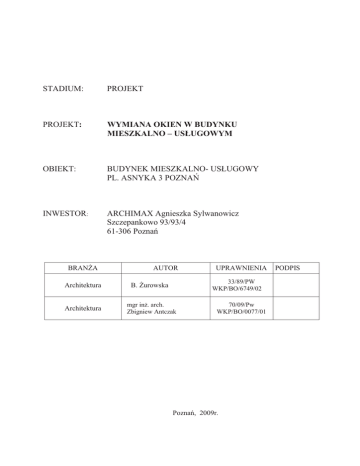 STADIUM: PROJEKT PROJEKT: WYMIANA OKIEN W BUDYNKU MIESZKALNO – USŁUGOWYM OBIEKT: BUDYNEK MIESZKALNO- USŁUGOWY PL. ASNYKA 3 POZNAē INWESTOR: ARCHIMAX Agnieszka Sylwanowicz Szczepankowo 93/93/4 61-306 PoznaĔ BRANĩA Architektura Architektura AUTOR UPRAWNIENIA 33/89/PW WKP/BO/6749/02 B. ĩurowska mgr inĪ. arch. Zbigniew Antczak 70/09/Pw WKP/BO/0077/01 PoznaĔ, 2009r. PODPIS 3 SPIS ZAWARTOĝCI 1. Strona tytułowa 2. Spis zawartoĞci 3. OĞwiadczenie projektanta4. 4. Uprawnienia 5. Opis techniczny 7. Informacja BIOZ Rysunki: plan sytuacyjny elewacja frontowa elewacja od podwórza okna-elewacja frontowa okna-elewacja frontowa okna-elewacja frontowa okna – elewacja tylna okna - elewacja tylna okna- elewacja tylna okna-elewacja frontowa-projekt okna-elewacja tylna-projekt okno- szczegół- projekt rys. nr 1 rys. nr 2 rys. nr 3 rys. nr 4 rys. nr 5 rys. nr 6 rys. nr 7 rys. nr 8 rys. nr 9 rys. nr10 rys. nr11 rys. nr12 4 OPIS TECHNICZNY Do projektu wymiany okien w budynku mieszkalno – usługowym przy Pl. Asnyka 3 w Poznaniu I. PODSTAWA OPRACOWANIA - Zlecenie zarządcy budynku ARCHIMAX Agnieszka Sylwanowicz Szczepankowo 93/93/4 61-306 PoznaĔ - Pomiary dokonane na obiekcie. - Normy i przepisy obowiązujące w budownictwie II. LOKALIZACJA I STAN PRAWNY Budynek zlokalizowany na działce połoĪonej w Poznaniu przy Pl. A. Asnyka 3.(Dz. Nr 10 , obrĊb JeĪyce, arkusz 13) Obiekt stanowi współwłasnoĞü miasta Poznania , administrowany przez ARCHIMAX Agnieszka Sylwanowicz Szczepankowo 93/93/4 61-306 PoznaĔ III.OPIS STANU ISTNIEJĄCEGO : Budynek usytuowany w zabudowie zwartej , miejskiej w rejonie ochrony konserwatorskiej. Obiekt piĊciokondygnacyjny, z czĊĞciowo zamieszkałym poddaszem, całkowicie podpiwniczony. W piwnicy znajdują siĊ piwnice lokatorskie oraz warsztat kominiarski i biuro. Budynek pobudowany w technologii tradycyjnej- murowany z cegły pełnej na zaprawie zaprawie cem. Przekryty dachem o konstrukcji drewnianej dachówka ceramiczna + papa. Schody o konstrukcji drewnianej. Budynek otynkowany, za wyjątkiem cokołu i portalu wejĞcia głównego – wykonanych z cegły klinkierowej. 5 Instalacje: - Ogrzewanie-piece ceramiczne pokojowe oraz kotliny. CzĊĞü lokatorów posiada gazowe ( piece dwufunkcyjne) - elektryczną, - wodno – kanalizacyjna - gazowa - telefoniczna - dzwonkowa Woda doprowadzona jest do budynku z wodociągu miejskiego , natomiast Ğcieki odprowadzone do miejskiej sieci kanalizacyjnej ogólnospławnej. Budynek posiada przyłącza sieci gazowej, energetycznej i telefonicznej. Stolarka okienna i drzwiowa - nietypowa. Okna istniejące drewniane skrzynkowe w złym stanie technicznym wypaczone, nie domykają siĊ, wieje ( nie spełniają wymogów normy cieplnej) WYMIANA OKIEN Inwestor planuje generalnie wymianĊ całej stolarki okiennej w budynku. Okna naleĪy odtworzyü wg okien istniejących.. Roboty związane z wymianą okien - DemontaĪ istniejących okien drewnianych wraz z wykuciem oĞcieĪnic drewnianych - DemontaĪ istniejących parapetów zewnĊtrznych i wewnĊtrznych. - MontaĪ okien drewnianych na piance poliuretanowej oraz dyblach - Uszczelnianie styku okna z parapetem wewnĊtrznym - Wymiana parapetów zewnĊtrznych na parapety z blachy powlekanej - Wymiana parapetów wewnĊtrznych na parapety drewniane - Uszczelnianie styku okna z parapetami zewnĊtrznymi. Stolarka okienna- wymagania materiałowe. - Okna drewniane w kolorze białym , uchylno – rozwieralne z mikrowentylacją i izolacyjnoĞcią termiczną - Ramy okien impregnowane i malowane wodnymi farbami akrylowymi ekologicznymi. - Szklone szkłem zespolonym 2 szybami o gruboĞci 4 mm o współczynniku izolacyjnoĞci Ukmax = 1,1 W/m²K. - Parapety wewnĊtrzne drewniane - parapety zewnĊtrzne z blachy powlekanej o szerokoĞci 30 cm. 6 UWAGA: Przed zakupem stolarki okiennej naleĪy dokonaü pomiarów otworów na placu budowy. RównieĪ przed zakupem naleĪy zwróciü szczególną uwagĊ na: - sztywnoĞü konstrukcji ram oĞcieĪnic i skrzydeł - izolacyjnoĞü cieplną - izolacyjnoĞü akustyczną - szczelnoĞü na wodĊ - infiltracjĊ powietrza IV. UWAGI KOēCOWE Projekt budowlany opracowano na podstawie pomiarów z natury i oglĊdzin W miarĊ postĊpu robót naleĪy weryfikowaü wymiary elementów konstrukcyjnych. Roboty budowlane naleĪy prowadziü zgodnie z zasadami sztuki budowlanej oraz obowiązującymi przepisami BHP i p.poĪ. pod stałym nadzorem osób uprawnionych. INFORMACJA DOTYCZĄCA BEZPIECZEēSTWA I OCHRONY ZDROWIA BUDYNEK MIESZKALNO - USŁUGOWY POZNAē PL. ASNYKA 3 KARTA TYTUŁOWA 1. Nazwa i adres obiektu budowlanego Budynek mieszkalno- usługowy PoznaĔ, Pl. Asnyka 3 2. Nazwa i adres inwestora ARCHIMAX Agnieszka Sylwanowicz 61-306 PoznaĔ, Szczepankowo 93/93/4 3. Projektant sporządzający informacjĊ BoĪena ĩurowska 61 – 635 PoznaĔ, OĞ. Pod Lipami 9m106, 4. CzĊĞü opisowa 4.1. 4.2. Zakres robót Wymiana okien w budynku 4.3. Wykaz istniejących obiektów budowlanych Budynek w zabudowie zwartej piĊciokondygnacyjny, podpiwniczony, z czĊĞciowo zamieszkałym poddaszem. 4.3. Wskazanie elementów terenu mogących stwarzaü zagroĪenie bezpieczeĔstwa i zdrowia ludzi Projekt nie przewiduje robót budowlanych na zewnĊtrz budynku. 4.4. Wskazanie zagroĪeĔ wystĊpujących w trakcie realizacji robót Miejsca wymiany okien naleĪy zabezpieczyü przed dostĊpem osób nie związanych bezpoĞrednio z robotami remontowymi. Stanowiska pracy winny byü zorganizowane w sposób wykluczający moĪliwoĞü upadku, potkniĊü i okaleczeĔ oraz zapewniający całkowicie swobodĊ ruchów w czasie pracy. 4.5. Wskazanie prowadzenia instruktaĪu pracowników przed przystąpieniem do realizacji Przed rozpoczĊciem robót naleĪy obowiązkowo przeprowadziü z wszystkimi pracownikami szkolenie stanowiskowe ze szczególnym uwzglĊdnieniem: - zasad pracy przy obsłudze sprzĊtu zmechanizowanego. - zasad pracy przy uĪyciu elektronarzĊdzi, - zasad obsługi urządzeĔ elektrycznych, - stosowania Ğrodk