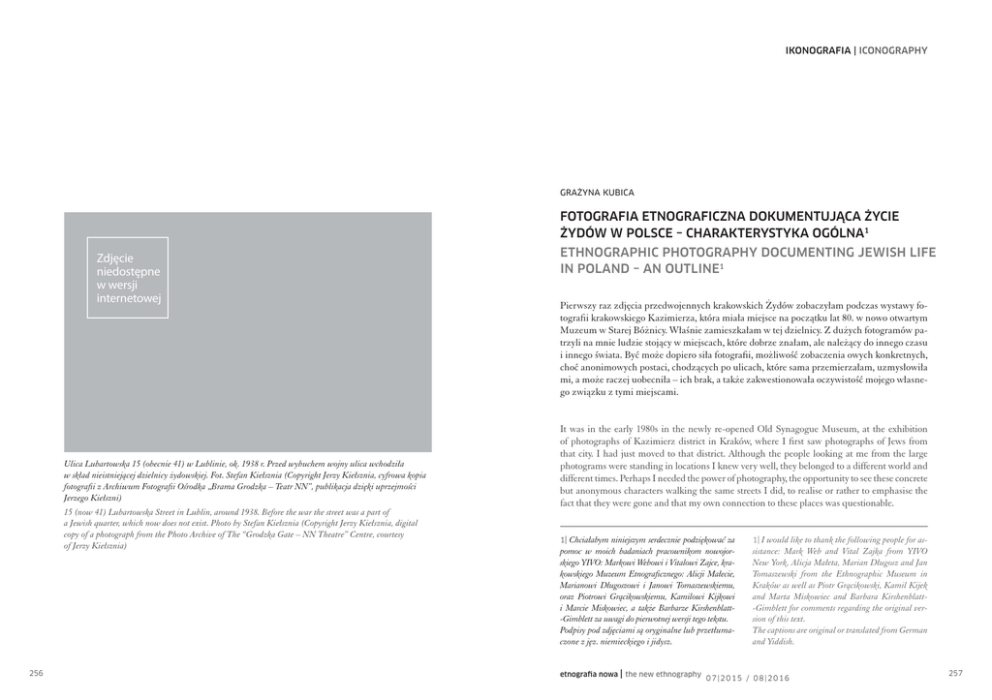 IKONOGRAFIA | ICONOGRAPHY Grażyna Kubica Fotografia etnograficzna dokumentująca życie Żydów w Polsce – charakterystyka ogólna1 Zdjęcie niedostępne w wersji internetowej Ulica Lubartowska 15 (obecnie 41) w Lublinie, ok. 1938 r. Przed wybuchem wojny ulica wchodziła w skład nieistniejącej dzielnicy żydowskiej. Fot. Stefan Kiełsznia (Copyright Jerzy Kiełsznia, cyfrowa kopia fotografii z Archiwum Fotografii Ośrodka „Brama Grodzka – Teatr NN”, publikacja dzięki uprzejmości Jerzego Kiełszni) 15 (now 41) Lubartowska Street in Lublin, around 1938. Before the war the street was a part of a Jewish quarter, which now does not exist. Photo by Stefan Kiełsznia (Copyright Jerzy Kiełsznia, digital copy of a photograph from the Photo Archive of The “Grodzka Gate – NN Theatre” Centre, courtesy of Jerzy Kiełsznia) 256 Ethnographic Photography Documenting Jewish Life in Poland – an Outline1 Pierwszy raz zdjęcia przedwojennych krakowskich Żydów zobaczyłam podczas wystawy fotografii krakowskiego Kazimierza, która miała miejsce na początku lat 80. w nowo otwartym Muzeum w Starej Bóżnicy. Właśnie zamieszkałam w tej dzielnicy. Z dużych fotogramów patrzyli na mnie ludzie stojący w miejscach, które dobrze znałam, ale należący do innego czasu i innego świata. Być może dopiero siła fotografii, możliwość zobaczenia owych konkretnych, choć anonimowych postaci, chodzących po ulicach, które sama przemierzałam, uzmysłowiła mi, a może raczej uobecniła – ich brak, a także zakwestionowała oczywistość mojego własnego związku z tymi miejscami. It was in the early 1980s in the newly re-opened Old Synagogue Museum, at the exhibition of photographs of Kazimierz district in Kraków, where I first saw photographs of Jews from that city. I had just moved to that district. Although the people looking at me from the large photograms were standing in locations I knew very well, they belonged to a different world and different times. Perhaps I needed the power of photography, the opportunity to see these concrete but anonymous characters walking the same streets I did, to realise or rather to emphasise the fact that they were gone and that my own connection to these places was questionable. 1| Chciałabym niniejszym serdecznie podziękować za pomoc w moich badaniach pracownikom nowojorskiego YIVO: Markowi Webowi i Vitalowi Zajce, krakowskiego Muzeum Etnograficznego: Alicji Małecie, Marianowi Długoszowi i Janowi Tomaszewskiemu, oraz Piotrowi Grącikowskiemu, Kamilowi Kijkowi i Marcie Miskowiec, a także Barbarze Kirshenblatt-Gimblett za uwagi do pierwotnej wersji tego tekstu. Podpisy pod zdjęciami są oryginalne lub przetłumaczone z jęz. niemieckiego i jidysz. etnografia nowa | the new ethnography 1| I would like to thank the following people for as- sistance: Mark Web and Vital Zajka from YIVO New York, Alicja Małeta, Marian Długosz and Jan Tomaszewski from the Ethnographic Museum in Kraków as well as Piotr Grącikowski, Kamil Kijek and Marta Miskowiec and Barbara Kirshenblatt-Gimblett for comments regarding the original version of this text. The captions are original or translated from German and Yiddish. 07|2015 / 08|2016 257 Ethnographic Photography Documenting Jewish Life in Poland – an Outline Antropologia wizualna – badania etnograficznych archiwów Dla wielu antropologów wizualnych szczególnie interesujący jest etnograficzny materiał archiwalny i sposoby jego analizy, prezentacji i oceny (np. Morton, Edwards 2009; Banks, Vokes 2010; Pinney 2011). Pierwsza fala zainteresowania tym typem fotografii miała miejsce w połowie lat 80. i wiązała się z krytycznym zwrotem w antropologii oraz kryzysem reprezentacji. Zaczęto wtedy problematyzować dziedzictwo kolonializmu i poddawać je krytyce. Dyskutowano też rolę fotografii etnograficznej w tym kontekście (Edwards 1992). Jednym z efektów tej debaty było określenie gatunków działalności. Alison Griffith wyróżniła trzy typy zdjęć, które można znaleźć w etnograficznych archiwach. Pierwszy, najbardziej znany i utożsamiany z dziewiętnastowieczną antropologią, to tzw. zdjęcia antropometryczne – ludzie byli fotografowani jako przedstawiciele pewnych typów fizycznych na potrzeby tworzenia taksonomii klasyfikujących rodzaj ludzki. Podmiotowość osoby fotografowanej była stłumiona, miała ona jedynie reprezentować szerszą kategorię „rasową”. Wygląd fizyczny był podstawą teorii dotyczących kultury, inteligencji i ewolucji. Wskazówki, jak wykonać tego typu fotografie, określano bardzo precyzyjne (Griffith 2002: 101). Takie szczegółowe instrukcje zawierał na przykład jeden z rozdziałów opracowany przez Alfreda Haddona w trzecim wydaniu podręcznika Notes & Queries on Anthropology: „Co się tyczy portretów, powinno się zawsze zrobić pewną ilość typów jak największych, z przodu i z profilu; obiektyw powinien być na wysokości twarzy, oczy badanego skierowane wprost i skupione na punkcie na tej samej wysokości od ziemi lub na linii horyzontu. Gdy fotografuje się całą nagą postać, powinno się zrobić Visual anthropology – studies of ethnographic archives Many visual anthropologists study ethnographic archives and the ways they have been analysed, presented and evaluated (e.g. Morton, Edwards 2009; Banks, Vokes 2010; Pinney 2011). This type of photography first drew attention in the 1980s and this interest was connected with the critical turnabout in anthropology and with the crisis of representation. In that time the issue of colonial heritage was widely discussed, as was the role of ethnographic photography in this context (Edwards 1992). These debates resulted in defining different kinds of photography. Alison Griffith divided ethnographic photos found in archives into three groups. The first one, the anthropometric photography, was the most well-known and identified with 19th century anthropology. It treated its models as represent