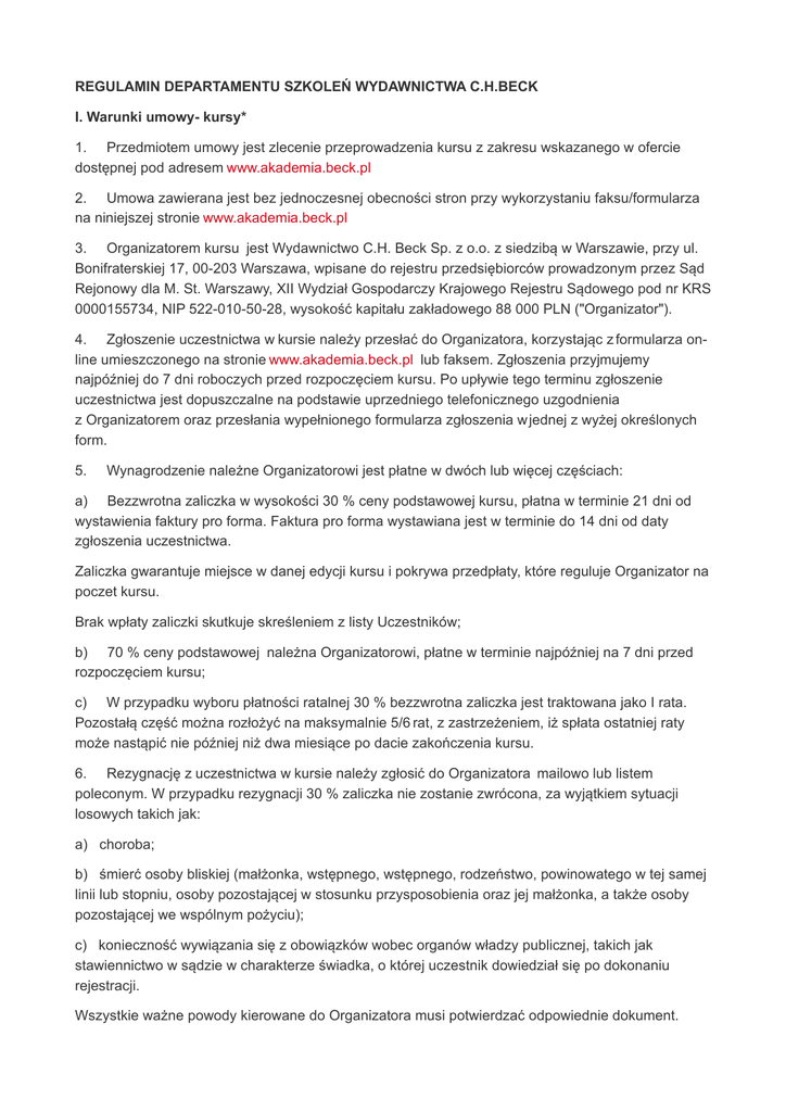 REGULAMIN DEPARTAMENTU SZKOLEŃ WYDAWNICTWA C.H.BECK