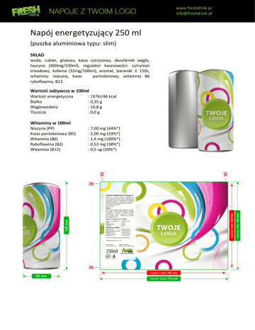 www.freshdrink.pl [email protected] Napój energetyzujący 250 ml (puszka aluminiowa typu: slim) SKŁAD woda, cukier, glukoza, kwas cytrynowy, dwutlenek węgla, tauryna (400mg/100ml), regulator kwasowości: cytrynian trisodowy, kofeina (32mg/100ml), aromat, barwnik: E 150c, witaminy: niacyna, kwas pantotenowy, witamina B6 ryboflawina, B12. Wartość odżywcza w 100ml Wartość energetyczna Białko Węglowodany Tłuszcze : 197kJ/46 kcal : 0,35 g : 10,8 g : 0,0 g Witaminy w 100ml Niacyna (PP) Kwas pantotenowy (B5) Witamina (B6) Ryboflawina (B2) Witamina (B12) : 7,00 mg (44%*) : 2,00 mg (33%*) : 1,4 mg (100%*) : 0,53 mg (38%*) : 0,5 ug (20%*) www.freshdrink.pl [email protected] Napój energetyzujący 250 ml (puszka aluminiowa typu: slim) Pakowanie Ilość puszek w zgrzewce Ilość zgrzewek na palecie Ilość puszek na palecie Ilość zgrzewek w poziomie na palecie Ilość warstw na palecie 24 120 2880 12 12 Wymiary Wymiar etykiety (cm, wys. x szer.) Wymiar puszki (cm, wys. x szer.) Wymiar zgrzewki (cm, wys. x szer. x dł.) Wymiary palety (cm, wys. x szer. x dł.) 12,3 x 16,6 netto (12,9 x 17,2 brutto) 13,5 x 5,3 13,7 x 21,5 x 32,4 152 x 80 x 120 Waga Waga puszki (kg) Waga zgrzewki (kg) Waga palety (puszki + paleta ,kg) 0,27 6,6 792 + 25 = 817