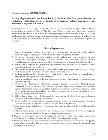 Procedura numer WSZJK-IP-ZIS/1 Zasady dyplomowania na kierunku inżynieria środowiska prowadzonym w Instytucie Politechnicznym w Państwowej Wyższej Szkole Zawodowej im. Stanisława Pigonia w Krośnie Na podstawie art. 160 ust. 1 i art. 161 ust. 1 Ustawy z dnia 27 lipca 2005 r. Prawo o szkolnictwie wyższym (Dz. U. Nr 164. poz. 1365 z późn. zm.) oraz na podstawie Regulaminu Studiów PWSZ w Krośnie obowiązującego od roku akademickiego 2014/2015 ustala się zasady dyplomowania na kierunku inżynieria środowiska prowadzonym w Instytucie Politechnicznym w Państwowej Wyższej Szkole Zawodowej im. Stanisława Pigonia w Krośnie. 1. Praca dyplomowa 1. Pracę dyplomową student wykonuje pod kierunkiem nauczyciela akademickiego zatrudnionego w uczelni, ze stopniem naukowym co najmniej doktora. 2. Za zgodą dyrektora instytutu student może wykonywać pracę dyplomową pod kierunkiem nauczyciela innego zakładu uczelni lub specjalisty spoza uczelni, posiadającego co najmniej tytuł zawodowy magistra oraz znaczący dorobek zawodowy. 3. Temat pracy dyplomowej powinien być ustalony nie później niż 9 miesięcy przed terminem zakończenia studiów. 4. Dopuszcza się prace realizowane przez kilka osób, przy czym zakres pracy każdego studenta musi być wyraźnie określony przez opiekuna pracy. 5. Zmiana opiekuna lub tematu pracy dyplomowej jest możliwa w uzasadnionych przypadkach za zgodą dyrektora instytutu. 6. Student składający pracę dyplomową dołącza pisemne oświadczenie o samodzielnym wykonaniu pracy. 7. Oceny pracy dyplomowej dokonują kierujący pracą i recenzent. Recenzja pracy dokonana przez promotora i recenzenta powinna zawierać uzasadnienie wystawionej oceny. Recenzenta wyznacza dyrektor instytutu na wniosek kierownika zakładu. Przed oceną praca dyplomowa podlega weryfikacji za pomocą procedur antyplagiatowych zgodnie z zarządzeniem rektora. 8. Gdy jedna z ocen pracy dyplomowej jest negatywna, dyrektor instytutu podejmuje decyzję o powołaniu drugiego recenzenta. 9. W przypadku powołania drugiego recenzenta, jego opinia jest wiążąca i na jej podstawie dyrektor instytutu podejmuje decyzję o dalszym toku postępowania. 10. Przy ocenie pracy dyplomowej stosuje się skalę ocen podaną w § 23 ust. 3 Regulaminu Studiów. 11. Ogólna ocena pracy dyplomowej jest średnią ocen wystawionych przez kierującego pracą i recenzenta zgodnie z § 43 ust. 6 Regulaminu Studiów. 12. Student zobowiązany jest złożyć pracę dyplomową w roku planowego ukończenia studiów we właściwym sekretariacie nie później niż do połowy lutego. 13. Dyrektor instytutu w porozumieniu z kierownikiem zakładu, na wniosek kierującego pracą lub na wniosek studenta, może przesunąć termin złożenia pracy dyplomowej o nie więcej niż trzy miesiące. 1 14. W razie dłuższej nieobecności kierującego pracą dyplomową dyrektor instytutu na wniosek kierownika zakładu wyznacza osobę, która przejmuje obowiązek kierowania pracą. 15. W uzasadnionych przypadkach prorektor ds. studiów może przesunąć termin przedłużenia o którym mowa w pkt. 13, o kolejne trzy miesiące. 16. W okresie przedłużenia terminu złożenia pracy dyplomowej student zachowuje prawa studenta z wyjątkiem uprawnienia do otrzymywania świadczeń pomocy materialnej. 17. Student, który nie uzyskał wszystkich zaliczeń (także z seminarium, pracy dyplomowej) i ocen pozytywnych z egzaminów nie może uzyskać zgody na wznowienie studiów wyłącznie w celu przystąpienia do egzaminu dyplomowego. 2. Wymagania edytorskie pracy dyplomowej 1. Objętość pracy – około 60 stron 2. Znormalizowany tekst w formacie A4, marginesy: górny i dolny: 2,5 cm, wewnętrzny: 3,5 cm, zewnętrzny: 2,5 cm. Odstępy między wierszami: 1,5 wiersza. 3. Przykładowy układ treści w pracy dyplomowej: 1. Strona tytułowa 2. Spis treści 3. Wstęp 4. Cel i zakres pracy 5. Rozdział(y) teoretyczny – przegląd literatury naświetlający stan wiedzy na dany temat część praktyczna: 6. Opis terenu badań 7. Metodyka badań 8. Wyniki badań i ich dyskusja 9. Wnioski 10. Wykaz literatury (bibliografia) 11. Spis tabel 12. Spis rysunków 4. Strona tytułowa pracy powinna być przygotowana według wzoru (załącznik 1). 5. Numeracja stron w pracy – dół strony, wyrównane do prawej. 6. Wielkość czcionki: Rozdziały: 13 pt, styl: Times New Roman, pogrubiony, numeracja: 1. Rozdział Podrozdziały: 12 pt, styl: Times New Roman, pogrubiony, numeracja: 1.1. Podrozdział; 1.2. Podrozdział itd. Tekst pracy: 12 pt, styl: Times New Roman Opis tabel i rysunków, wykresów oraz tekst w tabelach 10 pt (należy podać numer tabeli, wykresu….., tytuł oraz źródło literatury). 6. Tytuły tabeli należy podać nad tabelą, natomiast tytuły rysunków, wykresów, fotografii itd. należy napisać pod niniejszymi. 7. Bibliografia (umieszczona w zakończeniu pracy) ponumerowana, ułożona alfabetycznie, według nazwiska autorów lub redaktorów. Bibliografię należy tworzyć według przykładu: 2 Rajchel B., 2011 - Próba wykorzystania georadaru do badań płytkich zmian antropogenicznych w podłożu. [W:] Biuletyn Państwowego Instytutu Geologicznego 446, s. 225-232. Cytowanie stron internetowych – należy podać adres strony, a w nawiasie dokładną datę skorzystania z informacji na stronie internetowej, przykład: www.przyklad.com (2013.06.28) 8. Powoływanie się na literaturę w tekście pracy: można podać nazwisko autora i rok – przykład: (Kowalski, 2010) lub przyporządkowaną liczbę danej pozycji literaturowej w spisie bibliografii – przykład: [3]. Cytowanie w zależności od liczby autorów publikacji: − jeden autor: Kowalski 2010; − dwóch autorów: Kowalski i Kowalska 2008; − trzech i więcej autorów: Kowalski i in. 2009. 9. Odstępy między tekstem a tytułami podrozdziałów powinny wynosić jedną linię. 10. Rozdziały w pracy należy ponumerować. Każdy z rozdziałów powinien zaczynać się na nowej s