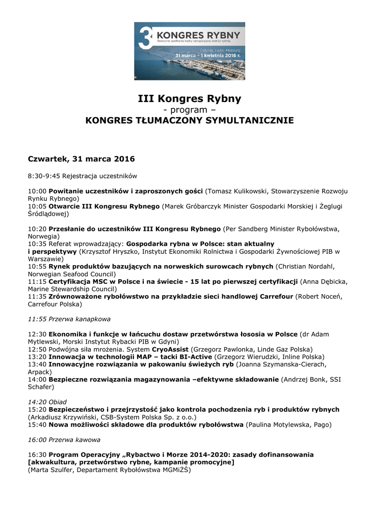 III Kongres Rybny - program – KONGRES TŁUMACZONY SYMULTANICZNIE Czwartek, 31 marca 2016 8:30-9:45 Rejestracja uczestników 10:00 Powitanie uczestników i zaproszonych gości (Tomasz Kulikowski, Stowarzyszenie Rozwoju Rynku Rybnego) 10:05 Otwarcie III Kongresu Rybnego (Marek Gróbarczyk Minister Gospodarki Morskiej i Żeglugi Śródlądowej) 10:20 Przesłanie do uczestników III Kongresu Rybnego (Per Sandberg Minister Rybołówstwa, Norwegia) 10:35 Referat wprowadzający: Gospodarka rybna w Polsce: stan aktualny i perspektywy (Krzysztof Hryszko, Instytut Ekonomiki Rolnictwa i Gospodarki Żywnościowej PIB w Warszawie) 10:55 Rynek produktów bazujących na norweskich surowcach rybnych (Christian Nordahl, Norwegian Seafood Council) 11:15 Certyfikacja MSC w Polsce i na świecie - 15 lat po pierwszej certyfikacji (Anna Dębicka, Marine Stewardship Council) 11:35 Zrównoważone rybołówstwo na przykładzie sieci handlowej Carrefour (Robert Noceń, Carrefour Polska) 11:55 Przerwa kanapkowa 12:30 Ekonomika i funkcje w łańcuchu dostaw przetwórstwa łososia w Polsce (dr Adam Mytlewski, Morski Instytut Rybacki PIB w Gdyni) 12:50 Podwójna siła mrożenia. System CryoAssist (Grzegorz Pawlonka, Linde Gaz Polska) 13:20 Innowacja w technologii MAP – tacki BI-Active (Grzegorz Wierudzki, Inline Polska) 13:40 Innowacyjne rozwiązania w pakowaniu świeżych ryb (Joanna Szymanska-Cierach, Arpack) 14:00 Bezpieczne rozwiązania magazynowania –efektywne składowanie (Andrzej Bonk, SSI Schafer) 14:20 Obiad 15:20 Bezpieczeństwo i przejrzystość jako kontrola pochodzenia ryb i produktów rybnych (Arkadiusz Krzywiński, CSB-System Polska Sp. z o.o.) 15:40 Nowa możliwości składowe dla produktów rybołówstwa (Paulina Motylewska, Pago) 16:00 Przerwa kawowa 16:30 Program Operacyjny „Rybactwo i Morze 2014-2020: zasady dofinansowania [akwakultura, przetwórstwo rybne, kampanie promocyjne] (Marta Szulfer, Departament Rybołówstwa MGMiŻŚ) 17:00 Dyskusja panelowa: program operacyjny i wyzwania dla organizacji rybackich sektora rybołówstwa i akwakultury (paneliści: przedstawiciele 7 zaproszonych organizacji branżowych, moderator: Tomasz Kulikowski, Magazyn Przemysłu Rybnego) 19:00-3:00 Gala nagród Złotej Płetwy Reklamy i uroczysta kolacja Piątek, 1 kwietnia 2016 7:00-9:00 śniadanie 9:00 Krajowa hodowla ryb, a rynek dla produktów akwakultury (dr inż. Andrzej Lirski, Instytut Rybactwa Śródlądowego w Olsztynie Krzysztof Hryszko, Instytut Ekonomiki Rolnictwa i Gospodarki Żywnościowej PIB w Warszawie) 9:20 RAS — szanse i zagrożenia w warunkach Polski — średniej wielkości kraju należącego do UE (prof. Jacek Sadowski, Zachodniopomorski Uniwersytet Technologiczny w Szczecinie) 9:40 RAS - studium przypadku: hodowla łososia atlantyckiego Jurassic Salmon (Mirosław Półgęsek, Zachodniopomorski Uniwersytet Technologiczny w Szczecinie) 10:00 "FULL LIFE CYCLE - Koncepcja i możliwości dla sektora Aquakultury oferowane przez Veolia Water Technologies" (Krzysztof Cupiał, Veolia Water Technologies Sp. z o.o.) 10:20 Technologie natleniania w obiegach zamkniętych RAS (Łukasz Betliński, Linde Gaz Polska) 10:40 Principles of RAS technology (Jens G. Jensen, AKVA group) 10:55 Fish health aspects and optimizing of aquaculture production (Paal Christian Krüger, Fishguard) 11:10 przerwa kawowa 11:25 Listeria monocytogenes - ocena sytuacji w przetwórstwie rybnym, metody ograniczenia ryzyka zakażeń produktów (dr hab. inż. Elżbieta Bogusławska-Wąs, Zachodniopomorski Uniwersytet Technologiczny w Szczecinie) 11:45 Systemy mycia i dezynfekcji w przetwórstwie rybnym (+ Listeria monocytogenes — ocena sytuacji) (Wojciech Gidel., Salmon Hygiene Polska Sp. z o.o.) 12:05 Mycie usługowe sposobem na zapewnienie bezpieczeństwa mikrobiologicznego oraz nowoczesne rozwiązania techniczne i chemiczne (Arkadiusz Miliński, Radex) 12:25 Antybakteryjne posadzki żywiczne dla przemysłu rybnego (Krzysztof Lewandowski, Flowcrete) 12:45 Od problemu do korzyści – zagospodarowanie ścieków i odpadów a produkcja energii w przetwórstwie rybnym (dr Monika Otulak-Komenda, Enprotech) 13:05 Ozonowanie – fakty i mity (Robert Muszański, Wofil Ozone Technology) 13:25 Dyskusja podsumowująca (moderacja: Tomasz Kulikowski, Stowarzyszenie Rozwoju Rynku Rybnego w Gdyni) 13:40-14:40 Polsko-norweskie seminarium na temat nowoczesnych technologii w akwakulturze. Prezentacje: Opportunities for industrial land based fish farming in Poland (Børge Søraas, Lars Andreas Østbø Munch, AquaOptima); A provider of premium fish health solutions (Rune Wiulsrød, PHARMAQ), Fupe Systems. 14:00-15:10 Obiad