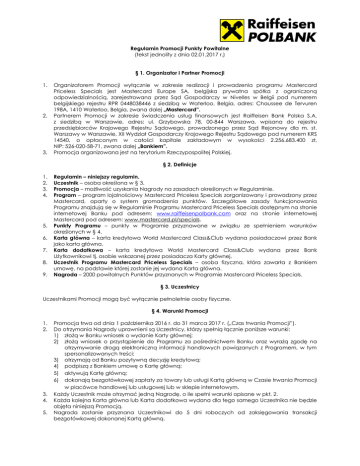 Regulamin Promocji Punkty Powitalne (tekst jednolity z dnia 02.01.2017 r.) § 1. Organizator i Partner Promocji 1. 2. 3. Organizatorem Promocji wyłącznie w zakresie realizacji i prowadzenia programu Mastercard Priceless Specials jest Mastercard Europe SA, belgijska prywatna spółka z ograniczoną odpowiedzialnością, zarejestrowana przez Sąd Gospodarczy w Nivelles w Belgii pod numerem belgijskiego rejestru RPR 0448038446 z siedzibą w Waterloo, Belgia, adres: Chaussee de Tervuren 198A, 1410 Waterloo, Belgia, zwana dalej „Mastercard”. Partnerem Promocji w zakresie świadczenia usług finansowych jest Raiffeisen Bank Polska S.A. z siedzibą w Warszawie, adres: ul. Grzybowska 78, 00-844 Warszawa, wpisana do rejestru przedsiębiorców Krajowego Rejestru Sądowego, prowadzonego przez Sąd Rejonowy dla m. st. Warszawy w Warszawie, XII Wydział Gospodarczy Krajowego Rejestru Sądowego pod numerem KRS 14540, o opłaconym w całości kapitale zakładowym w wysokości 2.256.683.400 zł, NIP: 526-020-58-71, zwana dalej „Bankiem”. Promocja organizowana jest na terytorium Rzeczypospolitej Polskiej. § 2. Definicje 1. 2. 3. 4. 5. 6. 7. 8. 9. Regulamin – niniejszy regulamin. Uczestnik – osoba określona w § 3. Promocja – możliwość uzyskania Nagrody na zasadach określonych w Regulaminie. Program – program lojalnościowy Mastercard Priceless Specials zorganizowany i prowadzony przez Mastercard, oparty o system gromadzenia punktów. Szczegółowe zasady funkcjonowania Programu znajdują się w Regulaminie Programu Mastercard Priceless Specials dostępnym na stronie internetowej Banku pod adresem: www.raiffeisenpolbank.com oraz na stronie internetowej Mastercard pod adresem: www.mastercard.pl/specials. Punkty Programu – punkty w Programie przyznawane w związku ze spełnieniem warunków określonych w § 4. Karta główna – karta kredytowa World Mastercard Class&Club wydana posiadaczowi przez Bank jako karta główna. Karta dodatkowa – karta kredytowa World Mastercard Class&Club wydana przez Bank Użytkownikowi tj. osobie wskazanej przez posiadacza Karty głównej. Uczestnik Programu Mastercard Priceless Specials – osoba fizyczna, która zawarła z Bankiem umowę, na podstawie której zostanie jej wydana Karta główna. Nagroda – 2000 powitalnych Punktów przyznanych w Programie Mastercard Priceless Specials. § 3. Uczestnicy Uczestnikami Promocji mogą być wyłącznie pełnoletnie osoby fizyczne. § 4. Warunki Promocji 1. 2. 3. 4. 5. Promocja trwa od dnia 1 października 2016 r. do 31 marca 2017 r. („Czas trwania Promocji”). Do otrzymania Nagrody uprawnieni są Uczestnicy, którzy spełnią łącznie poniższe warunki: 1) złożą w Banku wniosek o wydanie Karty głównej; 2) złożą wniosek o przystąpienie do Programu za pośrednictwem Banku oraz wyrażą zgodę na otrzymywanie drogą elektroniczną informacji handlowych powiązanych z Programem, w tym spersonalizowanych treści; 3) otrzymają od Banku pozytywną decyzję kredytową; 4) podpiszą z Bankiem umowę o Kartę główną; 5) aktywują Kartę główną; 6) dokonają bezgotówkowej zapłaty za towary lub usługi Kartą główną w Czasie trwania Promocji w placówce handlowej lub usługowej lub w sklepie internetowym. Każdy Uczestnik może otrzymać jedną Nagrodę, o ile spełni warunki opisane w pkt. 2. Każda kolejna Karta główna lub Karta dodatkowa wydana dla tego samego Uczestnika nie będzie objęta niniejszą Promocją. Nagroda zostanie przyznana Uczestnikowi do 5 dni roboczych od zaksięgowania transakcji bezgotówkowej dokonanej Kartą główną. § 5. Reklamacje 1. Wszelkie reklamacje dotyczące spełnienia warunków opisanych w § 4 ust. 2 oraz związanych ze świadczeniem usługi finansowej można składać za pośrednictwem Banku: 1) osobiście – w każdej placówce Banku, przy czym wymaga to zachowania formy pisemnej; 2) telefonicznie – w Centrum Telefonicznym; 3) listownie – za pośrednictwem poczty do dowolnej placówki Banku lub przesyłając na adres Banku: Raiffeisen Bank Polska S.A., Zespół Obsługi Reklamacji, ul. Grzybowska 78, 00-844 Warszawa, z dopiskiem „Punkty powitalne MC Priceless Specials”; 4) za pośrednictwem elektronicznych kanałów dostępu lub innych kanałów komunikowania się na odległość – o ile Bank udostępnił Klientowi taką usługę. 2. Wszelkie reklamacje dotyczące Punktów w Programie Mastercard Priceless Specials można składać: 1) telefonicznie – w Centrum Telefonicznego Mastercard (Numer Tel. 61 664 60 14); 2) listownie – za pośrednictwem poczty przesyłając na adres: skrytka pocztowa 20, 62-056 Komorniki; z dopiskiem "Priceless Specials”. 3. Rozpatrzenie reklamacji przez Mastercard nastąpi zgodnie z postanowieniami Regulaminu Programu Mastercard Priceless Specials. 4. Klient powinien zgłosić reklamację najszybciej jak to możliwe po uzyskaniu informacji o zaistnieniu okoliczności budzących zastrzeżenia, w celu umożliwienia rzetelnego rozpatrzenia reklamacji. 5. Jeżeli na podstawie treści reklamacji nie można należycie ustalić jej przedmiotu, Bank lub odpowiednio Mastercard występuje do Klienta o przedstawienie wyjaśnień lub dodatkowych informacji. 6. Reklamacje dotyczące usług finansowych rozpatrywane są przez Bank bez zbędnej zwłoki, nie później niż w terminie 30 dni kalendarzowych od daty jej otrzymania. Termin rozpatrzenia reklamacji może ulec przedłużeniu w przypadku spraw szczególnie skomplikowanych lub wymagających dodatkowych wyjaśnień. W takim przypadku, odpowiednio, Bank lub Mastercard poinformuje składającego reklamację o opóźnieniu w jej rozpatrywaniu oraz jego przyczynach. 7. Odpowiedź na reklamację Klienta przekazywana jest w formie pisemnej na adres korespondencyjny Klienta. 8. Podmiot rozpatrujący zastrzega sobie prawo do innej formy kontaktu z Klientem ze względu na specyfikę rozpatrywanej reklamacji, np.: 1) telefonicznie lub w postaci wiadomości SMS na ostatni poda