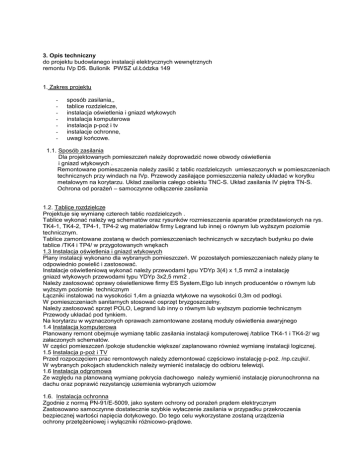 3. Opis techniczny do projektu budowlanego instalacji elektrycznych wewnętrznych remontu IVp DS. Bulionik PWSZ ul.Łódzka 149 1. Zakres projektu - sposób zasilania,, tablice rozdzielcze, instalacja oświetlenia i gniazd wtykowych instalacja komputerowa instalacja p-poż i tv instalacje ochronne, uwagi końcowe. 1.1. Sposób zasilania Dla projektowanych pomieszczeń należy doprowadzić nowe obwody oświetlenia i gniazd wtykowych . Remontowane pomieszczenia należy zasilić z tablic rozdzielczych umieszczonych w pomieszczeniach technicznych przy windach na IVp. Przewody zasilające pomieszczenia należy układać w korytku metalowym na korytarzu. Układ zasilania całego obiektu TNC-S. Układ zasilania IV piętra TN-S. Ochrona od porażeń – samoczynne odłączenie zasilania 1.2. Tablice rozdzielcze Projektuje się wymianę czterech tablic rozdzielczych . Tablice wykonać należy wg schematów oraz rysunków rozmieszczenia aparatów przedstawionych na rys. TK4-1, TK4-2, TP4-1, TP4-2 wg materiałów firmy Legrand lub innej o równym lub wyższym poziomie technicznym. Tablice zamontowane zostaną w dwóch pomieszczeniach technicznych w szczytach budynku po dwie tablice /TK4 i TP4/ w przygotowanych wnękach 1.3 Instalacja oświetlenia i gniazd wtykowych Plany instalacji wykonano dla wybranych pomieszczeń. W pozostałych pomieszczeniach należy plany te odpowiednio powielić i zastosować. Instalacje oświetleniową wykonać należy przewodami typu YDYp 3(4) x 1,5 mm2 a instalację gniazd wtykowych przewodami typu YDYp 3x2,5 mm2 . Należy zastosować oprawy oświetleniowe firmy ES System,Elgo lub innych producentów o równym lub wyższym poziomie technicznym Łączniki instalować na wysokości 1,4m a gniazda wtykowe na wysokości 0,3m od podłogi. W pomieszczeniach sanitarnych stosować osprzęt bryzgoszczelny. Należy zastosować sprzęt POLO, Legrand lub inny o równym lub wyższym poziomie technicznym Przewody układać pod tynkiem. Na korytarzu w wyznaczonych oprawach zamontowane zostaną moduły oświetlenia awaryjnego 1.4 Instalacja komputerowa Planowany remont obejmuje wymianę tablic zasilania instalacji komputerowej /tablice TK4-1 i TK4-2/ wg załaczonych schematów. W części pomieszczeń /pokoje studenckie większe/ zaplanowano również wymianę instalacji logicznej. 1.5 Instalacja p-poż i TV Przed rozpoczęciem prac remontowych należy zdemontować częściowo instalację p-poż. /np.czujki/. W wybranych pokojach studenckich należy wymienić instalację do odbioru telewizji. 1.6 Instalacja odgromowa Ze względu na planowaną wymianę pokrycia dachowego należy wymienić instalację piorunochronna na dachu oraz poprawić rezystancję uziemienia wybranych uziomów 1.6. Instalacja ochronna Zgodnie z normą PN-91/E-5009, jako system ochrony od porażeń prądem elektrycznym Zastosowano samoczynne dostatecznie szybkie wyłaczenie zasilania w przypadku przekroczenia bezpiecznej wartości napięcia dotykowego. Do tego celu wykorzystane zostaną urządzenia ochrony przetężeniowej i wyłączniki różnicowo-prądowe. W pomieszczeniach sanitarnych z natryskami należy wykonać połączenia wyrównawcze miejscowe. Połaczenia te należy wykonać przewodem LY(żo) 6 mm2, łącząc metalowe elementy instalacji i wyposażenia sanitariatów oraz obudowy kabin i niecki z przewodem ochronnym. 1.7 Uwagi końcowe Wszystkie prace wykonać należy zgodnie z PBUE i BHP . Prace związane z prowadzeniem instalacji elektrycznej wykonać po ułożeniu instalacji sanitarnych . Po zakończeniu prac montażowych wykonać należy pomiary rezystancji izolacji i rezystancji uziemienia . Wyniki pomiarów zestawić należy w specjalnym protokóle .