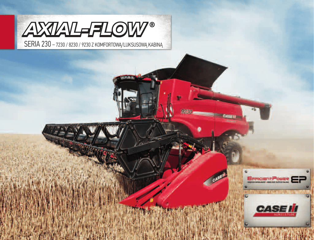 Axial-Flow ® SERIA 230 – 7230 / 8230 / 9230 Z KOMFORTOWĄ/LUKSUSOWĄ KABINĄ ODNIEŚ SUKCES W ŻNIWA 2 WPROWADZENIE WYDAJNE ŻNIWA: PRACA ZESPOŁOWA KOMBAJNU I OPERATORA W ciągu ostatnich 35 lat firma CASE IH udoskonaliła konstrukcję kombajnu z pojedynczym rotorem, dzięki czemu nasze maszyny osiągają najwyższe parametry w zakresie wydajności, sprawności i efektywności. Miarą sukcesu gospodarstwa jest zysk otrzymany z plonów. Sezon żniwny to jedyna okazja na zebranie ziarna z pola i dostarczenie go na rynek w idealnym stanie. Żaden inny kombajn nie wykona tej pracy tak efektywnie, jak Axial-Flow® serii 230. NAJWIĘKSZA WYDAJNOŚĆ... Nowe kombajny Axial-Flow® serii 230 są nieporównywalne z innymi kombajnami na rynku w zakresie wydajności. Moc do 571 KM oraz zbiornik ziarna o pojemności aż 12 330 litrów nie pozostawiają żadnych wątpliwości. Są to maszyny przeznaczone do tego, aby umieścić tony ziarna na przyczepie w krótkim czasie – w każdych warunkach zbioru każdej uprawy. Technologia pojedynczego rotora opracowana przez CASE IH ponad 35 lat temu poddawana jest ciągłym udoskonaleniom, zapewniając delikatny omłot i wysoką jakość słomy. Są to cechy charakterystyczne najnowszych kombajnów Axial-Flow®. Konstruktorzy CASE IH rozumieją, że zebrane ziarno jest kluczem do maksymalizacji dochodów, jednak koszt paliwa jest jednym z największych wydatków rolników. Szybkie zebranie uprawy z pola nic nie znaczy, jeśli następuje kosztem większego zużycia paliwa lub wzrostu strat ziarna. Nowe kombajny Axial-Flow® posiadają udoskonalony silnik, przekładnię i rotor, które w połączeniu z nowoczesną kabiną pozwalają operatorowi wykorzystać pełną moc z każdej kropli paliwa i zapewniają długotrwałą niezawodność każdego komponentu. Według niezależnych źródeł kombajny Axial-Flow® charakteryzują się znacznie niższymi kosztami serwisowania i konserwacji w porównaniu z kombajnami innych producentów. Potwierdza to ciągłe starania CASE IH w kierunku zmniejszenia kosztów eksploatacji maszyn i negatywnego wpływu na środowisko naturalne. ŁATWOŚĆ OBSŁUGI Kombajny Axial-Flow® znane są z komfortowego środowiska pracy operatora. Na podstawie informacji uzyskanych w kontaktach z użytkownikami kombajnów CASE IH wprowadza nową kabinę wykorzystującą nowoczesną technologię w celu stworzenia idealnego środowiska pracy dla operatora, aby mógł w pełni skoncentrować się na pracy. Znaczy to wydajny i opłacalny zbiór bez stresu. Jedna rzecz, która nie uległa zmianie, to nasze zobowiązanie do prostych i skutecznych rozwiązań – w zakresie pracy, serwisowania i zarządzania maszyną. BOGATA TRADYCJA Kombajny z pojedynczym rotorem stanowią pionierskie dzieło inżynierów Axial-Flow®. Mamy ponad trzydzieści pięć lat doświadczenia, a nasza wiara w skuteczność technologii omłotu i separacji z pojedynczym rotorem jest podstawą naszego zaangażowania w rozwój tej konstrukcji. Jednak niewiele by to znaczyło bez poparcia tysięcy rolników, którzy kupują kombajny Axial-Flow® każdego roku od chwili kiedy wprowadziliśmy je na rynek. Niniejsza broszura wyjaśnia, dlaczego uważamy, że Axial-Flow® jest najlepszym wyborem. Chociaż fakt, że Axial-Flow® ma już 150 tysięcy zadowolonych klientów, mówi o wiele więcej. 3 HISTORIA SUKCESU 4 1831 1842 1863 1915 Cyrus McCormick wprowadza pierwszą na świecie żniwiarkę. Jerome Increase CASE produkuje pierwszą młocarnię w Racine, Wisconsin. W Racine powstaje J.I. CASE i Spółka. International Harvester konstruuje swój pierwszy kombajn. 1977 1987 1993 2002 2003 Wprowadzenie na rynek pierwszych kombajnów Axial-Flow® serii 1400. Wprowadzenie nowej, specjalnej konstrukcji rotora, aby zapewnić większą wydajność omłotu. Zmodernizowane kombajny trzeciej generacji Axial-Flow® serii 1600 z nowym wentylatorem Cross Flow. Rotor Axial-Flow został ponownie udoskonalony, aby poprawić wydajność podczas zbioru upraw o twardych łodygach, takich jak ryż czy fasola. ® CASE IH, jako pierwszy producent w branży, wykorzystuje technologię ekranu dotykowego i wprowadza zaawansowany monitor AFS, aby obsługa kombajnu była łatwiejsza i bardziej wydajna. Sukces CASE IH jest oparty na sile historii. W wyniku ciągłego rozwoju jesteśmy dzisiaj drugim największym producentem maszyn rolniczych na świecie. Dzięki ciągłemu rozwojowi i poszerzaniu oferty CASE IH może obecnie proponować klientom najbogatszą gamę produktów. 2007 30-lecie Axial-Flow – sześć generacji pionierskiej technologii. ® 2008 2011 2012 Rotor ST oferuje lepszy przepływ masy, zapewniając dużą przepustowość i wysoką jakość ziarna, jednocześnie oszczędzając moc i gwarantując lepszą jakość słomy, nawet w warunkach wysokiej wilgotności. Do 2011 roku 150 000 sztuk kombajnów Axial-Flow® zjechało z linii produkcyjnej w fabryce w Grand Island, Nebraska. CASE IH dokonuje kolejnego kroku w modernizacji Axial-Flow®, wprowadzając maszyny nowej generacji, wyposażone w wydajne silniki Efficient Power i wiele innych nowych rozwiązań. OF AGRICULTURAL ENGINEERING 5 POCHODZENIE KOMBAJNU AXIAL-FLOW® 6 GRAND ISLAND, NEBRASKA – TRADYCJA PRZYWÓDZTWA CASE IH napędza rolnictwo od ponad 160 lat, a marka CASE IH reprezentuje tradycję przywództwa. Historia marki to połączenie wysiłku wielkich producentów sprzętu rolniczego i marek, takich jak między innymi CASE, International Harvester i David Brown. Każda z tych marek odegrała ważną rolę w historii i ewolucji CASE IH. Na przestrzeni lat wiele się zmieniło, ale legendarna czerwona marka będzie zawsze stanowić zobowiązanie do wspierania producentów rolnych w dążeniach do sukcesu. ZAKŁAD PRODUKCYJNY W GRAND ISLAND Jest to Centrum Doskonalenia Kombajnów spółki CNH w Ameryce Północnej. Ta nowoczesna fabryka uważana jest za jeden z najlepszych zakładów produkcyjnych w CNH. Trzy różne serie kombajnów