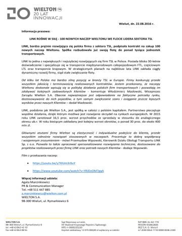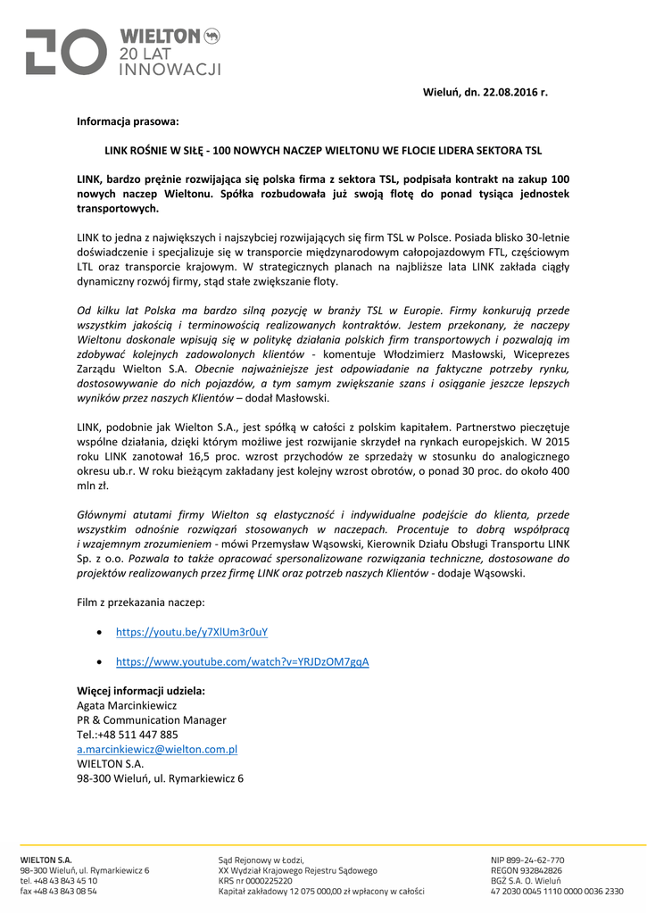 Wieluń, dn. 22.08.2016 r. Informacja prasowa: LINK ROŚNIE W SIŁĘ - 100 NOWYCH NACZEP WIELTONU WE FLOCIE LIDERA SEKTORA TSL LINK, bardzo prężnie rozwijająca się polska firma z sektora TSL, podpisała kontrakt na zakup 100 nowych naczep Wieltonu. Spółka rozbudowała już swoją flotę do ponad tysiąca jednostek transportowych. LINK to jedna z największych i najszybciej rozwijających się firm TSL w Polsce. Posiada blisko 30-letnie doświadczenie i specjalizuje się w transporcie międzynarodowym całopojazdowym FTL, częściowym LTL oraz transporcie krajowym. W strategicznych planach na najbliższe lata LINK zakłada ciągły dynamiczny rozwój firmy, stąd stałe zwiększanie floty. Od kilku lat Polska ma bardzo silną pozycję w branży TSL w Europie. Firmy konkurują przede wszystkim jakością i terminowością realizowanych kontraktów. Jestem przekonany, że naczepy Wieltonu doskonale wpisują się w politykę działania polskich firm transportowych i pozwalają im zdobywać kolejnych zadowolonych klientów - komentuje Włodzimierz Masłowski, Wiceprezes Zarządu Wielton S.A. Obecnie najważniejsze jest odpowiadanie na faktyczne potrzeby rynku, dostosowywanie do nich pojazdów, a tym samym zwiększanie szans i osiąganie jeszcze lepszych wyników przez naszych Klientów – dodał Masłowski. LINK, podobnie jak Wielton S.A., jest spółką w całości z polskim kapitałem. Partnerstwo pieczętuje wspólne działania, dzięki którym możliwe jest rozwijanie skrzydeł na rynkach europejskich. W 2015 roku LINK zanotował 16,5 proc. wzrost przychodów ze sprzedaży w stosunku do analogicznego okresu ub.r. W roku bieżącym zakładany jest kolejny wzrost obrotów, o ponad 30 proc. do około 400 mln zł. Głównymi atutami firmy Wielton są elastyczność i indywidualne podejście do klienta, przede wszystkim odnośnie rozwiązań stosowanych w naczepach. Procentuje to dobrą współpracą i wzajemnym zrozumieniem - mówi Przemysław Wąsowski, Kierownik Działu Obsługi Transportu LINK Sp. z o.o. Pozwala to także opracować spersonalizowane rozwiązania techniczne, dostosowane do projektów realizowanych przez firmę LINK oraz potrzeb naszych Klientów - dodaje Wąsowski. Film z przekazania naczep: https://youtu.be/y7XlUm3r0uY https://www.youtube.com/watch?v=YRJDzOM7gqA Więcej informacji udziela: Agata Marcinkiewicz PR & Communication Manager Tel.:+48 511 447 885 [email protected] WIELTON S.A. 98-300 Wieluń, ul. Rymarkiewicz 6 LINK SP. Z O.O. [www.linktransport.eu] jest wiodącym dostawcą nowoczesnych rozwiązań w branży TSL. Blisko 30-letnie doświadczenia w doskonaleniu procesów transportowo-logistycznych, liczne inwestycje w zespoły dedykowanych specjalistów, nowoczesną flotę oraz technologie IT pozwalają firmie LINK dostarczać usługi najwyższej jakości. LINK specjalizuje się w transporcie drogowym i spedycji na terenie całej Europy, główne kierunki to: Wielka Brytania, Niemcy, Belgia, Holandia, Francja, Czechy oraz Polska. LINK oferuje transport ładunków całopojazdowych (FTL), transport ładunków częściowych (LTL) oraz drobnicowych. Transporty realizowane są również w systemie Just-in Time. Cały proces transportu w firmie odbywa się z wykorzystaniem nowoczesnych narzędzi informatycznych. Zintegrowany system logistyczny wysokiej klasy czuwa nad prawidłową realizacją zlecenia poprzez śledzenie przesyłki (GPS), kontakt z kierowcą, planowanie zasobów aż po fakturowanie i elektroniczną wymianę danych (EDI). Na elastyczną i dostosowana do wymagań klientów obsługę wpływa także pięć baz transportowych zlokalizowanych w strategicznych miejscach, pod względem komunikacji w transporcie z krajami Europy: Gliwice, Łódź, Poznań, Wrocław oraz Ghent-Belgia. LINK posiada wieloletnie doświadczenie w obsłudze międzynarodowych klientów z takich sektorów jak: automotive, AGD, surowce i komponenty, chemia przemysłowa, FMCG oraz materiały budowlane. Do dyspozycji klientów firmy LINK pozostaje blisko 1000 jednostek transportowych, w tym ponad 300 nowoczesnych ciągników siodłowych floty własnej (średni wiek 1,5 roku, normy EURO 6) oraz około 600 naczep typu mega, wspieranych przez dodatkowe zasoby podwykonawców. Spółka LINK oferuje profesjonalną obsługę, bezpieczeństwo, terminowość oraz wysoką jakość świadczonych usług. Firma posiada liczne pozwolenia, licencje oraz certyfikaty wg normy PN-EN ISO 9001, ISO14000, OHSAS18001 i SQAS. O Wieltonie: Wielton S.A. z siedzibą w Wieluniu to największy polski producent naczep, przyczep i zabudów samochodowych. Spółka notowana na Giełdzie Papierów Wartościowych w Warszawie należy do grona trzech największych producentów w swojej branży w Europie. W ofercie firmy znajduje się 65 typów produktów. Klientami Wieltonu są firmy transportowe, budowlane, produkcyjne, dystrybucyjne i rolnicze. Dzięki rozbudowanej sieci sprzedaży na drogi Europy wyjechało już ponad 60 000 naczep i przyczep. Trafiają one do 35 krajów europejskich, w tym m.in.: do Polski, Niemiec, Francji i Włoch, a także do krajów Azji i Afryki. Grupa Wielton posiada dwa zakłady produkcyjne: w Polsce oraz we Francji, a także dwie montownie: we Włoszech i w Rosji. Swoim klientom zapewnia również wsparcie serwisowe w całej Europie. W 2015 r. Wielton otrzymał status Centrum Badawczo-Rozwojowego. Inwestycje w badania i rozwój to dla spółki istotny element strategii. Już dziś firma współpracuje z instytutami i uczelniami w Polsce i za granicą, a Centrum Badań i Rozwoju posiada jedyną w Polsce a drugą w Europie stację do całopojazdowego badania naczepy.