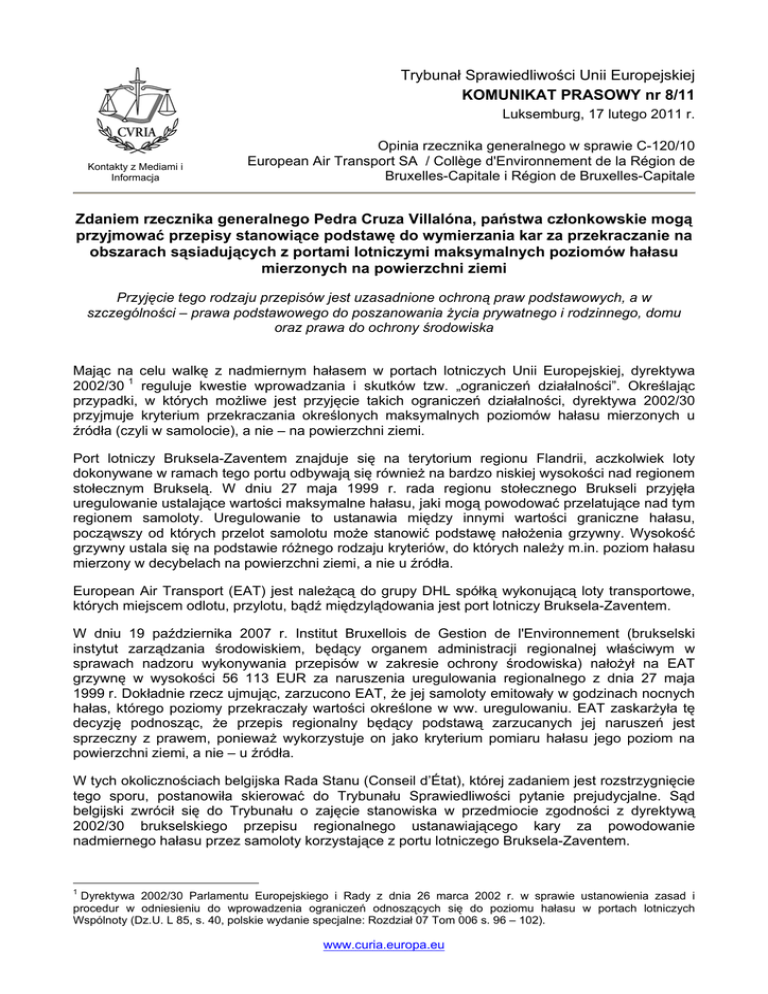 Trybunał Sprawiedliwości Unii Europejskiej KOMUNIKAT PRASOWY nr 8/11 Luksemburg, 17 lutego 2011 r. Kontakty z Mediami i Informacja Opinia rzecznika generalnego w sprawie C-120/10 European Air Transport SA / Collège d'Environnement de la Région de Bruxelles-Capitale i Région de Bruxelles-Capitale Zdaniem rzecznika generalnego Pedra Cruza Villalóna, państwa członkowskie mogą przyjmować przepisy stanowiące podstawę do wymierzania kar za przekraczanie na obszarach sąsiadujących z portami lotniczymi maksymalnych poziomów hałasu mierzonych na powierzchni ziemi Przyjęcie tego rodzaju przepisów jest uzasadnione ochroną praw podstawowych, a w szczególności – prawa podstawowego do poszanowania życia prywatnego i rodzinnego, domu oraz prawa do ochrony środowiska Mając na celu walkę z nadmiernym hałasem w portach lotniczych Unii Europejskiej, dyrektywa 2002/30 1 reguluje kwestie wprowadzania i skutków tzw. „ograniczeń działalności”. Określając przypadki, w których możliwe jest przyjęcie takich ograniczeń działalności, dyrektywa 2002/30 przyjmuje kryterium przekraczania określonych maksymalnych poziomów hałasu mierzonych u źródła (czyli w samolocie), a nie – na powierzchni ziemi. Port lotniczy Bruksela-Zaventem znajduje się na terytorium regionu Flandrii, aczkolwiek loty dokonywane w ramach tego portu odbywają się również na bardzo niskiej wysokości nad regionem stołecznym Brukselą. W dniu 27 maja 1999 r. rada regionu stołecznego Brukseli przyjęła uregulowanie ustalające wartości maksymalne hałasu, jaki mogą powodować przelatujące nad tym regionem samoloty. Uregulowanie to ustanawia między innymi wartości graniczne hałasu, począwszy od których przelot samolotu może stanowić podstawę nałożenia grzywny. Wysokość grzywny ustala się na podstawie różnego rodzaju kryteriów, do których należy m.in. poziom hałasu mierzony w decybelach na powierzchni ziemi, a nie u źródła. European Air Transport (EAT) jest należącą do grupy DHL spółką wykonującą loty transportowe, których miejscem odlotu, przylotu, bądź międzylądowania jest port lotniczy Bruksela-Zaventem. W dniu 19 października 2007 r. Institut Bruxellois de Gestion de l'Environnement (brukselski instytut zarządzania środowiskiem, będący organem administracji regionalnej właściwym w sprawach nadzoru wykonywania przepisów w zakresie ochrony środowiska) nałożył na EAT grzywnę w wysokości 56 113 EUR za naruszenia uregulowania regionalnego z dnia 27 maja 1999 r. Dokładnie rzecz ujmując, zarzucono EAT, że jej samoloty emitowały w godzinach nocnych hałas, którego poziomy przekraczały wartości określone w ww. uregulowaniu. EAT zaskarżyła tę decyzję podnosząc, że przepis regionalny będący podstawą zarzucanych jej naruszeń jest sprzeczny z prawem, ponieważ wykorzystuje on jako kryterium pomiaru hałasu jego poziom na powierzchni ziemi, a nie – u źródła. W tych okolicznościach belgijska Rada Stanu (Conseil d’État), której zadaniem jest rozstrzygnięcie tego sporu, postanowiła skierować do Trybunału Sprawiedliwości pytanie prejudycjalne. Sąd belgijski zwrócił się do Trybunału o zajęcie stanowiska w przedmiocie zgodności z dyrektywą 2002/30 brukselskiego przepisu regionalnego ustanawiającego kary za powodowanie nadmiernego hałasu przez samoloty korzystające z portu lotniczego Bruksela-Zaventem. 1 Dyrektywa 2002/30 Parlamentu Europejskiego i Rady z dnia 26 marca 2002 r. w sprawie ustanowienia zasad i procedur w odniesieniu do wprowadzenia ograniczeń odnoszących się do poziomu hałasu w portach lotniczych Wspólnoty (Dz.U. L 85, s. 40, polskie wydanie specjalne: Rozdział 07 Tom 006 s. 96 – 102). www.curia.europa.eu Przede wszystkim, w przedstawionej dzisiaj opinii, rzecznik generalny Pedro Cruz Villalón stanął na stanowisku, iż „ograniczenie działalności” stanowi środek o charakterze zakazu całkowitego lub czasowego, ustanowiony uprzednio i na podstawie obiektywnych kryteriów, który wyraźnie uniemożliwia, a nie – jedynie utrudnia czy też czyni mniej atrakcyjnym, dostęp samolotu cywilnego do portu lotniczego w Unii Europejskiej. Rzecznik generalny wyjaśnił ponadto, że ograniczenia działalności stanowią szczególnego rodzaju zakazy ustanowione w ramach polityki transportowej. Ograniczenia te współistnieją zatem z innymi przepisami krajowymi dotyczącymi środowiska naturalnego. Na tej podstawie P. Cruz Villalón wyciągnął wniosek, że belgijskie regionalne uregulowanie karne stanowiące podstawę do wymierzania grzywien za przekraczanie na obszarach sąsiadujących z portem lotniczym określonych maksymalnych poziomów hałasu mierzonych na powierzchni ziemi, nie jest objęte zakresem stosowania dyrektywy 2002/30 ze względu na to, iż nie stanowi „ograniczenia działalności”. W szczególności, rozpatrywany przepis przyjęty przez region stołeczny Bruksela nie zakazuje ex ante, całkowicie lub czasowo, dostępu do portu lotniczego Bruksela-Zaventem, lecz zabrania przekraczania określonych poziomów hałasu. Zgodnie z tym przepisem regionalnym nic nie stoi zatem na przeszkodzie temu, aby samolot mógł lądować i startować we wspomnianym porcie lotniczym, a prawnym skutkiem przekroczenia ustalonych przez ten przepis ograniczeń jest kara, a nie – zakaz dostępu. Ten przepis regionalny nie został ponadto przyjęty w ramach prowadzenia polityki transportowej, nie został też zatwierdzony, ani nie jest stosowany przez organy właściwe w tej dziedzinie z tego względu, że stanowi on część uregulowania z zakresu ochrony środowiska, do uchwalania którego regiony belgijskie posiadają konstytucyjnie przyznane kompetencje. W drugiej kolejności rzecznik generalny stwierdził, że przepis krajowy taki jak ten przyjęty przez region stołeczny Bruksela, który nie stanowi ograniczenia działalności i wykorzystuje jako kryterium pomiaru hałasu jego poziom na powierz