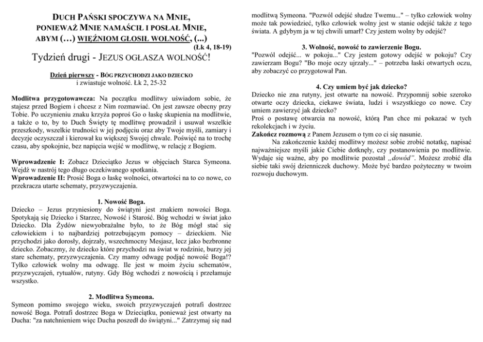 DUCH PAŃSKI SPOCZYWA NA MNIE, PONIEWAŻ MNIE NAMAŚCIŁ I POSŁAŁ MNIE, ABYM (…) WIĘŹNIOM GŁOSIŁ WOLNOŚĆ, (...) (Łk 4, 18-19) Tydzień drugi - JEZUS OGŁASZA WOLNOŚĆ! Dzień pierwszy - BÓG PRZYCHODZI JAKO DZIECKO i zwiastuje wolność. Łk 2, 25-32 Modlitwa przygotowawcza: Na początku modlitwy uświadom sobie, że stajesz przed Bogiem i chcesz z Nim rozmawiać. On jest zawsze obecny przy Tobie. Po uczynieniu znaku krzyża poproś Go o łaskę skupienia na modlitwie, a także o to, by to Duch Święty tę modlitwę prowadził i usuwał wszelkie przeszkody, wszelkie trudności w jej podjęciu oraz aby Twoje myśli, zamiary i decyzje oczyszczał i kierował ku większej Swojej chwale. Poświęć na to trochę czasu, aby spokojnie, bez napięcia wejść w modlitwę, w relację z Bogiem. Wprowadzenie I: Zobacz Dzieciątko Jezus w objęciach Starca Symeona. Wejdź w nastrój tego długo oczekiwanego spotkania. Wprowadzenie II: Prosić Boga o łaskę wolności, otwartości na to co nowe, co przekracza utarte schematy, przyzwyczajenia. 1. Nowość Boga. Dziecko – Jezus przyniesiony do świątyni jest znakiem nowości Boga. Spotykają się Dziecko i Starzec, Nowość i Starość. Bóg wchodzi w świat jako Dziecko. Dla Żydów niewyobrażalne było, to że Bóg mógł stać się człowiekiem i to najbardziej potrzebującym pomocy – dzieckiem. Nie przychodzi jako dorosły, dojrzały, wszechmocny Mesjasz, lecz jako bezbronne dziecko. Zobaczmy, że dziecko które przychodzi na świat w rodzinie, burzy jej stare schematy, przyzwyczajenia. Czy mamy odwagę podjąć nowość Boga!? Tylko człowiek wolny ma odwagę. Ile jest w moim życiu schematów, przyzwyczajeń, rytuałów, rutyny. Gdy Bóg wchodzi z nowością i przełamuje wszystko. 2. Modlitwa Symeona. Symeon pomimo swojego wieku, swoich przyzwyczajeń potrafi dostrzec nowość Boga. Potrafi dostrzec Boga w Dzieciątku, ponieważ jest otwarty na Ducha: "za natchnieniem więc Ducha poszedł do świątyni..." Zatrzymaj się nad modlitwą Symeona. "Pozwól odejść słudze Twemu..." – tylko człowiek wolny może tak powiedzieć, tylko człowiek wolny jest w stanie odejść także z tego świata. A gdybym ja w tej chwili umarł? Czy jestem wolny by odejść? 3. Wolność, nowość to zawierzenie Bogu. "Pozwól odejść... w pokoju..." Czy jestem gotowy odejść w pokoju? Czy zawierzam Bogu? "Bo moje oczy ujrzały..." – potrzeba łaski otwartych oczu, aby zobaczyć co przygotował Pan. 4. Czy umiem być jak dziecko? Dziecko nie zna rutyny, jest otwarte na nowość. Przypomnij sobie szeroko otwarte oczy dziecka, ciekawe świata, ludzi i wszystkiego co nowe. Czy umiem zawierzyć jak dziecko? Proś o postawę otwarcia na nowość, którą Pan chce mi pokazać w tych rekolekcjach i w życiu. Zakończ rozmową z Panem Jezusem o tym co ci się nasunie. Na zakończenie każdej modlitwy możesz sobie zrobić notatkę, napisać najważniejsze myśli jakie Ciebie dotknęły, czy postanowienia po modlitwie. Wydaje się ważne, aby po modlitwie pozostał „dowód”. Możesz zrobić dla siebie taki swój dzienniczek duchowy. Może być bardzo pożyteczny w twoim rozwoju duchowym. Dzień drugi - JEZUS PRZYCHODZI JAKO PAN SZABATU. ŁK 5, 33 – 6, 5 Modlitwa przygotowawcza: jak w pierwszym dniu. Wprowadzenie I: Wejdź w nastrój polemiki Jezusa z faryzeuszami. Zobacz jak zachowują się faryzeusze, jak zachowują się uczniowie i jak postępuje Jezus. Wprowadzenie II: Poproś o łaskę otwartości na nowość, którą głosi Chrystus. Dzień trzeci - UZDROWIENIE W SZABAT. ŁK 6, 6-11 Modlitwa przygotowawcza: jak w pierwszym dniu. Wprowadzenie I: Zobacz Jezusa, który naucza w synagodze. Zobacz faryzeuszy, którzy go śledzą. Usłysz co mówi Jezus i jak reagują faryzeusze. Wprowadzenie II: Prosić o łaskę poznania jak Jezus uwalnia mnie od niemocy. 1. Nie tylko słowem lecz życiem. Zobaczmy jak Bóg głosi wolność. Nie słowem, lecz życiem, przykładem. Łamie schematy - gdy wchodzi między ludzi, w jednych budzi niepokój, w innych przeciwnie rodzi pokój. 1. Jezus pozostaje wolny od opinii faryzeuszy. Jezus wie, że jest śledzony przez swoich przeciwników. Chcą oni pochwycić Jezusa na słowie lub czynie, który będzie mógł być powodem do oskarżenia Go. Zobacz jak Jezus nie tylko naucza o wolności lecz jak sam pozostaje wolny. 2. Radość uczniów. Jezus jednym przynosi radość, innych wprowadza w zakłopotanie lub nawet gorszy. Jak to, Twoi uczniowie nie poszczą? Tylko człowiek prawdziwie wolny potrafi się radować tym, co jest w chwili obecnej. Wolność rodzi radość, niewola zaś smutek. 3. Miłość większa niż prawo. Jezus jest prawdziwie wolny. Jest tym, który głosi wolność całym życiem. Jest wrażliwy na podstawowe potrzeby człowieka – na głód uczniów. Jezus jest wrażliwy nie tylko na głód chleba materialnego, ale także na głód duchowy człowieka – pragnienie relacji z Bogiem. Sam daje Siebie samego w Chlebie Eucharystycznym. Jezus wie, że zrywając kłosy łamie prawo w oczach faryzeuszy. Swoim uczynkiem wskazuje, że miłość dla Niego jest większa niż prawo. Proś o łaskę otwarcia i przylgnięcia do Jezusa, który jest wolny i pragnie tą wolnością obdarzać człowieka. 2. Wolność wobec ludzkiej opinii. Na ile ja jestem wolny w relacjach z ludźmi? Na ile jestem wolny od ich opinii? A na ile chcę się im przypodobać rezygnując z tego, co dla mnie ważne lub z tego, co dobre dla moich bliźnich. 3. Człowiek ważniejszy niż prawo. Jezus będąc wolny od ludzkiej opinii czyni dobro – uzdrawia. Ze względu na dobro człowieka potrzebującego, ze względu na miłość do niego łamie schematy, prawo. Zobacz, że absolutnie wolny jest tylko Bóg i dlatego też czyni tylko dobro. Prawdziwa wolność rodzi się z nawrócenia – zwrócenia się w kierunku Boga, przylgnięcia do Niego. Wolność sprawia, że możemy nieskrępowanie czynić dobro. Człowiek wolny czyni dobro. 4.