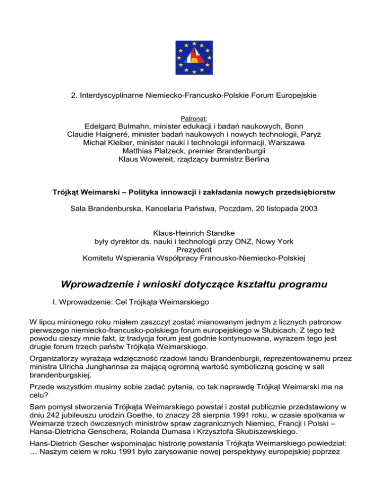 2. Interdyscyplinarne Niemiecko-Francusko-Polskie Forum Europejskie Patronat: Edelgard Bulmahn, minister edukacji i badań naukowych, Bonn Claudie Haigneré, minister badań naukowych i nowych technologii, ParyŜ Michał Kleiber, minister nauki i technologii informacji, Warszawa Matthias Platzeck, premier Brandenburgii Klaus Wowereit, rządzący burmistrz Berlina Trójkąt Weimarski – Polityka innowacji i zakładania nowych przedsiębiorstw Sala Brandenburska, Kancelaria Państwa, Poczdam, 20 listopada 2003 Klaus-Heinrich Standke były dyrektor ds. nauki i technologii przy ONZ, Nowy York Prezydent Komitetu Wspierania Współpracy Francusko-Niemiecko-Polskiej Wprowadzenie i wnioski dotyczące kształtu programu I. Wprowadzenie: Cel Trójkąta Weimarskiego W lipcu minionego roku miałem zaszczyt zostać mianowanym jednym z licznych patronow pierwszego niemiecko-francusko-polskiego forum europejskiego w Słubicach. Z tego teŜ powodu cieszy mnie fakt, iz tradycja forum jest godnie kontynuowana, wyrazem tego jest drugie forum trzech państw Trójkąta Weimarskiego. Organizatorzy wyraŜaja wdzięczność rzadowi landu Brandenburgii, reprezentowanemu przez ministra Ulricha Junghannsa za mającą ogromną wartość symboliczną goscinę w sali brandenburgskiej. Przede wszystkim musimy sobie zadać pytania, co tak naprawdę Trójkąt Weimarski ma na celu? Sam pomysl stworzenia Trójkąta Weimarskiego powstał i został publicznie przedstawiony w dniu 242 jubileuszu urodzin Goethe, to znaczy 28 sierpnia 1991 roku, w czasie spotkania w Weimarze trzech ówczesnych ministrów spraw zagranicznych Niemiec, Francji i Polski – Hansa-Dietricha Genschera, Rolanda Dumasa i Krzysztofa Skubiszewskiego. Hans-Dietrich Gescher wspominajac histrorię powstania Trójkąta Weimarskiego powiedział: … Naszym celem w roku 1991 było zarysowanie nowej perspektywy europejskiej poprzez stworzenie Łuku Weimarskiego, który napięty obejmowałby Francję, Niemcy i Polskę. Wspólnym dąŜeniem było utworzenie trójkąta o równych ramionach, w którym nie miałaby powstać przewaga niemiecko-francuska. Chcieliśmy się równieŜ do tego przyczynić, by dzięki luźnym ramom instytucjonalnym Trójkąta Weimarskiego, poszerzyła się wiedza o Polsce, aby przykładowo oprócz francuskich badan naukowych w Niemczech i badań niemieckich przeprowadzonych na terenie Francji przeprowadzano polskie badania w obu tych waŜnych krajach europy zachodniej... Polska stała się w ostatnim dziesięcioleciu członkiem ODCE oraz NATO. Przyłączenie Polski do UE, co było w momencie załoŜenia Trójkąta Weimarskiego (1991) odległym celem, stanie się 1 maja 2004 roku rzeczywistością. Nie wszyscy świadomi są faktu, iŜ przyczyniły się do tego takŜe liczne rozmowy i konsultacje w ramach Trojkata Weimarskiego Zgodnie z opinią wielu obserwatorów Trójkąt Weimarski dzięki swojej nieformalnej strukturze działania moŜe odegrać jeszcze waŜniejszą rolę po przystąpieniu Polski do struktur europejskich niŜ w czasie samego procesu akcesji. Kanclerz Niemiec G. Schröder nazwał to w taki sposób: Niemcy, Francja i Polska sa „twardym jądrem” znajdującej się w rozbudowie Europie. Oprócz corocznych spotkań ministrów spraw zagranicznych Niemiec, Francji i Polski w ramach Trójkąta Weimarskiego, prezydenci Francji i Polski oraz kanclerz Niemiec spotykają się na tzw. szczytach trilateralnym. Ponadto obraduja ze sobą równieŜ ministrowie prawie wszystkich resortów, grupy parlamentarne, przedstawiciele regionów, a w ramach niemiecko-francuskiej i niemiecko-polskiej organizacji młodzieŜowych spotyka się ze sobą tysiące młodych ludzi z trzech krajów. Nowością jest przedstawiony w czasie spotkania szczytu weimarskiego 9 maja 2003 roku we Wrocławiu postulat uwzględnienia potencjalu struktur pozarządowych w przyszłej współpracy tych trzech państw, będący gwarantem jeszcze ściślejszej koperacji między Niemcami, Francją i Polską. Jest to teŜ punktem wyjściowym dla pracy naszego komitetu. Komitet Wsparcia Niemiecko-Francusko-Polskiej Współpracy czyli Trójkąt Weimarski, któremu patronuje trzech ówczesnych ministrów spraw zagranicznych, powstał poprzedniego roku na bazie powstałego w 1973 r. w ParyŜu, tzn. 10 lat po zawarciu umowy elysejskiej, Komitetu Wspierania Układu o Przyjaźni Niemiecko-Francuskiej. Jego zadaniem jest przyczynianie się do zrealizowania ostatnio ogłoszonego na spotkaniu szczytu w maju b.r. we Wrocławiu postulatu „większego zbliŜenia się społeczeństw we wszystkich dziedzinach Ŝycia”.1 Komitetowi patronuje trzech załoŜycieli Trójkąta Weimarskiego – trzech ówczesnych ministrów spraw zagranicznych Roland Dumas, Hans-Dietrich Genscher i Krzysztof Skubiszewski. Grupą doradczą Komitetu jest kuratorium waŜnych osobistości z trzech państw. Wkład osób angaŜujacych sie w działalnosc Trojkata Weimarskiego jest nieodplatny. Poprzez liczne wykłady i publikacje Komitet dąŜy do rozpowszechnienia idei trilateralnej współpracy. Na temat Trójkąta Weimarskiego został wydany cały szereg publikacji we wszystkich trzech krajach. Opublikowano ponad sto prac naukowych i artykułów ktore poswięcone zostaly działalnosci komitetu. Komitet stara się podchwycić waŜne tematy dotyczące ściślejszej współpracy trzech krajów w ramach UE, jak przykładowo temat współpracy szkół wyŜszych jako części tzw. Procesu Bolońskiego, czy teŜ temat współpracy naukowo-technologicznej jako części Procesu Lissabońskiego. 1 Wspólne oświadczenie prasowe obu prezydentów i kanclerza Niemiec, Wrocław, 09.05.2003 Forum Europejskie w Poczdamie próbuje naświetlić waŜne aspekty istotne dla międzynarodowej konkurencyjności owych trzech krajów, takŜe w kontekscie całej Europy. Senator Pierre Laffitte zaproponował dalej poświęcenie uwagi współpracy trilateralnej tematowi energii, jak równieŜ kwestii telekomunikacji, rozbudowy dróg i zaanga