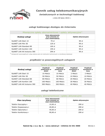 Cennik usług telekomunikacyjnych świadczonych w technologii kablowej z dnia 20 lipiec 2015 r. usługi kablowego dostępu do Internetu Miesięczne opłaty abonamentowe i opłaty aktywacyjne1) Cena abonamentu przy umowie na czas nieokreślony Opłata aktywacyjna RybNET LAN Start 10 79 zł 99 zł RybNET LAN Mini 50 129 zł 99 zł RybNET LAN Standard 80 169 zł 99 zł RybNET LAN Komfort 100 199 zł 99 zł RybNET LAN All Inclusive 300 299 zł 99 zł Rodzaj usługi 1) dostępność poszczególnych usług zależna jest od możliwości technicznych w określonej lokalizacji prędkości w poszczególnych usługach Tabela prędkości usług Prędkość pobierania w dzień Prędkość pobierania w nocy Prędkość wysyłania w dzień Prędkość wysyłania w nocy RybNET LAN Start 10 10 Mbit/s 10 Mbit/s 2 Mbit/s 2 Mbit/s RybNET LAN Mini 50 50 Mbit/s 50 Mbit/s 10 Mbit/s 10 Mbit/s RybNET LAN Standard 80 80 Mbit/s 80 Mbit/s 20 Mbit/s 20 Mbit/s RybNET LAN Komfort 100 100 Mbit/s 100 Mbit/s 30 Mbit/s 30 Mbit/s RybNET LAN All Inclusive 300 300 Mbit/s 300 Mbit/s 40 Mbit/s 40 Mbit/s Rodzaj usługi usługi telefoniczne Miesięczne opłaty abonamentowe i opłaty aktywacyjne Cena abonamentu przy umowie na czas nieokreślony Opłata aktywacyjna Telefon Oszczędny+ 19,90 zł 299 zł Telefon Dopasowany+ 29,90 zł 299 zł Telefon Optymalny+ 49,90 zł 299 zł Telefon Komfortowy+ 99,90 zł 299 zł Plan taryfowy Rybnet Sp. z o.o. Sp. k. - www.rybnet.pl – infolinia 32 441 4000 Strona 1 pozostałe opłaty związane z usługami RybNET Usługi dodatkowe Rodzaj usługi Publiczny adres IP (opłata miesięczna) Cena bez opłat Dzierżawa dodatkowej bramki VoIP obsługującej 2 numery (opłata miesięczna) 15 zł Wizyta serwisowa - na życzenie klienta, konfiguracja routera/komputera 50 zł Wizyta serwisowa - nieuzasadnione wezwanie serwisu/wymiana uszkodzonego okablowania 50 zł Opłaty dodatkowe Rodzaj opłaty Cena Przeniesienie usługi w inną lokalizację 50 zł Zawieszenie usługi (opłata jednorazowa) – możliwe zawieszenie do 6-ciu miesięcy 99 zł Wymiana (w trakcie trwania Umowy) Urządzenia Abonenckiego z usterką bez opłat Urządzenia i usługi Rodzaj urządzenia lub usługi Cena Karta sieciowa LAN 20 zł Karta sieciowa bezprzewodowa N 300 Mbps 2.4 GHz USB 60 zł Karta sieciowa bezprzewodowa AC 1200 Mbps 2.4 GHz/5 GHz USB Switch 8-portowy 130 zł 70 zł Router bezprzewodowy 150Mbps (z konfiguracją) 100 zł Router bezprzewodowy N 300Mbps 2.4 GHz (z konfiguracją) 150 zł Router bezprzewodowy AC 1200Mbps 2.4 GHz/5 GHz (z konfiguracją) 300 zł Bramka VoIP dla dodatkowych usług telefonicznych (z konfiguracją) 250 zł Telefon ze wzmocnieniem dźwięku dla niedosłyszących Plantronics EXL30 Clarity 450 zł Wzmacniacz do słuchawki telefonu stacjonarnego Plantronics CLARITY ECE125 130 zł Wszystkie powyższe ceny są cenami brutto i zawierają podatek VAT Rybnet Sp. z o.o. Sp. k. - www.rybnet.pl – infolinia 32 441 4000 Strona 2