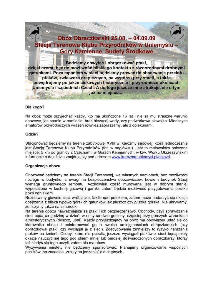 Obóz Obrączkarski 25.08. – 04.09.09 Stacja Terenowa Klubu Przyrodników w Uniemyślu – Góry Kamienne, Sudety Środkowe Będziemy chwytać i obrączkować ptaki, dzięki czemu będzie możliwość bliskiego kontaktu z różnorodnymi drobnymi gatunkami. Poza łapaniem w sieci będziemy prowadzić obserwacje przelotu ptaków, zwłaszcza drapieżnych, na wzgórzu przy stacji, a także powędrujemy po jakże ciekawych historycznie i przyrodniczo okolicach Uniemyśla i sąsiednich Czech. A do tego jeszcze inne atrakcje, ale o tym już na miejscu.... Dla kogo? Na obóz może przyjechać każdy, kto ma ukończone 16 lat i nie są mu straszne warunki obozowe, jak spanie w namiocie, brak bieżącej wody, czy podwórkowa sławojka. Młodszych amatorów przyrodniczych wrażeń również zapraszamy, ale z opiekunami. Gdzie? Stacjonować będziemy na terenie zabytkowej XVIII w. karczmy sądowej, która jednocześnie jest Stacją Terenową Klubu Przyrodników (fot. w nagłówku). Jest to malowniczo położone miejsce, 5 km od granicy z Czechami, w Górach Kamiennych, w tzw. Worku Okrzeszyńskim Informacje o dojeździe znajdują się pod adresem www.karczma-uniemysl.pl/dojazd. Organizacja obozu Obozować będziemy na terenie Stacji Terenowej, we własnych namiotach, bez możliwości noclegu w budynku, z uwagi na bezpieczeństwo obozowiczów, bowiem budynek Stacji wymaga gruntownego remontu. Aczkolwiek część murowana jest w dobrym stanie, wyposażona w kuchnię gazową i garnki, zatem będzie możliwość przygotowania posiłku poza ogniskiem. Rozstawimy głównie sieci wróblacze, także nad potokiem, zatem może nadarzyć się okazja obejrzenia z bliska typowo górskich gatunków jak pluszcz czy pliszka górska. Nie ukrywamy, że liczymy także na zimorodki. Na terenie obozu najważniejsze są ptaki i ich bezpieczeństwo. Obchody, czyli sprawdzanie sieci będą co godzinę w dzień, w nocy co dwie godziny, częściej przy gorszych warunkach atmosferycznych (deszcz, upał). Każdy przyjeżdżający na obóz ma obowiązek udać się do kierownika obozu i poinformować go o swoich umiejętnościach obrączkarskich (czy obrączkował ptaki, czy wyciągał je z sieci). Zdecydowanie zmniejszy to ryzyko narażania ptaków na śmierć. Osoby, które nie potrafią jeszcze wyciągać ptaków z sieci będą miały okazję nauczyć się tego pod okiem mniej lub bardziej doświadczonych obrączkarzy, którzy też kiedyś się tego uczyli, zatem nie ma obaw. Wyżywienia niestety nie będziemy sponsorować. Planujemy organizowanie wspólnych posiłków, na zasadzie „zrzuty na jedzenie” dla chętnych. Dodatkowe atrakcje Poza obrączkowaniem ptaków planujemy również tzw. obserwacje przelotu ptaków z punktu. Dotyczy to przede wszystkim większych gatunków jak bociany, ptaki drapieżne, których nie będziemy łapać w sieci. Zatem mile widziana będzie znajomość rozpoznawania ptaków, a także własny sprzęt w postaci przewodnika do rozpoznawania ptaków, lornetki, czy lunety. Dla osób które nie czują się dobre w tym temacie, będzie to świetna okazja podwyższenia swoich umiejętności. Planujemy również „chwile wytchnienia” w postaci wycieczek po okolicy, w tym na Zbiornik Bukówka, gdzie podczas przelotu zdarzają się takie gatunki jak biegus morski, wydrzyk tęposterny, łabędź krzykliwy i wiele innych niespodzianek przyrodniczych. Co zabrać? Śpiwór, karimatę, namiot, sztućce, kubek, lornetkę, latarkę, ciuchy terenowe. Stresy i problemy należy zostawić w domu. Kontakt: Kamila Misztal Piotr Wasiak 504 033 370 692 606 767 [email protected] [email protected] Poza tym informacje o obozie dostępne są na stronie Stacji Terenowej w Uniemyślu www.karczma-uniemysl.pl, a także na stronie Klubu Przyrodników www.kp.org.pl A tak to wygląda z bliska: