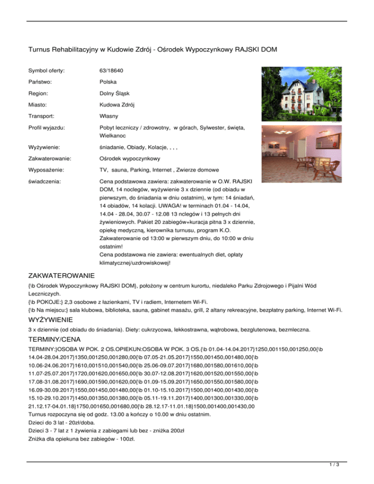 Turnus Rehabilitacyjny w Kudowie Zdrój - Ośrodek Wypoczynkowy RAJSKI DOM