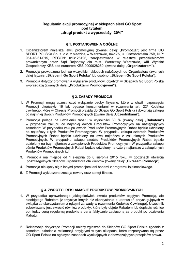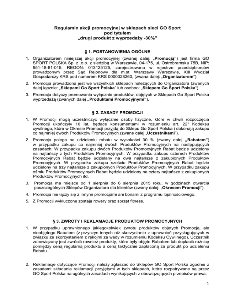 Regulamin akcji promocyjnej w sklepach sieci GO Sport pod tytułem „drugi produkt z wyprzedaży -30%” § 1. POSTANOWIENIA OGÓLNE 1. Organizatorem niniejszej akcji promocyjnej (zwanej dalej: „Promocją”) jest firma GO SPORT POLSKA Sp. z .o.o. z siedzibą w Warszawie, 04-175, ul. Ostrobramska 75B, NIP: 951-18-61-015, REGON: 013125125, zarejestrowana w rejestrze przedsiębiorców prowadzonym przez Sąd Rejonowy dla m.st. Warszawy Warszawie, XIII Wydział Gospodarczy KRS pod numerem KRS 0000028260, (zwana dalej: „Organizatorem“). 2. Promocja prowadzona jest we wszystkich sklepach należących do Organizatora (zwanych dalej łącznie: „Sklepami Go Sport Polska” lub osobno: „Sklepem Go Sport Polska“). 3. Promocja dotyczy promowania wyłącznie produktów, objętych w Sklepach Go Sport Polska wyprzedażą (zwanych dalej „Produktami Promocyjnymi”). § 2. ZASADY PROMOCJI 1. W Promocji mogą uczestniczyć wyłącznie osoby fizyczne, które w chwili rozpoczęcia Promocji ukończyły 16 lat, będące konsumentami w rozumieniu art. 22¹ Kodeksu cywilnego, które w Okresie Promocji przyjdą do Sklepu Go Sport Polska i dokonają zakupu co najmniej dwóch Produktów Promocyjnych (zwane dalej „Uczestnikami”). 2. Promocja polega na udzieleniu rabatu w wysokości 30 % (zwany dalej „Rabatem”) w przypadku zakupu co najmniej dwóch Produktów Promocyjnych na następujących zasadach: W przypadku zakupu dwóch Produktów Promocyjnych Rabat będzie udzielony na najtańszy z tych Produktów Promocyjnych. W przypadku zakupu czterech Produktów Promocyjnych Rabat będzie udzielany na dwa najtańsze z zakupionych Produktów Promocyjnych. W przypadku zakupu sześciu Produktów Promocyjnych Rabat będzie udzielony na trzy najtańsze z zakupionych Produktów Promocyjnych. W przypadku zakupu ośmiu Produktów Promocyjnych Rabat będzie udzielony na cztery najtańsze z zakupionych Produktów Promocyjnych itd. 3. Promocja ma miejsce od 1 sierpnia do 6 sierpnia 2015 roku, w godzinach otwarcia poszczególnych Sklepów Organizatora dla klientów (zwany dalej: „Okresem Promocji“). 4. Promocja nie łączy się z innymi promocjami ani bonami z programu lojalnościowego. 5. Z Promocji wykluczone zostają rowery oraz sprzęt fitness. § 3. ZWROTY I REKLAMACJE PRODUKTÓW PROMOCYJNYCH 1. W przypadku uprawnionego jakiegokolwiek zwrotu produktów objętych Promocją, ale nieobjętego Rabatem (z przyczyn innych niż skorzystanie z uprawnień przysługujących w związku ze skorzystaniem z rękojmi za wady w rozumieniu Kodeksu Cywilnego), Uczestnik zobowiązany jest zwrócić również produkty, które były objęte Rabatem lub dopłacić różnicę pomiędzy ceną regularną produktu a ceną faktycznie zapłaconą za produkt po udzieleniu Rabatu. 2. Reklamacje dotyczące Promocji należy zgłaszać do Sklepów GO Sport Polska zgodnie z zasadami składania reklamacji przyjętymi w tych sklepach, które rozpatrywane są przez GO Sport Polska na ogólnych zasadach wynikających z obowiązujących przepisów prawa. 1 3. Dane osobowe Uczestników Promocji składających reklamacje wskazane w §3 ust. 2 będą wykorzystywane zgodnie z ustawą o ochronie danych osobowych z dnia 29 sierpnia 1997 r. (Dz. U. z 2002 r. Nr 101, poz. 926 z późn. zm.), wyłącznie w celach związanych przedmiotowo z rozpoznaniem reklamacji. Administratorem danych osobowych Uczestników Promocji jest GO Sport Polska Sp. z o.o. z siedzibą w Warszawie. Każdy Uczestnik Promocji ma prawo wglądu do swoich danych, do ich poprawiania oraz usunięcia. Podanie danych osobowych jest dobrowolne jednak niezbędne dla rozpatrzenia reklamacji. § 4. POSTANOWIENIA KOŃCOWE 1. W sprawach nieuregulowanych niniejszym Regulaminem zastosowanie maja odpowiednie przepisy kodeksu cywilnego. Wszelkie spory wynikłe z tytułu wykonania zobowiązań związanych z niniejszą Promocją będą rozstrzygane przez sąd właściwy dla siedziby Organizatora. 2. Niniejszy Regulamin nie stanowi wzorca umowy w rozumieniu art. 384 §1 Kodeksu cywilnego. Określa on zasady prowadzenia Promocji. 3. Uczestnik nie może się powoływać na nieznajomość niniejszego Regulaminu, jeżeli bierze lub brał udział w Promocji. 4. Zasady Promocji określa wyłącznie niniejszy Regulamin. Wszelkie materiały reklamowe i promocyjne dotyczące Promocji mają charakter wyłącznie informacyjny. 5. Organizator zastrzega sobie prawo zmiany Regulaminu lub warunków Promocji, jeżeli jest to uzasadnione celem Promocji. Organizator zastrzega sobie również prawo przerwania Promocji w razie zaistnienia ważnych przyczyn po stronie Organizatora. Zmiany w Regulaminie nie mogą naruszać praw nabytych przez Uczestników Promocji przed dokonaniem zmiany. 6. Niniejszy Regulamin dostępny jest dla Uczestników w Sklepach GO Sport Polska oraz w siedzibie Organizatora. 7. W wypadku jakichkolwiek wątpliwości związanych ze stosowaniem Regulaminu Organizator zastrzega sobie prawo do ostatecznej interpretacji jego postanowień. W przypadku wątpliwości, co do stosowania regulaminu Uczestnik ma w każdym czasie prawo zwrócić się do Organizatora o dokonanie właściwej wykładni jego postanowień. 2