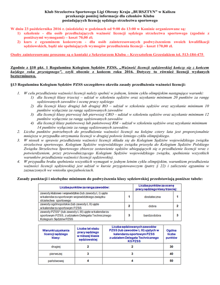 Klub Strzelectwa Sportowego Ligi Obrony Kraju „BURSZTYN” w Kaliszu przekazuje poniżej informacje dla członków Klubu posiadających licencję sędziego strzelectwa sportowego W dniu 23 października 2016 r. (niedziela) w godzinach od 9:00 do 13:00 w Koninie organizowane są: 1) szkolenie - dla osób przedłużających ważność licencji sędziego strzelectwa sportowego (zgodnie z poniższymi wymogami) – koszt 70,00 zł; 2) kurs z egzaminem końcowym - dla osób zainteresowanych podwyższeniem swoich kwalifikacji sędziowskich, bądź nie spełniających wymogów przedłużenia licencji – koszt 170,00 zł. Osoby zainteresowane proszone są o kontakt z Sekretarzem Klubu – Krzysztofem Grzesiakiem tel. 513-184-475 Zgodnie z §10 pkt. 1 Regulaminu Kolegium Sędziów PZSS, „Ważność licencji sędziowskiej kończy się z końcem każdego roku przestępnego”, czyli obecnie z końcem roku 2016. Dotyczy to również licencji wydanych bezterminowo. §13 Regulaminu Kolegium Sędziów PZSS szczegółowo określa zasady przedłużenia ważności licencji: 1. W celu przedłużenia ważności licencji należy spełnić w jednym, letnim cyklu olimpijskim następujące warunki: 1) dla licencji klasy trzeciej – udział w szkoleniu sędziów oraz uzyskanie minimum 20 punktów za rangę sędziowanych zawodów i ocenę pracy sędziego 2) dla licencji klasy drugiej lub drugiej RO – udział w szkoleniu sędziów oraz uzyskanie minimum 10 punktów wyłącznie za rangę sędziowanych zawodów 3) dla licencji klasy pierwszej lub pierwszej CRO – udział w szkoleniu sędziów oraz uzyskanie minimum 12 punktów wyłącznie za rangę sędziowanych zawodów 4) dla licencji klasy państwowej lub państwowej RM – udział w szkoleniu sędziów oraz uzyskanie minimum 14 punktów wyłącznie za rangę sędziowanych zawodów. 2. Liczba punktów potrzebnych do przedłużenia ważności licencji na kolejne cztery lata jest proporcjonalnie mniejsza w przypadku otrzymania licencji w drugiej połowie letniego cyklu olimpijskiego. 3. W niosek w sprawie przedłużenia ważności licencji składa się do Kolegium Sędziów wojewódzkiego związku strzelectwa sportowego. Kolegium Sędziów wojewódzkiego związku przesyła do Kolegium Sędziów Polskiego Związku Strzelectwa Sportowego zbiorcze zestawienie sędziów ubiegających się o przedłużenie licencji wraz z potwierdzeniem, przez przewodniczącego Kolegium Sędziów wojewódzkiego związku, spełnienia wszystkich warunków przedłużenia ważności licencji sędziowskiej. 4. W przypadku braku spełnienia wszystkich wymagań w jednym letnim cyklu olimpijskim, warunkiem przedłużenia ważności licencji sędziowskiej jest udział w kursie przygotowawczym (patrz § 22) i zaliczenie egzaminu w zaznaczonych we wniosku specjalnościach. Zasady punktacji i niezbędne minimum do podwyższenia klasy sędziowskiej przedstawiają poniższe tabele: