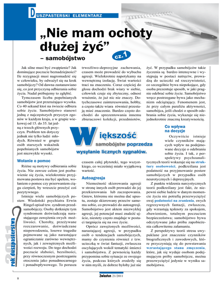 D uszpasterski elementarz „Nie mam ochoty dłużej żyć” 1 – samobójstwo Jak silne musi być zwątpienie? Jak trwożliwo-depresyjne zachowania, żyć. W przypadku samobójców takie dominujące poczucie beznadziejności? czasem może prowadzić do wybuchu życzenia są bardzo intensywne i wy Ile rezygnacji musi nagromadzić się agresji. Wielokrotnie napotykamy na stępują w postaci natręctw, prowaw człowieku, by odważył się na krok wewnętrzną izolację. Świat wartości dzą do ucieczki od rzeczywistości, samobójczy? Od dawna zastanawiano traci na znaczeniu. Coraz częściej do co szczególnie bywa niepokojące, gdy się, co jest przyczyną odbierania sobie głosu dochodzi brak wiary w siebie, osoba prezentuje sposób, w jaki prag życia. Nadal próbujemy to zgłębić. człowiek czuje się zbyteczny, odnosi nie odebrać sobie życie. Samobójstwo Tymczasem liczba popełnianych wrażenie, że już nic nie znaczy. Do wręcz postrzegane bywa jako mecha samobójstw jest przerażająco wysoka. tychczasowe zainteresowania, hobby, nizm odciążający. Fenomenem jest, Co 40 sekund ktoś na świecie odbiera a często także wiara również przesta że przy całym paraliżu aktywności, sobie życie. Samobójstwo stanowi ją mieć znaczenie. Bardzo często do samobójca, jeśli chodzi o sposób ode jedną z najczęstszych przyczyn zgo chodzi do sprezentowania innemu brania sobie życia, wykazuje się nie nów w każdym kraju, a w grupie wie zbieraczowi kolekcji, przedmiotów, jednokrotnie znaczną kreatywnością. kowej od 15. do 35. lat jed Co wpływa ną z trzech głównych przy na decyzje czyn. Problem ten dotyczy jednak nie tylko ludzi mło Oczywiście istnieje dych. Również w grupie wiele czynników mają samobójstw poprzedza osób starszych wskaźnik cych wpływ na podejmo popełnianych samobójstw wane decyzje o odebraniu wysyłanie licznych sygnałów. jest niezwykle wysoki. sobie życia. I tak, z per spektywy psychoanali Wołanie o pomoc czasem całej płytoteki, tego wszyst tycznych teorii wskazuje się na strukRóżne są motywy odbierania sobie kiego, co wcześniej miało wyjątkową tury osobowości, podkreślana jest życia. Nie zawsze celem jest pozba wartość. podatność na przyjmowanie postaw wienie się życia, wielokrotnie przyj samobójczych w przypadku osób mowana postawa ma być apelem, wo Autoagresja neurotycznych i depresyjnych. łaniem o pomoc czy przerwaniem cią Niemożność skierowania agresji Z punktu widzenia narcystycznych gu cierpień, by wreszcie przeżyć coś w stronę innych osób prowadzi do jej teorii podkreślany jest fakt, że nie pozytywnego. przekierowania lub zaczopowania. pewni siebie ludzie w danym momen Istnieje wiele samobójczych po Gniew, któremu nie można dać upus cie życia nie potrafią przezwyciężyć staw. Wiedeński psychiatra Erwin tu, zostaje skierowany przeciw same swej podatności na zranienia, swych Ringel opisał tzw. syndrom przed mu sobie, co prowadzi do autoagresji. regresywnych fantazji, zwłaszcza, samobójczy. Osoby dotknięte tym Samobójstwo jest aktem niezwykłej gdy wzrastają tęsknoty za spokojem, syndromem doświadczają nara agresji, jej potencjał musi znaleźć uj zbawieniem, totalnym poczuciem stającego zawężenia swych moż ście, niestety często znajduje w posta bezpieczeństwa; samobójstwo bywa liwości. Choroby, przeżywane ci targnięcia się na swe życie. odczytywane jako próba zapobieże rozczarowanie, doświadczane Oprócz zawężonych możliwości, nia całkowitemu załamaniu. niepowodzenia, losowe tragedie narastającej agresji, w przypadku Z perspektywy teorii stresu uwy pojmowane są jako narastające osób o tendencjach samobójczych, puklane jest znaczenie czynników ograniczanie zarówno wewnętrz mamy do czynienia również z tzw. biograficznych i zawodowych, któnych, jak i zewnętrznych możli ucieczką w świat fantazji, zwłaszcza re przyczyniają się do powstawania wości rozwoju. Do tego dochodzi oscylujących wokół tematyki śmierci wzrastającego stanu zmęczenia, poczucie słabości, bezsilności, i samobójstwa. Z pewnością każdy które, jak się wydaje osobom podej przy równoczesnym postrzeganiu przypomina sobie sytuacje ze swojego mującym próby samobójcze, można otoczenia jako ponadmocarnego życia, podczas których zrodziły się przezwyciężyć jedynie w wyniku sa i ponadwpływowego. To porusza w nim myśli, że dobrze byłoby już nie mobójstwa. W iększość 2011 rok duszpasterstwa cz . 8 21/2011 D USZPASTERSKI ELEMENTARZ „Nie mam ochoty dłużej żyć” 1 – samobójstwo Jak silne musi być zwątpienie? Jak trwożliwodepresyjne zachowania, żyć. W przypadku samobójców takie dominujące poczucie beznadziejności? czasem może prowadzić do wybuchu życzenia są bardzo intensywne i wy Ile rezygnacji musi nagromadzić się agresji. Wielokrotnie napotykamy na stępują w postaci natręctw, prowa w człowieku, by odważył się na krok wewnętrzną izolację. Świat wartości dzą do ucieczki od rzeczywistości, samobójczy? Od dawna zastanawiano traci na znaczeniu. Coraz częściej do co szczególnie bywa niepokojące, gdy się, co jest przyczyną odbierania sobie głosu dochodzi brak wiary w siebie, osoba prezentuje sposób, w jaki prag życia. Nadal próbujemy to zgłębić. człowiek czuje się zbyteczny, odnosi nie odebrać sobie życie. Samobójstwo Tymczasem liczba popełnianych wrażenie, że już nic nie znaczy. Do wręcz postrzegane bywa jako mecha samobójstw jest przerażająco wysoka. tychczasowe zainteresowania, hobby, nizm odciążający. Fenomenem jest, Co 40 sekund ktoś na świecie odbiera a często także wiara również przesta że przy całym paraliżu aktywności, sobie życie. Samobójstwo stanowi ją mieć znaczenie. Bardzo często do samobójca, jeśli chodzi o sposób ode jedną z najczęstszych przyczyn zgo chodzi do sprezentowania innemu brania sobie życia, wykazuje się nie nów w każdym kraju, a w grupie w