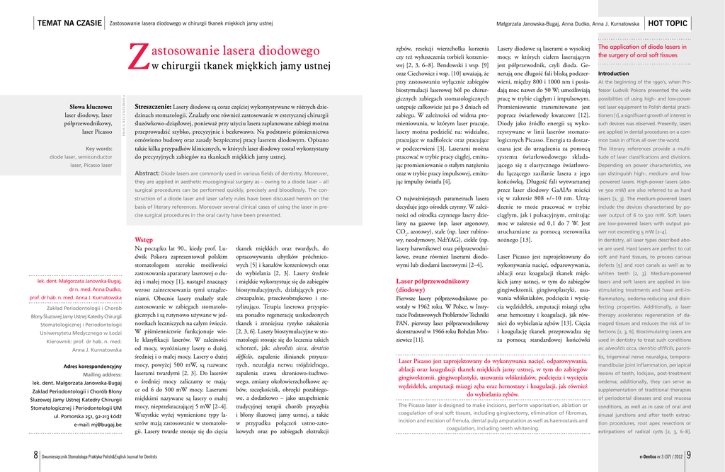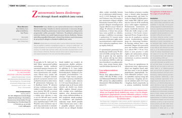 TEMAT NA CZASIE Zastosowanie lasera diodowego w chirurgii tkanek miękkich jamy ustnej Słowa kluczowe: laser diodowy, laser półprzewodnikowy, laser Picasso praca recenzowana Z Key words: diode laser, semiconductor astosowanie lasera diodowego w chirurgii tkanek miękkich jamy ustnej Streszczenie: Lasery diodowe są coraz częściej wykorzystywane w różnych dziedzinach stomatologii. Znalazły one również zastosowanie w estetycznej chirurgii śluzówkowo-dziąsłowej, ponieważ przy użyciu lasera zaplanowane zabiegi można przeprowadzić szybko, precyzyjnie i bezkrwawo. Na podstawie piśmiennictwa omówiono budowę oraz zasady bezpiecznej pracy laserem diodowym. Opisano także kilka przypadków klinicznych, w których laser diodowy został wykorzystany do precyzyjnych zabiegów na tkankach miękkich jamy ustnej. laser, Picasso laser Abstract: Diode lasers are commonly used in various fields of dentistry. Moreover, they are applied in aesthetic mucogingival surgery as – owing to a diode laser – all Małgorzata Janowska-Bugaj, Anna Dudko, Anna J. Kurnatowska zębów, resekcji wierzchołka korzenia czy też wyłuszczenia torbieli korzeniowej [2, 3, 6–8]. Bendowski i wsp. [9] oraz Ciechowicz i wsp. [10] uważają, że przy zastosowaniu wyłącznie zabiegów biostymulacji laserowej ból po chirurgicznych zabiegach stomatologicznych ustępuje całkowicie już po 3 dniach od zabiegu. W zależności od widma promieniowania, w którym laser pracuje, lasery można podzielić na: widzialne, pracujące w nadfiolecie oraz pracujące w podczerwieni [3]. Laserami można pracować w trybie pracy ciągłej, emitując promieniowanie o stałym natężeniu oraz w trybie pracy impulsowej, emitując impulsy światła [4]. surgical procedures can be performed quickly, precisely and bloodlessly. The construction of a diode laser and laser safety rules have been discussed herein on the basis of literary references. Moreover several clinical cases of using the laser in precise surgical procedures in the oral cavity have been presented. lek. dent. Małgorzata Janowska-Bugaj, dr n. med. Anna Dudko, prof. dr hab. n. med. Anna J. Kurnatowska Zakład Periodontologii i Chorób Błony Śluzowej Jamy Ustnej Katedry Chirurgii Stomatologicznej i Periodontologii Uniwersytetu Medycznego w Łodzi Kierownik: prof. dr hab. n. med. Anna J. Kurnatowska Adres korespondencyjny Mailing address: lek. dent. Małgorzata Janowska-Bugaj Zakład Periodontologii i Chorób Błony Śluzowej Jamy Ustnej Katedry Chirurgii Stomatologicznej i Periodontologii UM ul. Pomorska 251, 92-213 Łódź e-mail: [email protected] 8 Wstęp Na początku lat 90., kiedy prof. Ludwik Pokora zaprezentował polskim stomatologom szerokie możliwości zastosowania aparatury laserowej o dużej i małej mocy [1], nastąpił znaczący wzrost zainteresowania tymi urządzeniami. Obecnie lasery znalazły stałe zastosowanie w zabiegach stomatologicznych i są rutynowo używane w jednostkach leczniczych na całym świecie. W piśmiennictwie funkcjonuje wiele klasyfikacji laserów. W zależności od mocy, wyróżniamy lasery o dużej, średniej i o małej mocy. Lasery o dużej mocy, powyżej 500 mW, są nazwane laserami twardymi [2, 3]. Do laserów o średniej mocy zaliczamy te mające od 6 do 500 mW mocy. Laserami miękkimi nazywane są lasery o małej mocy, nieprzekraczającej 5 mW [2–4]. Wszystkie wyżej wymienione typy laserów mają zastosowanie w stomatologii. Lasery twarde stosuje się do cięcia Dwumiesięcznik Stomatologa Praktyka Polish&English Journal for Dentists tkanek miękkich oraz twardych, do opracowywania ubytków próchnicowych [5] i kanałów korzeniowych oraz do wybielania [2, 3]. Lasery średnie i miękkie wykorzystuje się do zabiegów biostymulacyjnych, działających przeciwzapalnie, przeciwobrzękowo i sterylizująco. Terapia laserowa przyspiesza ponadto regenerację uszkodzonych tkanek i zmniejsza ryzyko zakażenia [2, 3, 6]. Lasery biostymulacyjne w stomatologii stosuje się do leczenia takich schorzeń, jak: alveolitis sicca, dentitio difficlis, zapalenie ślinianek przyusznych, neuralgia nerwu trójdzielnego, zapalenia stawu skroniowo-żuchwowego, zmiany okołowierzchołkowe zębów, szczękościsk, obrzęki pozabiegowe, a dodatkowo – jako uzupełnienie tradycyjnej terapii chorób przyzębia i błony śluzowej jamy ustnej, a także w przypadku połączeń ustno-zatokowych oraz po zabiegach ekstrakcji O najważniejszych parametrach lasera decyduje jego ośrodek czynny. W zależności od ośrodka czynnego lasery dzielimy na gazowe (np. laser argonowy, CO2, azotowy), stałe (np. laser rubinowy, neodymowy, Nd:YAG), ciekłe (np. lasery barwnikowe) oraz półprzewodnikowe, zwane również laserami diodowymi lub diodami laserowymi [2–4]. Laser półprzewodnikowy (diodowy) Pierwsze lasery półprzewodnikowe powstały w 1962 roku. W Polsce, w Instytucie Podstawowych Problemów Techniki PAN, pierwszy laser półprzewodnikowy skonstruował w 1966 roku Bohdan Mroziewicz [11]. Lasery diodowe są laserami o wysokiej mocy, w których ciałem laserującym jest półprzewodnik, czyli dioda. Generują one długość fali bliską podczerwieni, między 800 i 1000 nm i posiadają moc nawet do 50 W; umożliwiają pracę w trybie ciągłym i impulsowym. Promieniowanie transmitowane jest poprzez światłowody kwarcowe [12]. Diody jako źródło energii są wykorzystywane w linii laserów stomatologicznych Picasso. Energia ta dostarczana jest do urządzenia za pomocą systemu światłowodowego składającego się z elastycznego światłowodu łączącego zasilanie lasera z jego końcówką. Długość fali wytwarzanej przez laser diodowy GaAIAs mieści się w zakresie 808 +/−10 nm. Urządzenie to może pracować w trybie ciągłym, jak i pulsacyjnym, emitując moc w zakresie od 0,1 do 7 W. Jest uruchamiane za pomocą sterownika nożnego [13]. HOT TOPIC The application of diode lasers in the surgery of oral soft tissues Introduction At the beginning