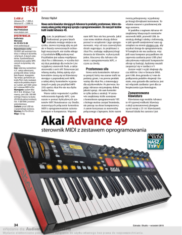 TEST 2.450 zł Tomasz Hajduk PRODUCENT Nowa seria klawiatur sterujących Advance to produkty przełomowe, które stanowią udaną próbę integracji sprzętu z oprogramowaniem. Do naszych testów trafił model Advance 49. (Advance 25 – 1.899 zł, Advance 61 – 2.890 zł) Akai Professional www.akaipro.com DYSTRYBUCJA Audiostacja Warszawa tel. 22-616-13-86 www.audiostacja.pl Najważniejsze cechy: 25/49/61 pół-ważonych klawiszy z reakcją na dynamikę i aftertouch, 8 dużych enkoderów, 8 podświetlanych wielokolorowo padów MPC czułych na dynamikę i siłę docisku. Inne: kolorowy wyświetlacz 4,3”, sekcja odtwarzania, przełączniki oktaw, funkcje Note Repeat, Arpeggiator, Tap-tempo, gumowane pokrętła Pitch i koło modulacji, wejścia dla pedałów ekspresji i sustain, port USB i gniazda 5-stykowe MIDI In/Out. Wymagania: system Mac OS X 10.8, Windows 7 lub nowszy, port USB, 200 MB wolnego miejsca na dysku (20 GB dla pełnej instalacji), min. 4 GB RAM, procesor wielordzeniowy. Zasilanie: przez USB lub z opcjonalnego zasilacza. Wymiary: 9×75×29 cm. Waga: 4,5 kg. O tym, że projektanci z Akai Professional, po paru latach szukania swojego miejsca na rynku, znowu trzymają rękę na pulsie w branży nowoczesnych technologii muzycznych, nie trzeba nikogo z Czytelników przekonywać. Przykładem jest udana współpraca Akai Pro z Abletonem, w wyniku której Akai produkuje dla twórców Live wyjątkowy sterownik Push, a także sterowniki z serii APC firmowane już własną marką. Dobrą opinią użytkowników cieszą się też klawiatury sterujące z poprzedniej serii MPK, a takiej oferty kontrolerów wyposażonych w pady (na przykład MPD 232) oprócz Akai Pro nie ma chyba żadna firma. Warto także wspomnieć o próbie wskrzeszenia legendy MPC, tym razem w postaci hybrydowych systemów MPC Renaissance czy Studio, stanowiących połączenie kontrolera MIDI z oprogramowaniem zainstalowanym w komputerze. Wspomi- nam MPC Ren nie bez powodu. Jakiś czas temu miałem okazję dobrze poznać to urządzenie i jego oprogramowanie, więc od razu zauważyłem detale sugerujące, że projektanci z Akai Pro, szukając najlepszej drogi dotarcia do klientów, wykorzystali jeden, kluczowy dla Advance element z oprogramowania MPC, o czym za chwilę. Przełomowa siła Nowa seria kontrolerów Advance to pomysł, który ma szanse trafić na podatny grunt, i na pewno produkt ważny dla Akai Pro, a interesujący dla użytkowników. Po pierwsze, kupując Advance otrzymujemy dobrej jakości sprzęt. Ale sam kontroler to tylko jedna z atrakcji. W zestawie znajdziemy ściśle zestrojone z kontrolerem oprogramowanie VIP, z którego można czerpać brzmienia, nie patrząc na ekran komputerowy. A zatem korzystasz ze sterownika połączonego z laptopem, które razem tworzą pełnoprawny, wypełniony po brzegi dźwiękami instrument. To właśnie stanowi o przełomowej sile tego zestawu. W pudełku z napisem Advance 49 znajdziemy klasycznych rozmiarów sterownik MIDI, przewód USB, instrukcję obsługi i ulotkę z informacją, w jaki sposób zarejestrować nasz egzemplarz na stronie akaipro.com, aby uzyskać dostęp do oprogramowania. W komplecie nie ma zasilacza, więc jeśli nasz komputer przypadkiem nie zapewnia zasilania przez USB (choć zdecydowana większość komputerów oferuje tę funkcję), będziemy musieli zaopatrzyć się w zasilacz 6 V. Zestaw wejść i wyjść obejmuje złącza MIDI In i Out w formacie DIN5, port USB, dwa gniazda 6,3 mm do podłączenia pedałów ekspresji i Sustain, oraz gniazdo dla zasilacza. Jest też włącznik zasilania i port dla zabezpieczenia typu Kensington. Zaawansowana klawiatura Klawiatura tego modelu Advance to 49 typowej wielkości klawiszy o akcji syntezatorowej (dostępne są też wersje z 25 i 61 klawiszami). Manuał działa bez zarzutu i jest Akai Advance 49 sterownik MIDI z zestawem oprogramowania 34 Estrada i Studio • wrzesień 2015 znakomicie wykończony. Dla osób, które nie są zawodowymi pianistami działanie mechanizmu określanego mianem klawiatury pół-ważonej może wydać się trochę zbyt sztywne. Po dłuższej grze dłonie mogą sygnalizować oznaki zmęczenia. Dla odmiany klawiszowcy obyci z klawiaturą fortepianową będą zadowoleni z tego, że klawisze stawiają lekki opór i mają głębokie wychylenie, co pozwala różnicować dynamikę gry. Klawiatura Advance reaguje na siłę docisku i ma funkcję aftertouch dla brzmień wykorzystujących ten rodzaj ekspresji. Podpowiem, że warto od razu zaktualizować firmware sterownika, gdyż po aktualizacji klawisze jeszcze lepiej reagują na urozmaiconą dynamikę gry w języku maszyn opisywaną jako velocity. Rzut oka na panel Sterownik po uruchomieniu prezentuje się kolorowo i efektownie. Uwagę przykuwa duży, wielokolorowy wyświetlacz z ulokowaną wokół sekcją nawigacji i odtwarzania. Na wyświetlaczu mamy podgląd wszystkich funkcji obsługiwanych w kolejnych trybach i oknach. Poszczególne pozycje w menu wybiera się i zatwierdza za pomocą pokrętła z funkcją przycisku oraz typowych dla urządzeń Akai Pro przełączników kierunkowych. Tradycyjnie do dyspozycji jest koło modulacji i kontroler Pitch, w tym przypadku efektownie podświetlone, oraz przełączniki oktaw dla klawiatury zakresie ±4 oktawy. Najważniejsze ustawienia dostępne są w trybie Global. Tutaj wybieramy kanał transmisji, wysokość oktawy dla klawiatury i transpozycję. W trybie Control przypisujemy parametry do poszczególnych kontrolerów. Tryby ustawień Browser i Multi dostępne są tylko przy włączonej aplikacji VIP. wyższy przenosi nas o odpowiedni zakres dźwięków w górę. Dla padów dostępna jest klasyczna funkcja Full Level, po włączeniu której naciśnięcie padu wyzwala dźwięk zawsze z najwyższym poziomem velocity. Jest też funkcja automatycznego powtórzenia Note Repeat, dla której podziały czasowe (w zakresie 1/4–1/32T) zmieniamy za pomocą 8 przycisków umieszczonych między padami 
