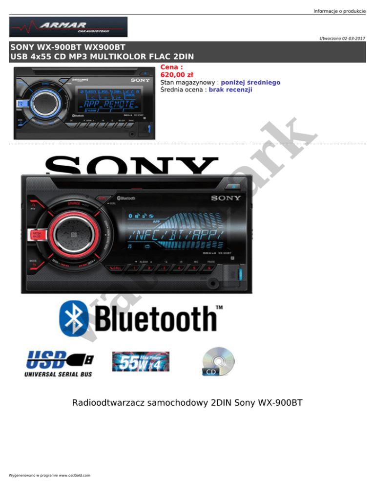 Informacje o produkcie Utworzono 02-03-2017 SONY WX-900BT WX900BT USB 4x55 CD MP3 MULTIKOLOR FLAC 2DIN Cena : 620,00 zł w at er m ar k Stan magazynowy : poniżej średniego Średnia ocena : brak recenzji Radioodtwarzacz samochodowy 2DIN Sony WX-900BT Wygenerowano w programie www.oscGold.com er m ar k Łatwo dostępna ścieżka dźwiękowa na każdą podróż Dwudinowy amplituner łączy się ze smartfonem jednym dotknięciem Wystarczy kilka sekund, by stworzyć nastrój na każdą podróż dzięki amplitunerowi z funkcją współpracy ze smartfonem. Funkcja parowania Bluetooth jednym dotknięciem umożliwia natychmiastowe odtwarzanie wybranych utworów, a technologia cyfrowego przetwarzania sygnału tworzy efekt dźwięku przestrzennego. Łącz się i steruj, tak jak chcesz Słuchanie muzyki w podróży stało się prostsze niż kiedykolwiek. Dostęp do kolekcji utworów dzięki połączeniu bezprzewodowemu lub przewodowemu i sterowanie odtwarzaniem za pomocą przycisków lub poleceń głosowych. Podróżuj z Siri at Chcesz sterować telefonem lub tabletem z systemem iOS, a jednocześnie zachować czujność za kierownicą? Technologia Siri Eyes Free obsługuje odtwarzanie muzyki, ułatwia nawigację, odczytuje wiadomości i nie tylko. Wszystko pod kontrolą dzięki aplikacji SongPal w Pomocna, sterowana głosem aplikacja SongPal zarządza odtwarzaniem nagrań, a nawet odczytuje wiadomości e-mail i ułatwia nawigację. Łatwość podłączenia i odtwarzania Podłącz telefon, urządzenie pamięci lub odtwarzacz MP3 do gniazda USB, aby mieć dostęp do wszystkich utworów nawet bez łączności Bluetooth. Możesz wykorzystać analogowy odtwarzacz, podłączając gniazdo słuchawkowe do wejścia AUX amplitunera Poczuj muzykę Wydobądź szczegóły i dynamikę w każdym utworze dzięki potężnemu dźwiękowi, jaki dostarcza wzmacniacz 4 × 55 W. Konfigurowalne ustawienia odtwarzania i zaawansowana technologia dźwięku umożliwiają dostosowanie dźwięku do własnych upodobań. Kontrastowy ekran LCD ułatwia odczytywanie Informacje o produkcie Ekran LCD o pięciokrotnie większym kontraście niż ekrany tradycyjne ze zoptymalizowanym kątem widzenia ułatwia kierowcom odczytywanie. Twój samochód, więc Ty wybierasz kolor er m ar k Wybierz spośród 35 000 różnych kolorów, by dopasować podświetlenie do wnętrza samochodu. Dwustrefowe podświetlenie umożliwia wybór osobnych ustawień dla obszaru klawiszy i ekranu. Światła pulsujące w rytm muzyki Zsynchronizowanie podświetlenie na ekranie miga w rytm muzyki lub zmienia się wraz z poziomem dźwięku utworu. radioodtwarzacz samochodowy 2DIN Sony WX-900BT Odtwarzanie Typ odtwarzacza CD z USB Maksymalna moc wyjściowa 4 x 55 W Standardy odtwarzania dźwięku CD Audio, CD-R, CD-RW, AAC, MP3, WMA, FLAC Standardy odtwarzania obrazu nie dotyczy Radio zakres - AM LW, AM MW, FM (UKF) , liczba stacji - 30 Radio z systemem RDS tak Wzmacniacz w technologii MOS-FET nie at Informacje dodatkowe Podświetlenie wyświetlacza kolorowy Podświetlanie przycisków różne kolory (zmienne) Kolor panelu czarny Bluetooth tak Wbudowany korektor dźwięku tak Regulacja tonów wysokich / niskich tak Filtr loudness (kontur) nie w Funkcje dodatkowe inteligentne korygowanie parametrów czasowych , możliwość podłączenia odtwarzacza iPod, możliwość podłączenia telefonu iPhone, możliwość współpracy z fabrycznie wbudowanym sterowaniem (wymagany dedykowany do modelu samochodu interfejs), obsługa folderów i plików, regulowany filtr dolnoprzepustowy , regulowany filtr górnoprzepustowy, wyciszanie dźwięku dla telefonu podczas rozmowy telefonicznej, Siri Eyes Free, NFC Rodzaj zabezpieczenia przed kradzieżą brak danych Wejścia / wyjścia Złącza USB 1 x 2.0 Wejście AUX IN dla zewnętrznego źródła dźwięku tak Wyjście do subwoofera tak Wyjście do przedwzmacniacza (pre-out) 3 Wyposażenie Pilot w zestawie nie Wyposażenie instrukcja obsługi w języku polskim, karta gwarancyjna, mikrofon Gwarancja 24 miesiące Wygenerowano w programie www.oscGold.com er m ar k at w