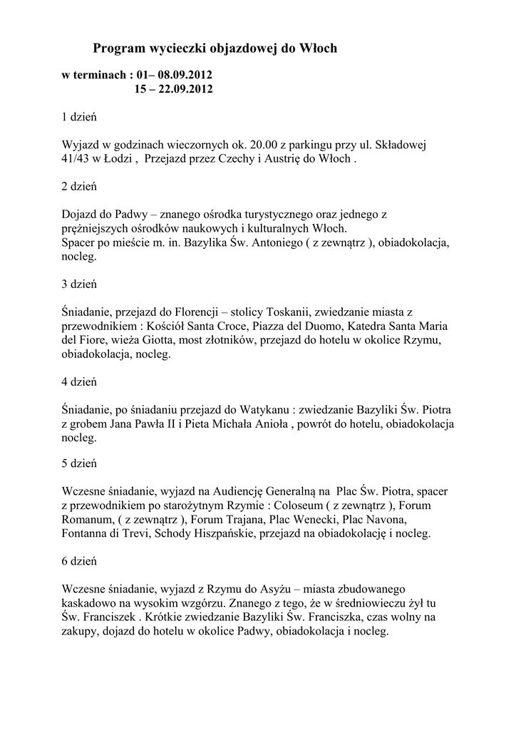 Program wycieczki objazdowej do Włoch w terminach : 01– 08.09.2012 15 – 22.09.2012 1 dzień Wyjazd w godzinach wieczornych ok. 20.00 z parkingu przy ul. Składowej 41/43 w Łodzi , Przejazd przez Czechy i Austrię do Włoch . 2 dzień Dojazd do Padwy – znanego ośrodka turystycznego oraz jednego z prężniejszych ośrodków naukowych i kulturalnych Włoch. Spacer po mieście m. in. Bazylika Św. Antoniego ( z zewnątrz ), obiadokolacja, nocleg. 3 dzień Śniadanie, przejazd do Florencji – stolicy Toskanii, zwiedzanie miasta z przewodnikiem : Kościół Santa Croce, Piazza del Duomo, Katedra Santa Maria del Fiore, wieża Giotta, most złotników, przejazd do hotelu w okolice Rzymu, obiadokolacja, nocleg. 4 dzień Śniadanie, po śniadaniu przejazd do Watykanu : zwiedzanie Bazyliki Św. Piotra z grobem Jana Pawła II i Pieta Michała Anioła , powrót do hotelu, obiadokolacja nocleg. 5 dzień Wczesne śniadanie, wyjazd na Audiencję Generalną na Plac Św. Piotra, spacer z przewodnikiem po starożytnym Rzymie : Coloseum ( z zewnątrz ), Forum Romanum, ( z zewnątrz ), Forum Trajana, Plac Wenecki, Plac Navona, Fontanna di Trevi, Schody Hiszpańskie, przejazd na obiadokolację i nocleg. 6 dzień Wczesne śniadanie, wyjazd z Rzymu do Asyżu – miasta zbudowanego kaskadowo na wysokim wzgórzu. Znanego z tego, że w średniowieczu żył tu Św. Franciszek . Krótkie zwiedzanie Bazyliki Św. Franciszka, czas wolny na zakupy, dojazd do hotelu w okolice Padwy, obiadokolacja i nocleg. 7 dzień Po śniadaniu przejazd do Wenecji- zbudowanej na 117 małych wyspach i łączącej ze sobą 150 kanałów połączonych przez zaskakującą liczbę 409 mostów. Przepłynięcie tramwajem wodnym, zwiedzanie miasta : Plac Św. Marka, Pałac Dożów ( z zewnątrz), Most Westchnień, Wieża Zegarowa, spacer w kierunku Mostu Rialto, czas wolny, powrót do autokaru. Wyjazd w powrotną drogę. 8 dzień Przyjazd do Łodzi w godzinach rannych.