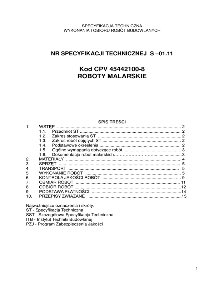 SPECYFIKACJA TECHNICZNA WYKONANIA I OBIORU ROBÓT BUDOWLANYCH NR SPECYFIKACJI TECHNICZNEJ S –01.11 Kod CPV 45442100-8 ROBOTY MALARSKIE 1. 2. 3. 4 5 6 7. 8 9 10. SPIS TREŚCI WSTĘP ..................................................................................................... 2 1.1. Przedmiot ST .................................................................................. 2 1.2. Zakres stosowania ST .................................................................... 2 1.3. Zakres robót objętych ST ................................................................ 2 1.4. Podstawowe określenia .................................................................. 2 1.5. Ogólne wymagania dotyczące robót ............................................... 3 1.6. Dokumentacja robót malarskich………………………... ................... 3 MATERIAŁY ............................................................................................. 4 SPRZĘT ................................................................................................... 5 TRANSPORT .......................................................................................... 5 WYKONANIE ROBÓT .............................................................................. 5 KONTROLA JAKOŚCI ROBÓT ........................................................... .... 9 OBMIAR ROBÓT ..................................................................................... 11 ODBIÓR ROBÓT .......................................................................................12 PODSTAWA PŁATNOŚCI .........................................................................14 PRZEPISY ZWIĄZANE ............................................................................15 Najważniejsze oznaczenia i skróty: ST - Specyfikacja Techniczna SST - Szczegółowa Specyfikacja Techniczna ITB - Instytut Techniki Budowlanej PZJ - Program Zabezpieczenia Jakości 1 1. WSTĘP 1.1. Przedmiot ST Przedmiotem niniejszej specyfikacji technicznej (ST) są wymagania dotyczące wykonania i odbioru robót malarskich realizowanych wewnątrz i na zewnątrz obiektów budowlanych nie narażonych na agresję chemiczną. Specyfikacja techniczna (ST) nie dotyczy wykonywania zabezpieczenia chemoodpornego i antykorozyjnego obiektów budowlanych. 1.2. Zakres stosowania ST Specyfikacja techniczna (ST) jest stosowana jako dokument przetargowy i kontraktowy przy zlecaniu i realizacji robót wymienionych w pkt. 1.1 Odstępstwa od wymagań podanych w niniejszej specyfikacji mogą mieć miejsce tylko w przypadkach prostych robot o niewielkim znaczeniu, dla których istnieje pewność, że podstawowe wymagania będą spełnione przy zastosowaniu metod wykonania wynikających z doświadczenia oraz uznanych reguł i zasad sztuki budowlanej. 1.3. Zakres robót objętych ST Roboty, których dotyczy Specyfikacja, obejmują wszystkie czynności mające na celu wykonanie malowania: wewnętrznego (wewnątrz pomieszczeń) zewnętrznego (wystawionego na bezpośrednie działanie czynników atmosferycznych) obiektów budowlanych nie narażonych na agresję chemiczną. Zakres opracowania obejmuje określenie wymagań odnośnie właściwości materiałów, wymagań i sposobów oceny podłoży, wymagań dotyczących wykonania powłok malarskich wewnętrznych i zewnętrznych powierzchni obiektów oraz ich odbiorów. Specyfikacja nie obejmuje wymagań dotyczących zabezpieczenia chemoodpornego i antykorozyjnego obiektów budowlanych oraz powłok malarskich wykonywanych według metod opatentowanych lub zaprojektowanych indywidualnie dla konkretnego obiektu 1.4. Określenia podstawowe Określenia podane w niniejszej Specyfikacji są zgodne z odpowiednimi normami oraz określeniami podanymi w ST „Wymagania ogólne" Kod CPV 45000000-7, pkt l .4. Dodatkowo w Specyfikacji używane są następujące terminy: Podłoże malarskie - surowa, zagruntowana lub wygładzona (np. szpachlówką) powierzchnia (np muru, tynku, betonu, drewna, płyt drewnopodobnych, itp.), na której będzie wykonywana powłoka malarska. Powłoka malarska - stwardniała warstwa farby, lakieru lub emalii nałożona i rozprowadzona na podłożu, decydująca o właściwościach użytkowych i walorach estetycznych pomalowanej powierzchni. Farba - płynna lub półpłynna zawiesina bądź mieszanina bardzo rozdrobnionych ciał starych (np. pigmentu - barwnika i różnych wypełniaczy) w roztworze spoiwa. Lakier - niepigmentowany roztwór koloidalny (np. żywic, olejów, poliestrów), który tworzy powłokę transparentną po pokryciu nim powierzchni i wyschnięciu. Emalia - lakier barwiony pigmentami, zastygający w szklistą powłokę. Pigment - naturalna lub sztuczna substancja barwna bądź barwiąca, która nadaje kolor farbom lub emaliom. Farba dyspersyjna - zawiesina pigmentów i wypełniaczy w dyspersji wodnej polimeru z dodatkiem środków pomocniczych. 2 Farba na rozpuszczalnikowych spoiwach żywicznych - zawiesina pigmentów i obciążników w spoiwie żywicznym, rozcieńczanym rozpuszczalnikami organicznymi (np. benzyną łąkową, terpentyną itp.). Farba i emalie na spoiwach żywicznych rozcieńczalne wodą - zawiesina pigmentów i obciążników w spoiwie żywicznym, rozcieńczalne wodą. Farba na spoiwach mineralnych - mieszanina spoiwa mineralnego (np. wapna, cementu, szkła wodnego itp.), pigmentów, wypełniaczy oraz środków pomocniczych i modyfikujących, przygotowana w postaci suchej, przeznaczonej do zarobienia wodą lub w postaci ciekłej, gotowej do stosowania mieszanki. Farba na spoiwach mineralno-organicznych - mieszanina spoiw mineralnych i organicznych (np. dyspersji wodnej żywic, kleju kazeinowego, kleju kostnego itp.), pigmentów, wypełniaczy oraz środków pomocniczych; produkowana w postaci suchych mieszanek lub past do zarobienia wodą. 1.5. Ogólne wymagania dotyczące robót Wykonawca robót jest odpowiedzialny za jakość ich wykonania oraz za zgodność z dokumentacją 