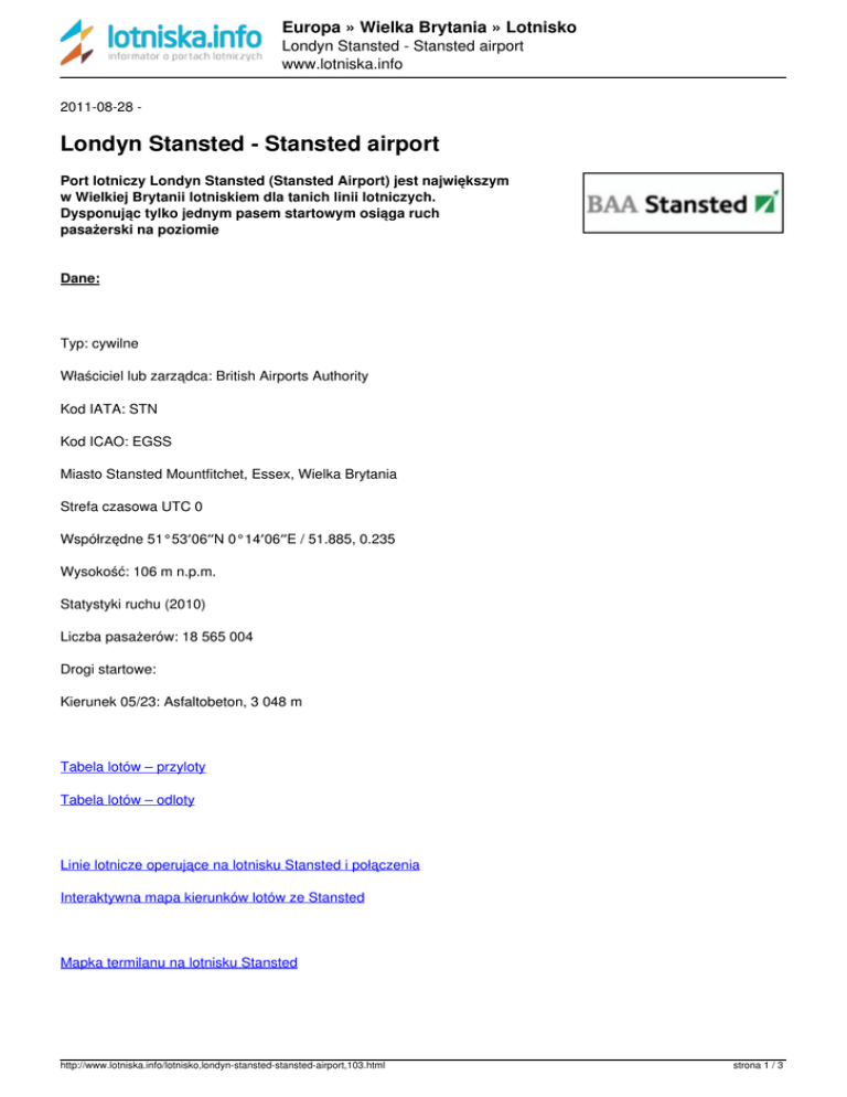 Europa » Wielka Brytania » Lotnisko Londyn Stansted - Stansted airport www.lotniska.info 2011-08-28 - Londyn Stansted - Stansted airport Port lotniczy Londyn Stansted (Stansted Airport) jest największym w Wielkiej Brytanii lotniskiem dla tanich linii lotniczych. Dysponując tylko jednym pasem startowym osiąga ruch pasażerski na poziomie Dane: Typ: cywilne Właściciel lub zarządca: British Airports Authority Kod IATA: STN Kod ICAO: EGSS Miasto Stansted Mountfitchet, Essex, Wielka Brytania Strefa czasowa UTC 0 Współrzędne 51°53′06″N 0°14′06″E / 51.885, 0.235 Wysokość: 106 m n.p.m. Statystyki ruchu (2010) Liczba pasażerów: 18 565 004 Drogi startowe: Kierunek 05/23: Asfaltobeton, 3 048 m Tabela lotów – przyloty Tabela lotów – odloty Linie lotnicze operujące na lotnisku Stansted i połączenia Interaktywna mapa kierunków lotów ze Stansted Mapka termilanu na lotnisku Stansted http://www.lotniska.info/lotnisko,londyn-stansted-stansted-airport,103.html strona 1 / 3 Europa » Wielka Brytania » Lotnisko Londyn Stansted - Stansted airport www.lotniska.info OPIS Port lotniczy znajduje się około 48 kilometrów od Londynu. Jest klasyfikowane jako czwarte lotnisko w Wielkiej Brytanii pod wzgldęm ruchu pasażerów i trzecim w obszarze Londynu po lotniskach Heathrow i Gatwick. W 2003 roku lotnisko osiągnęło ruch na poziomie 23 milionów pasażerów. Wiele spośród takich linii lotniczych posiada swoje bazy na lotnisku w Stansted. Najwięcej kierunków oferuje linia lotnicza Ryanair. Ciekawostką może być to iż Stansted ma najwięcej lotów dziennie do kierunków europejskich niż jakiekolwiek inne lotnisko na świecie. Mapka terminalu Londyn Stansted (zdjęcie) HISTORIA Port lotniczy Stansted został zbudowany w 1942 roku przez wojsko Stanów Zjednoczonych jako baza militarna. Po wojnie funkcjonowanie bazy nie miało już większego sensu dlatego lotnisko zostaje przekazane ministerstwu lotnictwa w 1947 roku. W 1966 roku port lotniczy zostaje przekazany British Airports Authority. Początkowo port lotniczy był wykorzystywany do obsługi lotów charterowych które lądowały w tym okresie ekonomiczniej na lotnisku Stansted niż miałoby to miejsce na lotniskach w Heathrow i Gatwick. W momencie gdy lotnisko zostało przejęte przez British Airports Authority rząd Brytyjski przedstawia wizję aby lotnisko Stansted było trzecim co do wielkości lotniskiem w obrębie Londynu i aby służył jako lotnisko odciążające lotniska Heathrow i Gatwick. W 1969 roku powstaje pierwszy terminal a rok później dochodzi do jego dalszej rozbudowy ze względu na dynamiczny wzrost liczby pasażerów. W 1984 roku rząd brytyjski przedstawia plan rozbudowy lotniska który miałby przyjmować ruch pasażerki na poziomie 15 milionów osób rocznie. W 1986 roku rozpoczynają się prace nad nowym terminalem zaprojektowanym przez światowej klasy architekta Normana Fostera. Prace nad terminalem zakończyły się w 1991 roku. http://www.lotniska.info/lotnisko,londyn-stansted-stansted-airport,103.html strona 2 / 3 Europa » Wielka Brytania » Lotnisko Londyn Stansted - Stansted airport www.lotniska.info DOJAZD Auto Stansted połączony jest z Londynem i Cambridge autostradą M11. Mapka dojazdu na lotnisko Stansted Stansted Airport Train - Kolejka na lotnisku w Londynie Stansted (video) Pociąg Stansted posiada stację kolejową która znajduje się pod terminalem gdzie co 15 minut kursuje pociąg łączący lotnisko Stansted z Liverpool Street w Londynie. Usługa realizowana jest przez Stansted Express. Oprócz kierunku do Londynu istnieją również połączenia do Cambridge i Midlands z rzadszą częstotliwością. Co ciekawe prawdziwą zmorą połączenia kolejowego jest koszt biletu na pociąg który często przekracza cenę biletu lotniczego. Aktualnie cena biletu na pociąg w obie strony wynosi prawe 40 EUR. Podróż do miasta trwa około 45 minut. Autobus Podróż autobusem do Londynu jest prawie o połowę tańsza lecz czas przejazdu wynosi około 120 minut. Autobusy z lotniska jadą m.in do Stratford, Victoria Coach Station, Liverpool Street Station i Golders Green. Z lotniska można też dojechać do Oksford dzięki połączeniu realizowanym przez firmę National Express (czas podróży wynosi 3 godziny). http://www.lotniska.info/lotnisko,londyn-stansted-stansted-airport,103.html http://www.lotniska.info/lotnisko,londyn-stansted-stansted-airport,103.html Powered by TCPDF (www.tcpdf.org) strona 3 / 3