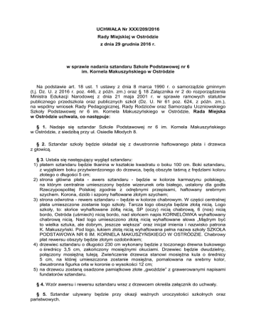 UCHWAŁA Nr XXX/209/2016 Rady Miejskiej w Ostródzie z dnia 29 grudnia 2016 r. w sprawie nadania sztandaru Szkole Podstawowej nr 6 im. Kornela Makuszyńskiego w Ostródzie Na podstawie art. 18 ust. 1 ustawy z dnia 8 marca 1990 r. o samorządzie gminnym (t.j. Dz. U. z 2016 r. poz. 446, z późn. zm.) oraz § 18 Załącznika nr 2 do rozporządzenia Ministra Edukacji Narodowej z dnia 21 maja 2001 r. w sprawie ramowych statutów publicznego przedszkola oraz publicznych szkół (Dz. U. Nr 61 poz. 624, z późn. zm.), na wspólny wniosek Rady Pedagogicznej, Rady Rodziców oraz Samorządu Uczniowskiego Szkoły Podstawowej nr 6 im. Kornela Makuszyńskiego w Ostródzie, Rada Miejska w Ostródzie uchwala, co następuje: § 1. Nadaje się sztandar Szkole Podstawowej nr 6 im. Kornela Makuszyńskiego w Ostródzie, z siedzibą przy ul. Osiedle Młodych 8. § 2. Sztandar szkoły będzie składał się z dwustronnie haftowanego płata i drzewca z głowicą. § 3. Ustala się następujący wygląd sztandaru: 1) płatem sztandaru będzie tkanina w kształcie kwadratu o boku 100 cm. Boki sztandaru, z wyjątkiem boku przytwierdzonego do drzewca, będą obszyte taśmą z frędzlami koloru złotego o długości 5 cm; 2) strona główna płata - awers sztandaru - będzie w kolorze karmazynu polskiego, na którym centralnie umieszczony będzie wizerunek orła białego, ustalony dla godła Rzeczypospolitej Polskiej zgodnie z odrębnymi przepisami, haftowany srebrnym szychem. Korona, dziób i szpony haftowane złotym szychem; 3) strona odwrotna - rewers sztandaru – będzie w kolorze chabrowym. W części centralnej płata umieszczone zostanie logo szkoły. Tarcza logo obszyta będzie złotą nicią. Logo szkoły, to: słońce wyhaftowane żółtą nicią, SP (oczy) nicią chabrową, 6 (nos) nicią bordo, Ostróda (uśmiech) nicią bordo, nad słońcem napis KORNELÓWKA wyhaftowany chabrową nicią. Nad logo umieszczono złotą nicią wyhaftowane słowa „Mądrym być to wielka sztuka, ale dobrym, jeszcze większa” oraz inicjał imienia i nazwisko patrona K. Makuszyński. Pod logo, łukiem złotą nicią wyhaftowana pełna nazwa szkoły SZKOŁA PODSTAWOWA NR 6 IM. KORNELA MAKUSZYŃSKIEGO W OSTRÓDZIE. Chabrowy płat rewersu obszyty będzie złotym ozdobnikiem; 4) drzewiec sztandaru o długości 230 cm wykonany będzie z toczonego drewna bukowego o średnicy 3,5 cm, zakończony mosiężnymi okuciami. Drzewiec będzie dwudzielny, połączony mosiężną tuleją. Zwieńczenie drzewca stanowi mosiężna kula o średnicy 5 cm, na której umieszczona zostanie mosiężna, pomalowana na srebrny kolor, dwustronna figurka orła w koronie o wysokości 12 cm; 5) na drzewcu zostaną osadzone pamiątkowe złote „gwoździe” z grawerowanymi napisami fundatorów sztandaru. § 4. Wzór awersu i rewersu sztandaru wraz z drzewcem określa załącznik do uchwały. § 5. Sztandar używany będzie przy okazji ważnych uroczystości szkolnych oraz państwowych. § 6. Sztandar przechowywany będzie w siedzibie Szkoły Podstawowej nr 6 im. Kornela Makuszyńskiego w Ostródzie, w siedzibie przy ul. Osiedle Młodych 8. W przypadku likwidacji szkoły, sztandar przejmuje Rada Miejska w Ostródzie. § 7. Wykonanie uchwały powierza się Burmistrzowi Miasta Ostróda. § 8. Uchwała wchodzi w życie z dniem podjęcia. Załącznik do Uchwały Nr XXX/209/2016 Rady Miejskiej w Ostródzie z dnia 29 grudnia 2016 r. Awers sztandaru Szkoły Podstawowej nr 6 im. Kornela Makuszyńskiego w Ostródzie Rewers sztandaru Szkoły Podstawowej nr 6 im. Kornela Makuszyńskiego w Ostródzie Uzasadnienie W dniu 31.10.2016 r. dyrektor Szkoły Podstawowej nr 6 im. Kornela Makuszyńskiego w Ostródzie, w imieniu społeczności szkolnej (Rady Pedagogicznej, Rady Rodziców i Samorządu Uczniowskiego) wystąpił z wnioskiem o nadanie szkole sztandaru. Od 14 lat placówka ma swojego patrona w osobie Kornela Makuszyńskiego i w oparciu o jego wzorzec osobowościowy, realizuje liczne projekty edukacyjno – wychowawcze wśród uczniów. Nadanie szkole sztandaru – symbolu patriotyzmu, Polski, Narodu, Małej Ojczyzny – podniesie dodatkowo rangę oraz prestiż szkoły podczas wydarzeń, jakie mają w niej miejsce oraz uroczystości, na które jest zapraszana. Sztandar będzie ponadto swoistym znakiem łączącym obecną społeczność szkolną z tymi, którzy ją opuścili i wraz z pieśnią szkoły, jej logo, tablicą pamiątkową, historią placówki oraz tradycją, przekazany zostanie następnym pokoleniom. Intencją wnioskodawców jest, aby sztandar został nadany w dniu 20 stycznia 2017 r., tj. w 15 rocznicę nadania Szkole Podstawowej nr 6 imienia Kornela Makuszyńskiego. Zgodnie z § 18 ramowego statutu publicznego szkoły podstawowej, stanowiącego Załącznik nr 2 do rozporządzenia Ministra Edukacji Narodowej z dnia 21 maja 2001 r. w sprawie ramowych statutów publicznego przedszkola oraz publicznych szkół (Dz. U. Nr 61 poz. 624, z późn. zm.) oraz art. 18 ust. 1 powołanej ustawy z dnia 8 marca 1990 r. o samorządzie gminnym, do właściwości rady gminy należą wszystkie sprawy pozostające w zakresie działania gminy, o ile ustawy nie stanowią inaczej. Mając powyższe na uwadze, podjęcie uchwały w niniejszej sprawie należy do kompetencji Rady Miejskiej w Ostródzie.