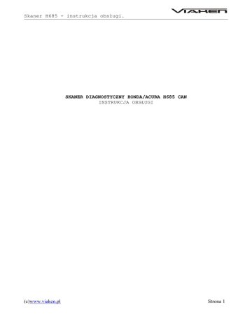 Skaner H685 - instrukcja obsługi. SKANER DIAGNOSTYCZNY HONDA/ACURA H685 CAN INSTRUKCJA OBSŁUGI (c)www.viaken.pl Strona 1 Skaner H685 - instrukcja obsługi. 1. BEZPIECZEŃSTWO PRACY Przed pierwszym uruchomieniem urządzenia należy uważnie przeczytać instrukcję obsługi. 1. Urządzenie przeznaczone jest do wykorzystania jedynie w pomieszczeniach zamkniętych 2. W przypadku nieprawidłowego działania lub stwierdzenia widocznego uszkodzenia nie wolno korzystać z urządzenia. W takim przypadku należy zwrócić się do firmy Viaken 3. Nie wolno zanurzać urządzenia ani przewodów w wodzie lub innych płynach. 4. W przypadku gdy przewody połączeniowe zostały uszkodzone, nie wolno korzystać z urządzenia. 5. Mając na uwadze Państwa bezpieczeństwo zalecamy używać do podłączenia jedynie kabli naszej produkcji (każdy producent może mieć inny standard wyprowadzeń) 6. Diagnostyka pojazdu może być prowadzona wyłącznie przez przeszkolony personel. 7. Urządzeni można podłączać do pojazdu wyłącznie poprzez dedykowane do tego celu gniazdo diagnostyczne. 8. Niedopuszczalne jest dokonywanie żadnych zmian w instalacji elektryczne pojazdu oraz w elektronice urządzenia. 9. Podłączanie urządzenia do złącza diagnostycznego pojazdu należy wykonywać tylko przy wyłączonym zapłonie. 10. Producent nie ponosi odpowiedzialności za skutki nieodpowiedniego korzystania lub nieprawidłowej obsługi. (c)www.viaken.pl Strona 2 Skaner H685 - instrukcja obsługi. 2. Opis skanera: 1. Wyświetlacz LCD, 128*64 pixeli 2. ENTER – klawisz wyboru 3. ESC- klawisz powrotu do poprzedniego okna 4. UP/DOWN – klawisz do poruszania się po ekranie góra dół, 5. LEFT/RIGHT klawisze wyboru i poruszania kursorem 6. Włącznik urządzenia 7. OBDII – kabel połączeniowy z samochodem oraz adaptery OBDII 16 pin/Honda 3pin (c)www.viaken.pl Strona 3 Skaner H685 - instrukcja obsługi. 2.1 Cechy produktu Dostępne funkcje: - Odczyt kodów błędów Kasowanie kodów błędów Odczyt parametrów data list Testy elementów wykonawczych ECM Reset Obsługiwane systemy: - PGM_FI AT ABS_VSA SRS EPS 3. Instrukcja obsługi 3.1 Uruchomienie urządzenia 1)Wyłącz stacyjkę 2)Znajdź gniazdo 16 pinowe OBDII: lub Honda 3 pin: (c)www.viaken.pl Strona 4 Skaner H685 - instrukcja obsługi. 3)Połącz skaner z pojazdem 4)Włącz stacyjkę 5)Uruchom urządzenie przyciskiem włącznika 5)Poczekaj chwilę pojawi się widok menu: 3.2 Funkcje dostępne w Menu głównym Diagnose- Diagnoza Contrast- Ustawienia kontrastu Lcd Test- Test wyświetlacza LCD Keypad Test- Test klawiszy About- Informacja o wersji urządzenia (c)www.viaken.pl Strona 5 Skaner H685 - instrukcja obsługi. 4. Diagnoza Wybierz w menu głównym pozycję diagnoza i naciśnij klawisz [enter] Następnie należy wybrać dokładnie system który chcemy diagnozować PGM_FI- Diagnoza układu napędowego AT- Automatyczna skrzynia biegów ABS SRS- Poduszka powietrzna EPS- Elektroniczny system wspomagania kierowncy Wybór należy zatwierdzić klawiszem [enter] Skaner rozpocznie komunikację... Przykładowo jeżeli wybierzemy AT przejdziemy do menu diagnozy automatycznej skrzyni biegów. (c)www.viaken.pl Strona 6 Skaner H685 - instrukcja obsługi. W przypadku problemów z komunikacją na wyświetlaczu pojawi się komunikat “Connect ECU failed!” 4.1 Odczyt kodów błędów Aby odczytać kody błędów należy wybrać pozycję TROUBLESHOOT I zatwierdzić klawiszem [enter] Skaner rozpocznie odczyt kodów błędów Jeżeli w wybranym module są zapisane kody błędów zostaną wyświetlone na wyświetlaczu, jeżeli będzie więcej niż jeden aby odczytać kolejny/poprzedni użyj klawiszy nawigacynych UP/DOWN (c)www.viaken.pl Strona 7 Skaner H685 - instrukcja obsługi. 4.2 Odczyt listy danych DATA LIST Aby rozpocząć podgląd listy danych DATA LIST należey w menu funkcji wybrać pozycję DATA LIST I zatwierdzić klawiszem [enter] Na wyświetlaczu pojawi się lista danych 4.3 Kasowanie kodów błędów W celu skasowania kodów błędów należy wybrać CLEAR I zatwierdzić klawiszem [enter] (c)www.viaken.pl Strona 8 Skaner H685 - instrukcja obsługi. Następnie należy ostatecznie potwierdzić klawiszem [enter] Po poprawnym wykasowaniu kodów błędów na wyświetlaczu pojawi się komunikat “Erase Fault code(s) SuccessFully!” 4.4 FUNCTION TEST W menu wybierz pozycję “FUNCTION TEST” I zatwierdź klawiszem [enter] (c)www.viaken.pl Strona 9 Skaner H685 - instrukcja obsługi. Teraz używająć kalwiszy nawigacyjnych UP/DOWN należy wybrać element, który chcemy testować, wybór zatwierdzamy klawiszem [enter] 4.5 ECM RESET Aby przeprowadzić reset komputera w menu wybierz pozycję “ECM RESET” I zatwierdź klawiszem [enter] Potwierdź kalwiszem [enter], reset zostanie rozpoczęty, wby anulować naciśnij klawisz [esc] (c)www.viaken.pl Strona 10 Skaner H685 - instrukcja obsługi. Po poprawnym zresetowaniu komputera na wyświetlaczu pojawi się komunikat “ECS RESETED SUCCESS-FULLY!” 5. Ustawienia kontrastu Aby zmienić kontrast wyświetlacza w menu głównym wybierz pozycje [contrast] I zatwierdź klawiszem [enter] Zmianę dokonujemy klawiszami UP/DOWN (c)www.viaken.pl Strona 11 Skaner H685 - instrukcja obsługi. 6. Test wyświetlacza Aby przeprowadzić test wyświetlacza w menu głównym wybierz pozycję [Lcd Test] I zatwierdź klawiszem [enter], skaner rozpocznie test. Po zakończeniu testu na wyświetlaczu pojawi się komunikat “ Test end !” (c)www.viaken.pl Strona 12 Skaner H685 - instrukcja obsługi. 7. Test klawiszy Aby przeprowadzić test klawiszy w menu głównym wybierz pozycję [Keypad Test] I zatwierdź [enter] Po naciśnięciu klawisza jego odpowiednik na ekranie powinien mrugnąć, aby zakończyć test naciścnij klawisz [esc], 8. About- informacje o urządzeniu Aby odczytać informację o numerze seryjnym oprogramowania, sprzętu itp. w menu głównym wybierz pozycję [About] I zatwierdź klawiszem [enter] Na wyświetlaczu pojawią